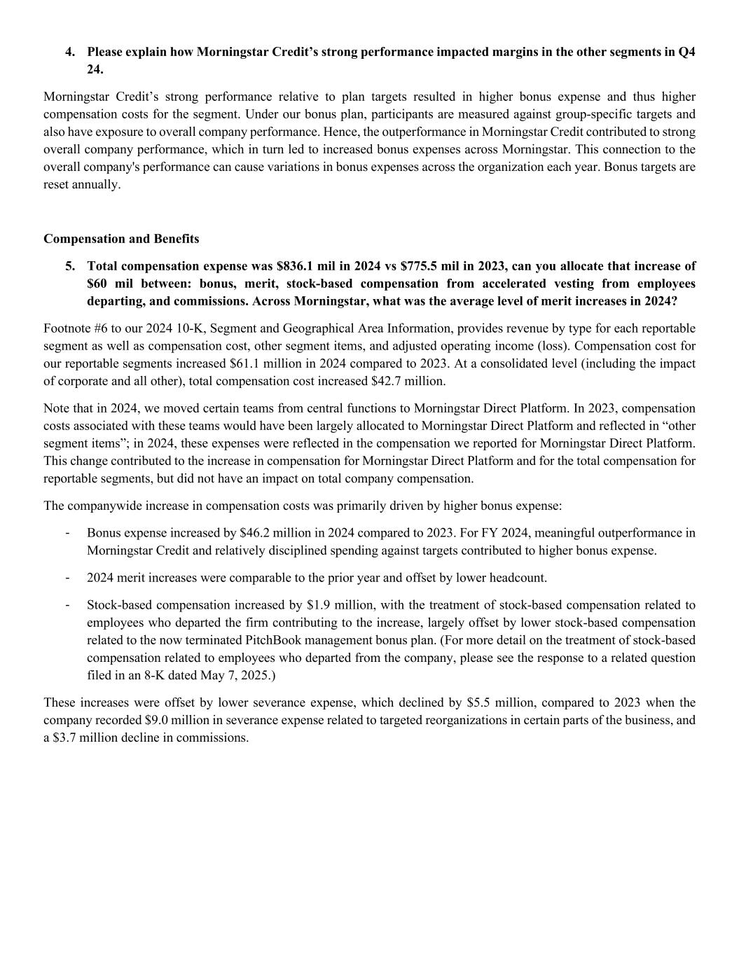 4. Please explain how Morningstar Credit’s strong performance impacted margins in the other segments in Q4 24. Morningstar Credit’s strong performance relative to plan targets resulted in higher bonus expense and thus higher compensation costs for the segment. Under our bonus plan, participants are measured against group-specific targets and also have exposure to overall company performance. Hence, the outperformance in Morningstar Credit contributed to strong overall company performance, which in turn led to increased bonus expenses across Morningstar. This connection to the overall company's performance can cause variations in bonus expenses across the organization each year. Bonus targets are reset annually. Compensation and Benefits 5. Total compensation expense was $836.1 mil in 2024 vs $775.5 mil in 2023, can you allocate that increase of $60 mil between: bonus, merit, stock-based compensation from accelerated vesting from employees departing, and commissions. Across Morningstar, what was the average level of merit increases in 2024? Footnote #6 to our 2024 10-K, Segment and Geographical Area Information, provides revenue by type for each reportable segment as well as compensation cost, other segment items, and adjusted operating income (loss). Compensation cost for our reportable segments increased $61.1 million in 2024 compared to 2023. At a consolidated level (including the impact of corporate and all other), total compensation cost increased $42.7 million. Note that in 2024, we moved certain teams from central functions to Morningstar Direct Platform. In 2023, compensation costs associated with these teams would have been largely allocated to Morningstar Direct Platform and reflected in “other segment items”; in 2024, these expenses were reflected in the compensation we reported for Morningstar Direct Platform. This change contributed to the increase in compensation for Morningstar Direct Platform and for the total compensation for reportable segments, but did not have an impact on total company compensation. The companywide increase in compensation costs was primarily driven by higher bonus expense: - Bonus expense increased by $46.2 million in 2024 compared to 2023. For FY 2024, meaningful outperformance in Morningstar Credit and relatively disciplined spending against targets contributed to higher bonus expense. - 2024 merit increases were comparable to the prior year and offset by lower headcount. - Stock-based compensation increased by $1.9 million, with the treatment of stock-based compensation related to employees who departed the firm contributing to the increase, largely offset by lower stock-based compensation related to the now terminated PitchBook management bonus plan. (For more detail on the treatment of stock-based compensation related to employees who departed from the company, please see the response to a related question filed in an 8-K dated May 7, 2025.) These increases were offset by lower severance expense, which declined by $5.5 million, compared to 2023 when the company recorded $9.0 million in severance expense related to targeted reorganizations in certain parts of the business, and a $3.7 million decline in commissions.