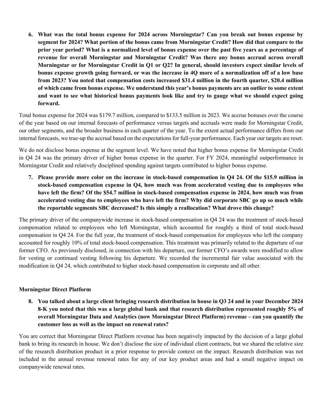 6. What was the total bonus expense for 2024 across Morningstar? Can you break out bonus expense by segment for 2024? What portion of the bonus came from Morningstar Credit? How did that compare to the prior year period? What is a normalized level of bonus expense over the past five years as a percentage of revenue for overall Morningstar and Morningstar Credit? Was there any bonus accrual across overall Morningstar or for Morningstar Credit in Q1 or Q2? In general, should investors expect similar levels of bonus expense growth going forward, or was the increase in 4Q more of a normalization off of a low base from 2023? You noted that compensation costs increased $31.4 million in the fourth quarter, $20.4 million of which came from bonus expense. We understand this year’s bonus payments are an outlier to some extent and want to see what historical bonus payments look like and try to gauge what we should expect going forward. Total bonus expense for 2024 was $179.7 million, compared to $133.5 million in 2023. We accrue bonuses over the course of the year based on our internal forecasts of performance versus targets and accruals were made for Morningstar Credit, our other segments, and the broader business in each quarter of the year. To the extent actual performance differs from our internal forecasts, we true-up the accrual based on the expectations for full-year performance. Each year our targets are reset. We do not disclose bonus expense at the segment level. We have noted that higher bonus expense for Morningstar Credit in Q4 24 was the primary driver of higher bonus expense in the quarter. For FY 2024, meaningful outperformance in Morningstar Credit and relatively disciplined spending against targets contributed to higher bonus expense. 7. Please provide more color on the increase in stock-based compensation in Q4 24. Of the $15.9 million in stock-based compensation expense in Q4, how much was from accelerated vesting due to employees who have left the firm? Of the $54.7 million in stock-based compensation expense in 2024, how much was from accelerated vesting due to employees who have left the firm? Why did corporate SBC go up so much while the reportable segments SBC decreased? Is this simply a reallocation? What drove this change? The primary driver of the companywide increase in stock-based compensation in Q4 24 was the treatment of stock-based compensation related to employees who left Morningstar, which accounted for roughly a third of total stock-based compensation in Q4 24. For the full year, the treatment of stock-based compensation for employees who left the company accounted for roughly 10% of total stock-based compensation. This treatment was primarily related to the departure of our former CFO. As previously disclosed, in connection with his departure, our former CFO’s awards were modified to allow for vesting or continued vesting following his departure. We recorded the incremental fair value associated with the modification in Q4 24, which contributed to higher stock-based compensation in corporate and all other. Morningstar Direct Platform 8. You talked about a large client bringing research distribution in house in Q3 24 and in your December 2024 8-K you noted that this was a large global bank and that research distribution represented roughly 5% of overall Morningstar Data and Analytics (now Morningstar Direct Platform) revenue – can you quantify the customer loss as well as the impact on renewal rates? You are correct that Morningstar Direct Platform revenue has been negatively impacted by the decision of a large global bank to bring its research in house. We don’t disclose the size of individual client contracts, but we shared the relative size of the research distribution product in a prior response to provide context on the impact. Research distribution was not included in the annual revenue renewal rates for any of our key product areas and had a small negative impact on companywide renewal rates.