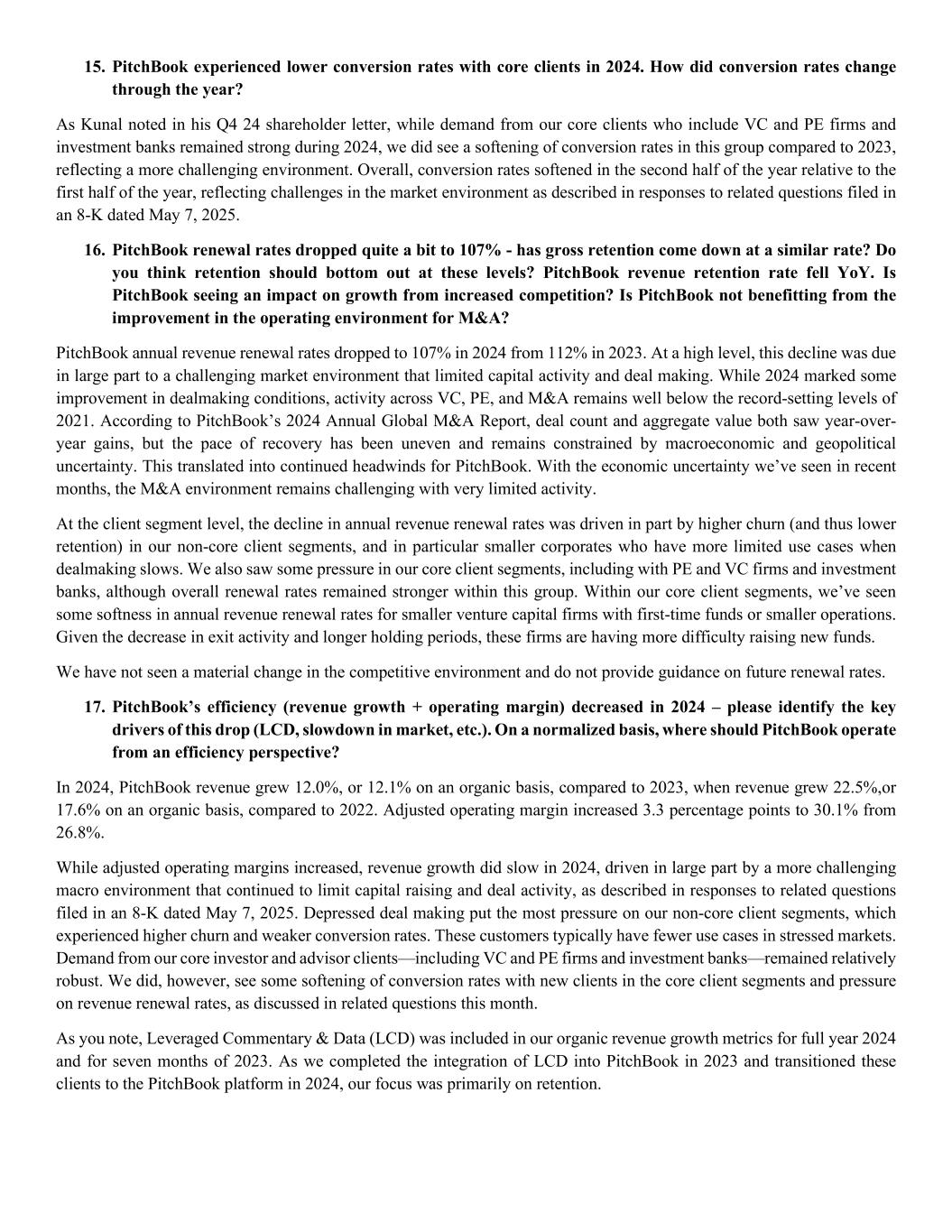 15. PitchBook experienced lower conversion rates with core clients in 2024. How did conversion rates change through the year? As Kunal noted in his Q4 24 shareholder letter, while demand from our core clients who include VC and PE firms and investment banks remained strong during 2024, we did see a softening of conversion rates in this group compared to 2023, reflecting a more challenging environment. Overall, conversion rates softened in the second half of the year relative to the first half of the year, reflecting challenges in the market environment as described in responses to related questions filed in an 8-K dated May 7, 2025. 16. PitchBook renewal rates dropped quite a bit to 107% - has gross retention come down at a similar rate? Do you think retention should bottom out at these levels? PitchBook revenue retention rate fell YoY. Is PitchBook seeing an impact on growth from increased competition? Is PitchBook not benefitting from the improvement in the operating environment for M&A? PitchBook annual revenue renewal rates dropped to 107% in 2024 from 112% in 2023. At a high level, this decline was due in large part to a challenging market environment that limited capital activity and deal making. While 2024 marked some improvement in dealmaking conditions, activity across VC, PE, and M&A remains well below the record-setting levels of 2021. According to PitchBook’s 2024 Annual Global M&A Report, deal count and aggregate value both saw year-over- year gains, but the pace of recovery has been uneven and remains constrained by macroeconomic and geopolitical uncertainty. This translated into continued headwinds for PitchBook. With the economic uncertainty we’ve seen in recent months, the M&A environment remains challenging with very limited activity. At the client segment level, the decline in annual revenue renewal rates was driven in part by higher churn (and thus lower retention) in our non-core client segments, and in particular smaller corporates who have more limited use cases when dealmaking slows. We also saw some pressure in our core client segments, including with PE and VC firms and investment banks, although overall renewal rates remained stronger within this group. Within our core client segments, we’ve seen some softness in annual revenue renewal rates for smaller venture capital firms with first-time funds or smaller operations. Given the decrease in exit activity and longer holding periods, these firms are having more difficulty raising new funds. We have not seen a material change in the competitive environment and do not provide guidance on future renewal rates. 17. PitchBook’s efficiency (revenue growth + operating margin) decreased in 2024 – please identify the key drivers of this drop (LCD, slowdown in market, etc.). On a normalized basis, where should PitchBook operate from an efficiency perspective? In 2024, PitchBook revenue grew 12.0%, or 12.1% on an organic basis, compared to 2023, when revenue grew 22.5%,or 17.6% on an organic basis, compared to 2022. Adjusted operating margin increased 3.3 percentage points to 30.1% from 26.8%. While adjusted operating margins increased, revenue growth did slow in 2024, driven in large part by a more challenging macro environment that continued to limit capital raising and deal activity, as described in responses to related questions filed in an 8-K dated May 7, 2025. Depressed deal making put the most pressure on our non-core client segments, which experienced higher churn and weaker conversion rates. These customers typically have fewer use cases in stressed markets. Demand from our core investor and advisor clients—including VC and PE firms and investment banks—remained relatively robust. We did, however, see some softening of conversion rates with new clients in the core client segments and pressure on revenue renewal rates, as discussed in related questions this month. As you note, Leveraged Commentary & Data (LCD) was included in our organic revenue growth metrics for full year 2024 and for seven months of 2023. As we completed the integration of LCD into PitchBook in 2023 and transitioned these clients to the PitchBook platform in 2024, our focus was primarily on retention.