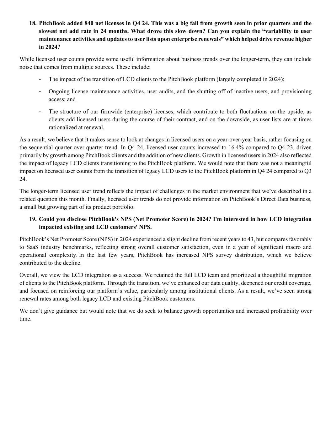 18. PitchBook added 840 net licenses in Q4 24. This was a big fall from growth seen in prior quarters and the slowest net add rate in 24 months. What drove this slow down? Can you explain the “variability to user maintenance activities and updates to user lists upon enterprise renewals” which helped drive revenue higher in 2024? While licensed user counts provide some useful information about business trends over the longer-term, they can include noise that comes from multiple sources. These include: - The impact of the transition of LCD clients to the PitchBook platform (largely completed in 2024); - Ongoing license maintenance activities, user audits, and the shutting off of inactive users, and provisioning access; and - The structure of our firmwide (enterprise) licenses, which contribute to both fluctuations on the upside, as clients add licensed users during the course of their contract, and on the downside, as user lists are at times rationalized at renewal. As a result, we believe that it makes sense to look at changes in licensed users on a year-over-year basis, rather focusing on the sequential quarter-over-quarter trend. In Q4 24, licensed user counts increased to 16.4% compared to Q4 23, driven primarily by growth among PitchBook clients and the addition of new clients. Growth in licensed users in 2024 also reflected the impact of legacy LCD clients transitioning to the PitchBook platform. We would note that there was not a meaningful impact on licensed user counts from the transition of legacy LCD users to the PitchBook platform in Q4 24 compared to Q3 24. The longer-term licensed user trend reflects the impact of challenges in the market environment that we’ve described in a related question this month. Finally, licensed user trends do not provide information on PitchBook’s Direct Data business, a small but growing part of its product portfolio. 19. Could you disclose PitchBook's NPS (Net Promoter Score) in 2024? I'm interested in how LCD integration impacted existing and LCD customers' NPS. PitchBook’s Net Promoter Score (NPS) in 2024 experienced a slight decline from recent years to 43, but compares favorably to SaaS industry benchmarks, reflecting strong overall customer satisfaction, even in a year of significant macro and operational complexity. In the last few years, PitchBook has increased NPS survey distribution, which we believe contributed to the decline. Overall, we view the LCD integration as a success. We retained the full LCD team and prioritized a thoughtful migration of clients to the PitchBook platform. Through the transition, we’ve enhanced our data quality, deepened our credit coverage, and focused on reinforcing our platform’s value, particularly among institutional clients. As a result, we’ve seen strong renewal rates among both legacy LCD and existing PitchBook customers. We don’t give guidance but would note that we do seek to balance growth opportunities and increased profitability over time.