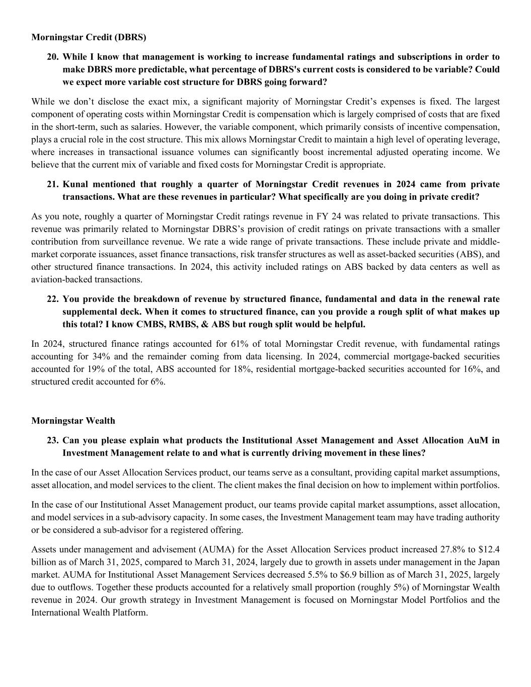 Morningstar Credit (DBRS) 20. While I know that management is working to increase fundamental ratings and subscriptions in order to make DBRS more predictable, what percentage of DBRS's current costs is considered to be variable? Could we expect more variable cost structure for DBRS going forward? While we don’t disclose the exact mix, a significant majority of Morningstar Credit’s expenses is fixed. The largest component of operating costs within Morningstar Credit is compensation which is largely comprised of costs that are fixed in the short-term, such as salaries. However, the variable component, which primarily consists of incentive compensation, plays a crucial role in the cost structure. This mix allows Morningstar Credit to maintain a high level of operating leverage, where increases in transactional issuance volumes can significantly boost incremental adjusted operating income. We believe that the current mix of variable and fixed costs for Morningstar Credit is appropriate. 21. Kunal mentioned that roughly a quarter of Morningstar Credit revenues in 2024 came from private transactions. What are these revenues in particular? What specifically are you doing in private credit? As you note, roughly a quarter of Morningstar Credit ratings revenue in FY 24 was related to private transactions. This revenue was primarily related to Morningstar DBRS’s provision of credit ratings on private transactions with a smaller contribution from surveillance revenue. We rate a wide range of private transactions. These include private and middle- market corporate issuances, asset finance transactions, risk transfer structures as well as asset-backed securities (ABS), and other structured finance transactions. In 2024, this activity included ratings on ABS backed by data centers as well as aviation-backed transactions. 22. You provide the breakdown of revenue by structured finance, fundamental and data in the renewal rate supplemental deck. When it comes to structured finance, can you provide a rough split of what makes up this total? I know CMBS, RMBS, & ABS but rough split would be helpful. In 2024, structured finance ratings accounted for 61% of total Morningstar Credit revenue, with fundamental ratings accounting for 34% and the remainder coming from data licensing. In 2024, commercial mortgage-backed securities accounted for 19% of the total, ABS accounted for 18%, residential mortgage-backed securities accounted for 16%, and structured credit accounted for 6%. Morningstar Wealth 23. Can you please explain what products the Institutional Asset Management and Asset Allocation AuM in Investment Management relate to and what is currently driving movement in these lines? In the case of our Asset Allocation Services product, our teams serve as a consultant, providing capital market assumptions, asset allocation, and model services to the client. The client makes the final decision on how to implement within portfolios. In the case of our Institutional Asset Management product, our teams provide capital market assumptions, asset allocation, and model services in a sub-advisory capacity. In some cases, the Investment Management team may have trading authority or be considered a sub-advisor for a registered offering. Assets under management and advisement (AUMA) for the Asset Allocation Services product increased 27.8% to $12.4 billion as of March 31, 2025, compared to March 31, 2024, largely due to growth in assets under management in the Japan market. AUMA for Institutional Asset Management Services decreased 5.5% to $6.9 billion as of March 31, 2025, largely due to outflows. Together these products accounted for a relatively small proportion (roughly 5%) of Morningstar Wealth revenue in 2024. Our growth strategy in Investment Management is focused on Morningstar Model Portfolios and the International Wealth Platform.