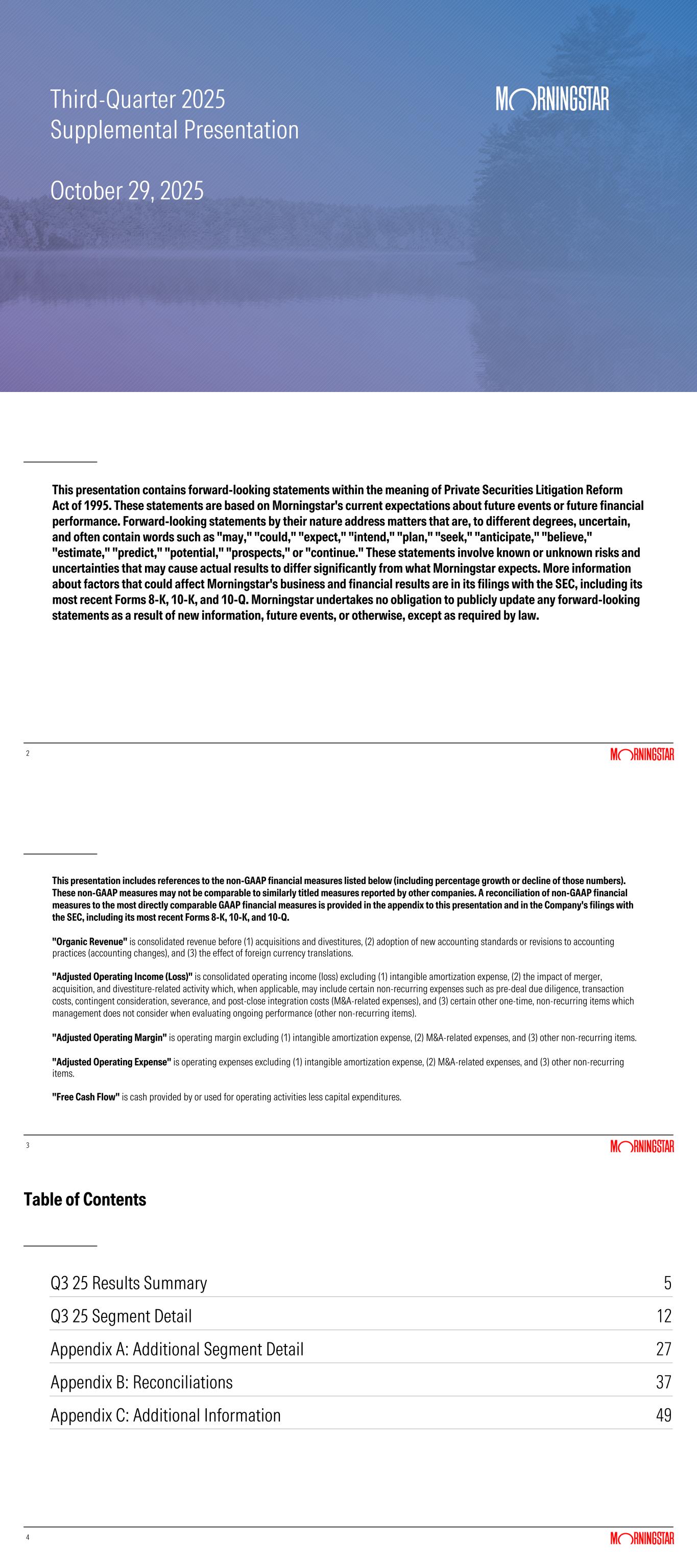 To supplement Morningstar’s condensed consolidated financial statements presented in accordance with US Generally Accepted Accounting Principles (GAAP), Morningstar uses the following measures considered as non-GAAP by the SEC, including: