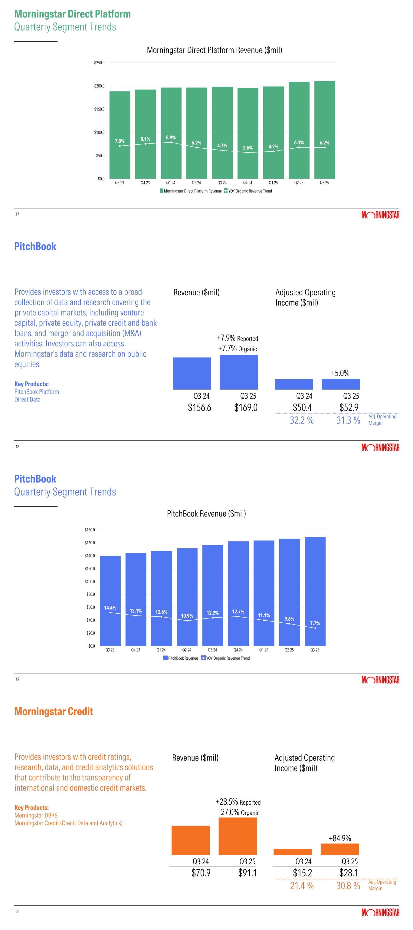 Revenue increased 8.4% to $617.4 million on a reported basis and 9.0% on an organic basis versus the prior-year period. Morningstar Credit, Morningstar Direct Platform, and PitchBook were the largest contributors to reported and organic revenue growth.