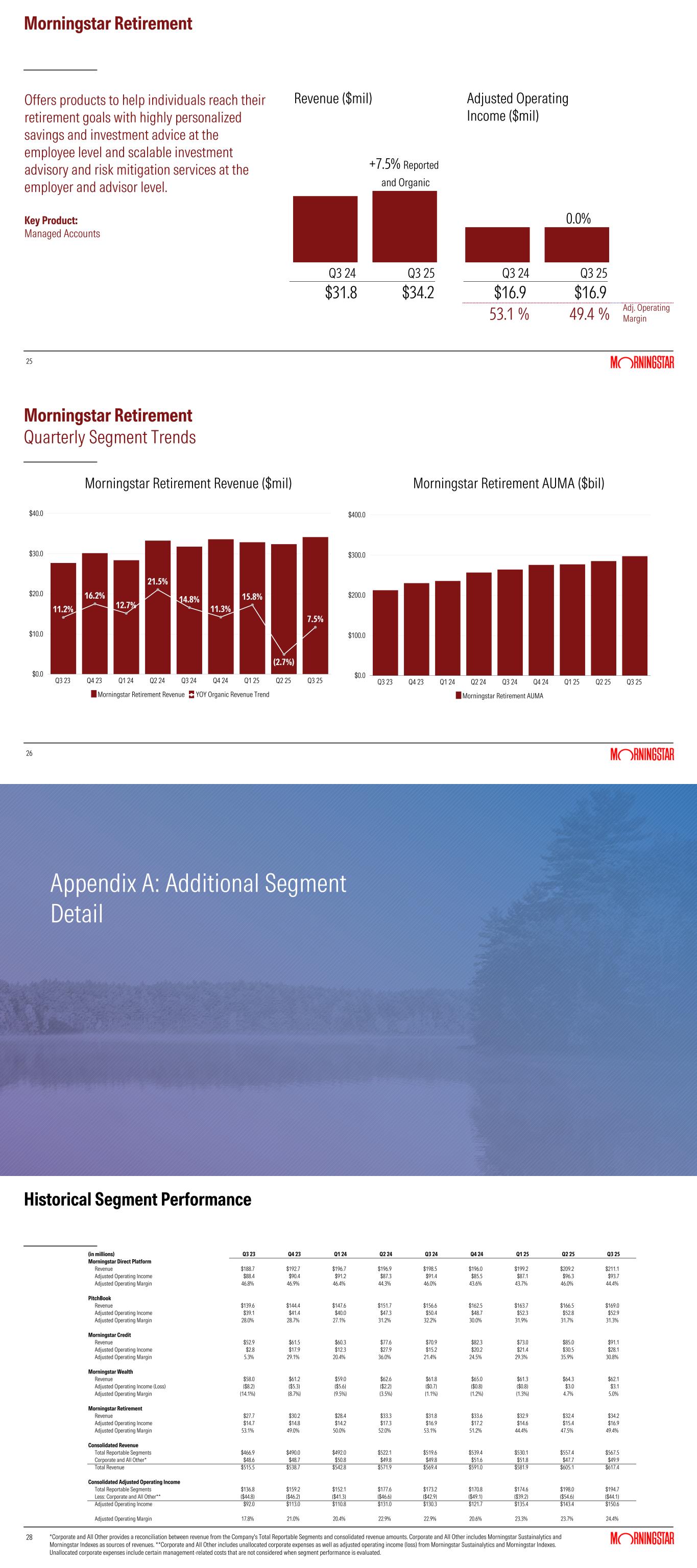 Morningstar Retirement contributed $34.2 million to consolidated revenue and $2.4 million to consolidated revenue growth. Revenue increased 7.5% on a reported and organic basis. AUMA increased 12.6% to $297.8 billion compared with the prior-year period, primarily due to market gains. Net inflows also contributed to higher AUMA, supported by strong growth in traditional and Advisor Managed Accounts.