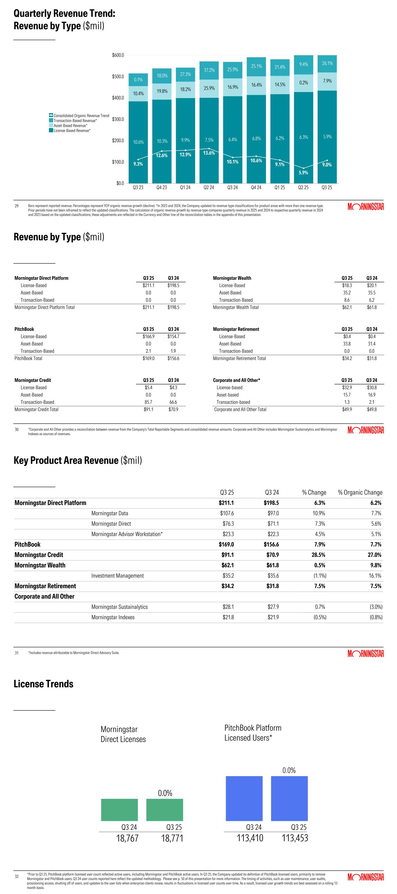 PitchBook contributed $169.0 million to consolidated revenue and $12.4 million to consolidated revenue growth, with revenue increasing 7.9% on a reported and 7.7% on an organic basis. Revenue growth was primarily driven by the PitchBook platform with contributions from the small-but-growing direct data business. PitchBook platform growth drivers were consistent with recent quarters with increased revenue driven by PitchBook's core investor and advisor client segments, including private equity, credit, and investment banks, partially offset by continued softness in the corporate client segment, especially among smaller firms with more limited use cases during periods of slower deal activity.