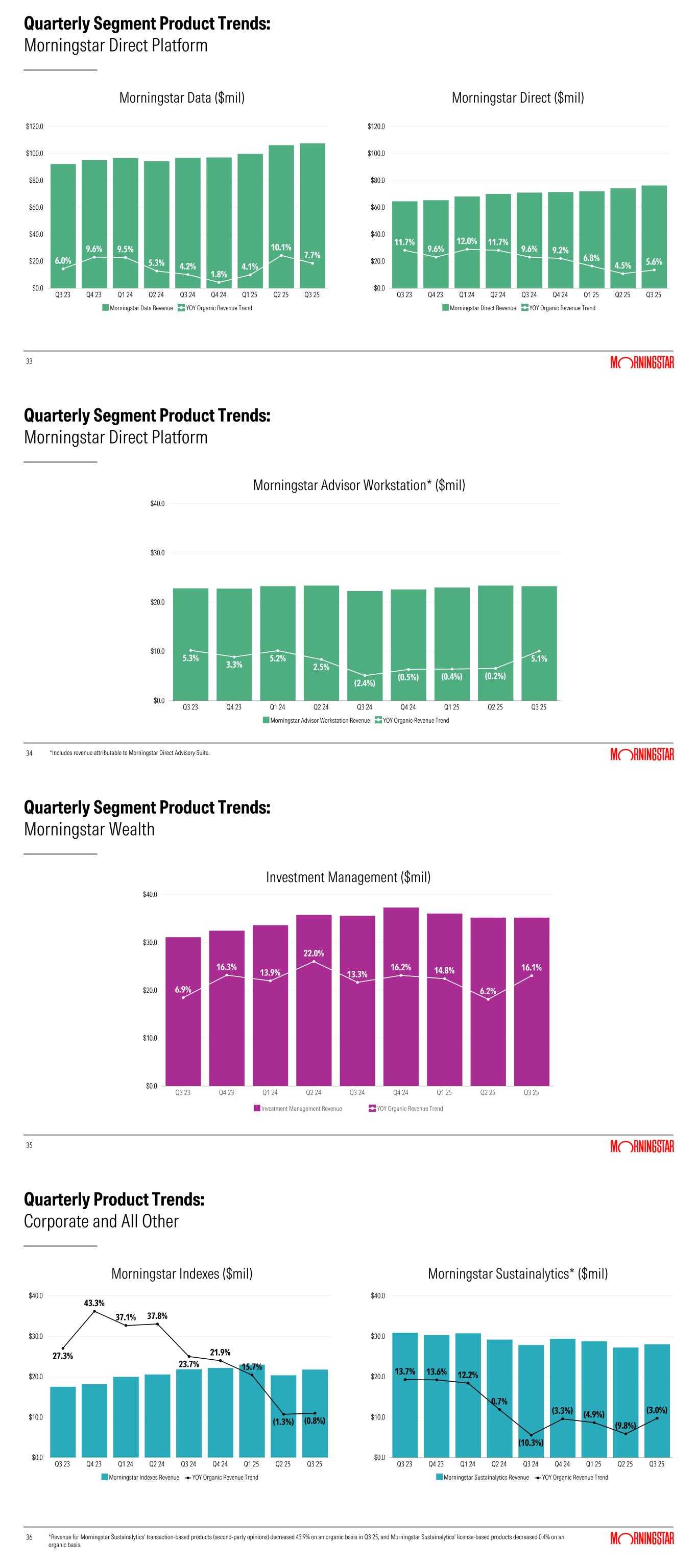 Revenue attributable to Corporate and All Other contributed $49.9 million to consolidated revenue and $0.1 million to consolidated revenue growth, with reported revenue increasing 0.2% compared to the prior-year period. Morningstar Indexes revenue declined modestly, reflecting lower investable product revenue driven by outflows and lower AUMA for certain higher margin products. Reported revenue from Morningstar Sustainalytics was relatively flat compared to the prior-year period and declined modestly on an organic basis.