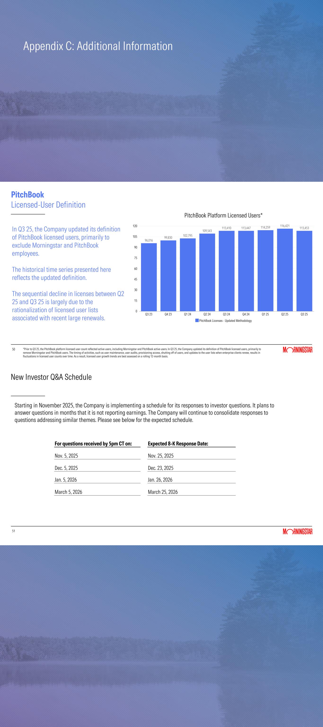 Licensed user counts were flat compared to the prior-year period, reflecting the addition of new logos offset by churn and including the impact of the rationalization of user lists associated with recent large enterprise renewals. In the quarter, the Company updated its definition of licensed user counts, primarily to exclude Morningstar and PitchBook employees. The change is discussed in more detail on p. 50 of the quarterly supplemental deck.