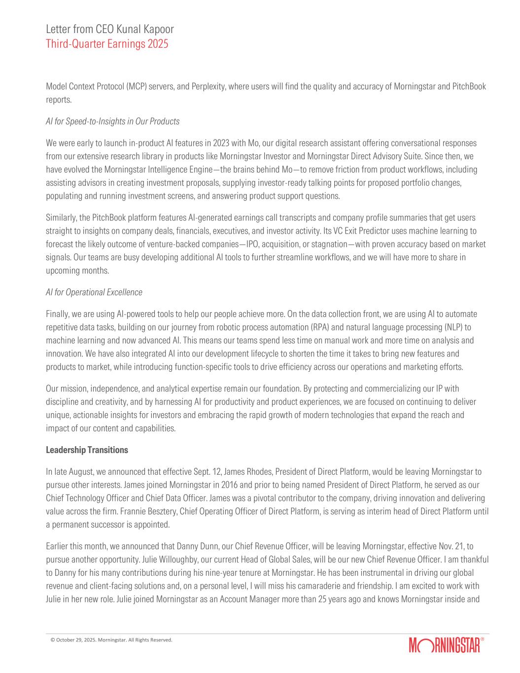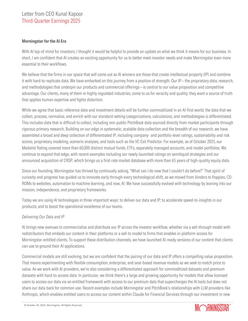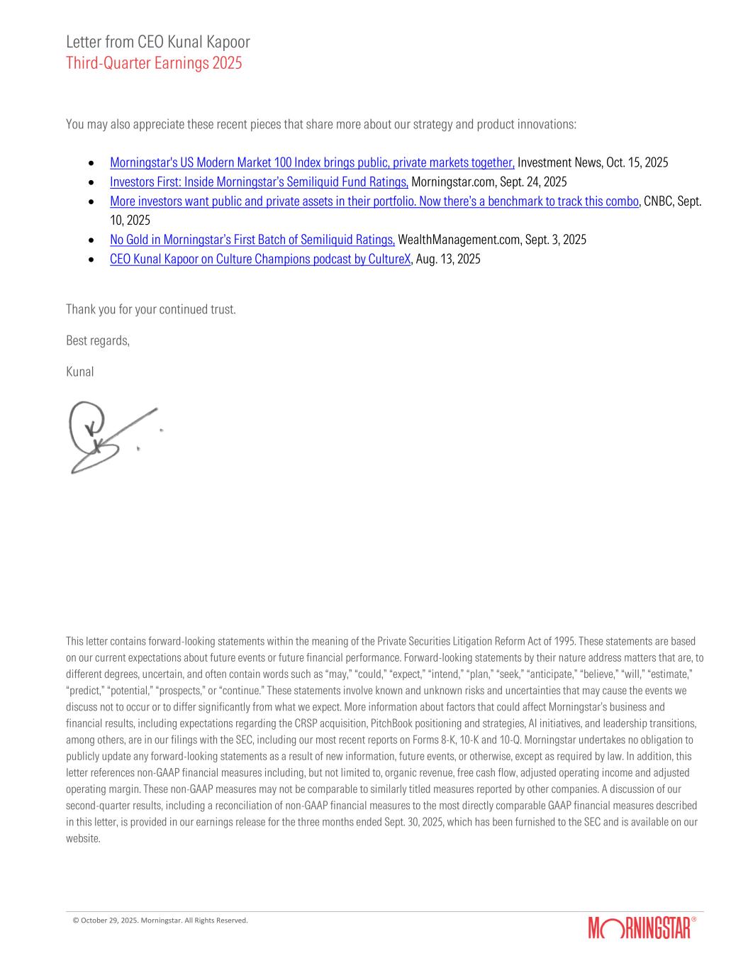The Company's quarterly shareholder letter provides more context on its quarterly results and business performance and can be found at shareholders.morningstar.com.