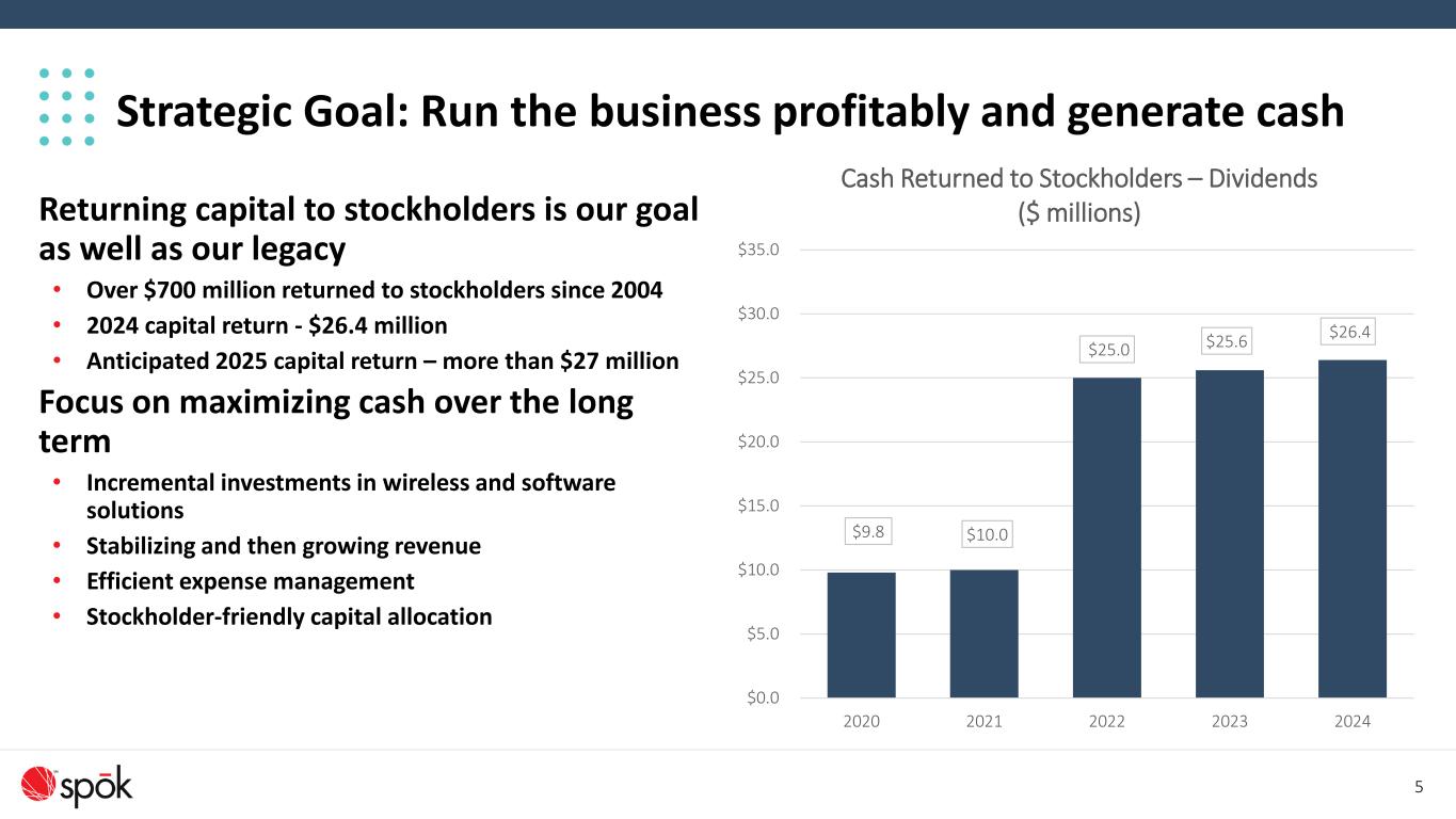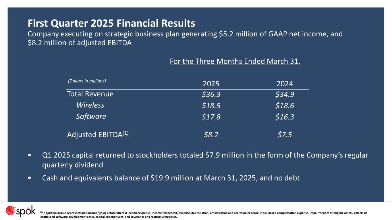 First Quarter 2025 Financial Results Company executing on strategic business plan generating $5.2 million of GAAP net income, and $8.2 million of adjusted EBITDA 23 For the Three Months Ended March 31, 2025 2024 Total Revenue $36.3 $34.9 Wireless $18.5 $18.6 Software $17.8 $16.3 Adjusted EBITDA(1) $8.2 $7.5 • Q1 2025 capital returned to stockholders totaled $7.9 million in the form of the Company’s regular quarterly dividend • Cash and equivalents balance of $19.9 million at March 31, 2025, and no debt (Dollars in millions) (1) Adjusted EBITDA represents net income/(loss) before interest income/expense, income tax benefit/expense, depreciation, amortization and accretion expense, stock-based compensation expense, impairment of intangible assets, effects of capitalized software development costs, capital expenditures, and severance and restructuring costs.