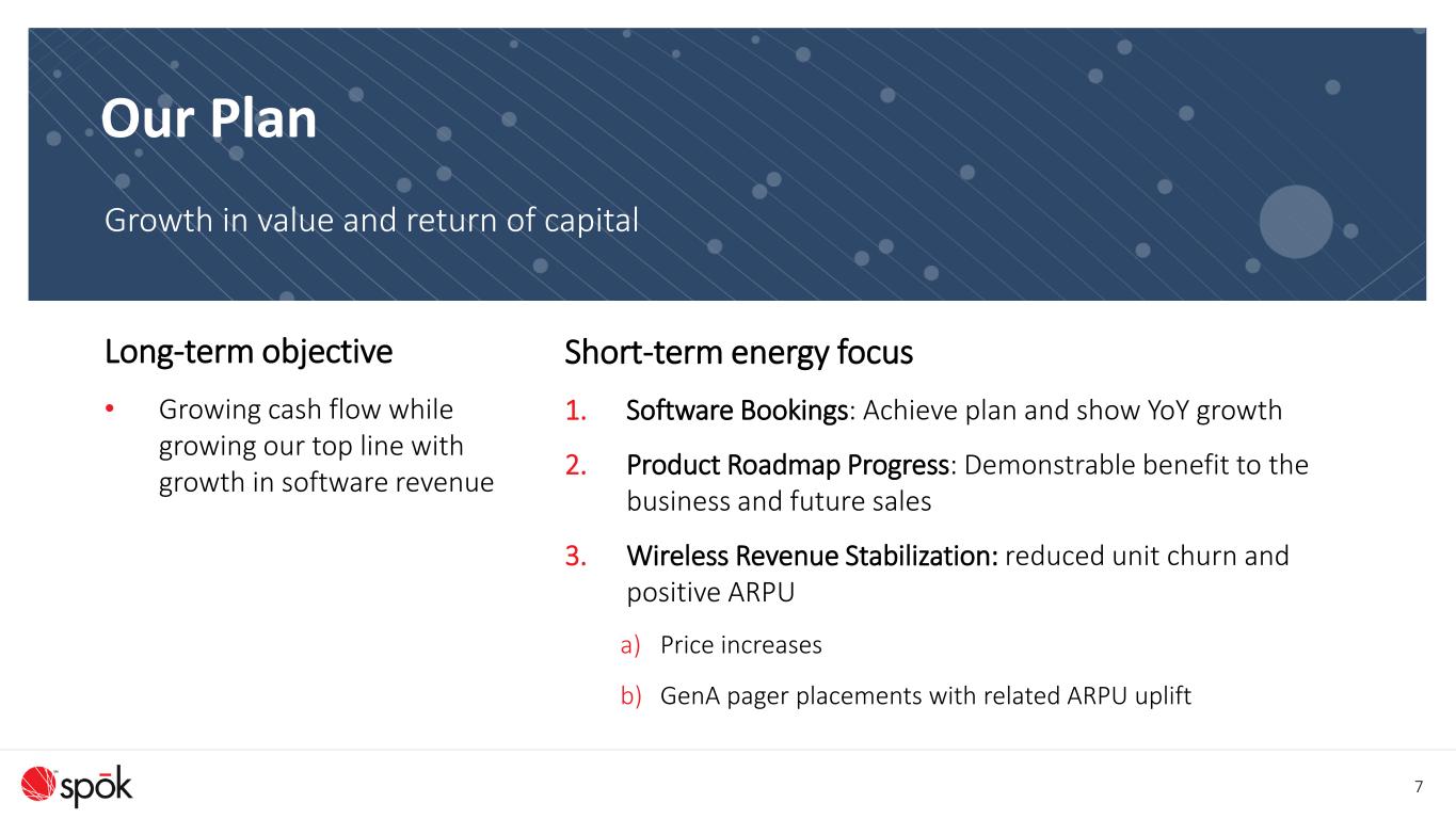 Key Investment Highlights Significant Annual Free Cash Flow Generation and Strong Balance Sheet Substantial cash flow being returned to shareholders through considerable quarterly dividend, no debt Software Operations Bookings Momentum, Large Identified Pipeline Expanding software pipeline converting to growth in sales Stable Re-occurring Software Maintenance and Wireless Segment Revenue 80+% of Spok’s revenue is re-occurring in nature due to maintenance revenue from contact center and wireless paging revenue Long-standing Customer Relationships with the “Best Hospitals” Nine of the Top 10 U.S. News & World Report’s Children’s Hospitals and 18 of the Top 20 Adult Hospitals are Spok customers, with an average tenure of 26 years 5 2 3 1 Clear Roadmap Developed to Execute Strategy Multiple avenues of organic and inorganic growth across new and existing customers and product development 4 4