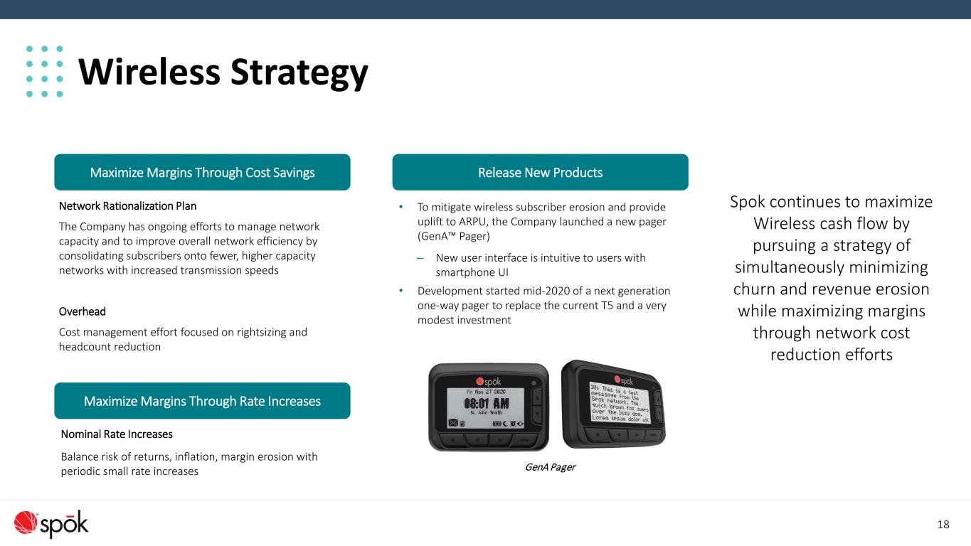 Software Strategy • With Spok Care Connect, the contact center is the base, with products like Messenger and Spok Mobile® sold as accessories to our contact center solution, which are all on-premise solutions Wireless Integration Spok Care Connect… …Product Direction • With the pivot from Spok Go, renewed work on enhancements of the Product suite to drive meaningful value for customers while taking advantage of the valuable franchise built with large hospitals • Development of a hosted version of Spok Care Connect Suite to better serve the smaller sized hospitals • Over time, development of more efficient architecture for our Spok Care Connect solutions to drive efficiency across the entire organization, including Product & Development, Professional Services and Customer Support • Wireless is compatible with Spok Care Connect, providing a comprehensive communication strategy for hospitals • Use smartphone, Wi-Fi phone, or tablet to access the organization’s directory and send secure messages to any staff member, including the right on-call clinicians • Support a wide variety of smartphones, pagers, and other devices for maximum flexibility • Spok has been successful in selling upgrades and multi-year engagements to lock in our Blue Chip customer base for the long haul • The core services such as the directory, on-call scheduling, and message routing are embedded within all the contact center solutions 17