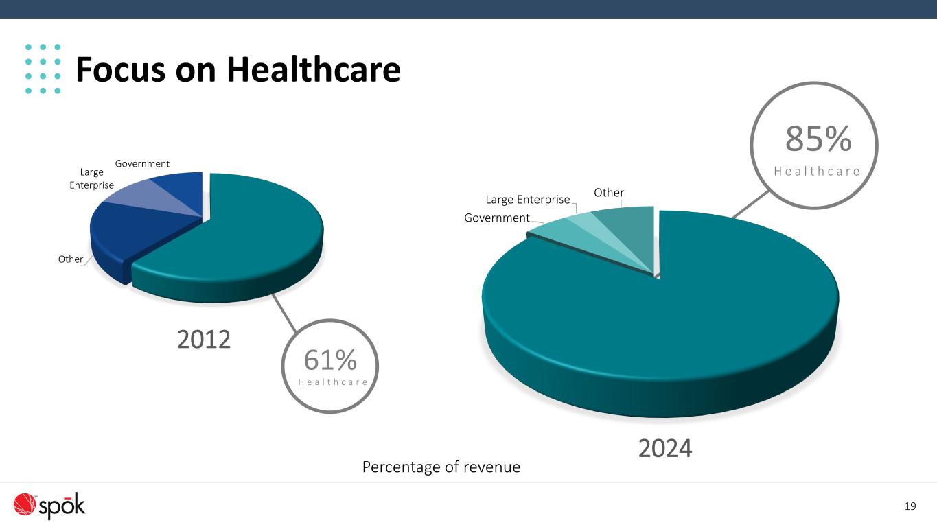 61% H e a l t h c a r e Other Large Enterprise Government 2012 19 Focus on Healthcare 85% H e a l t h c a r e Government Large Enterprise Other 2024 Percentage of revenue