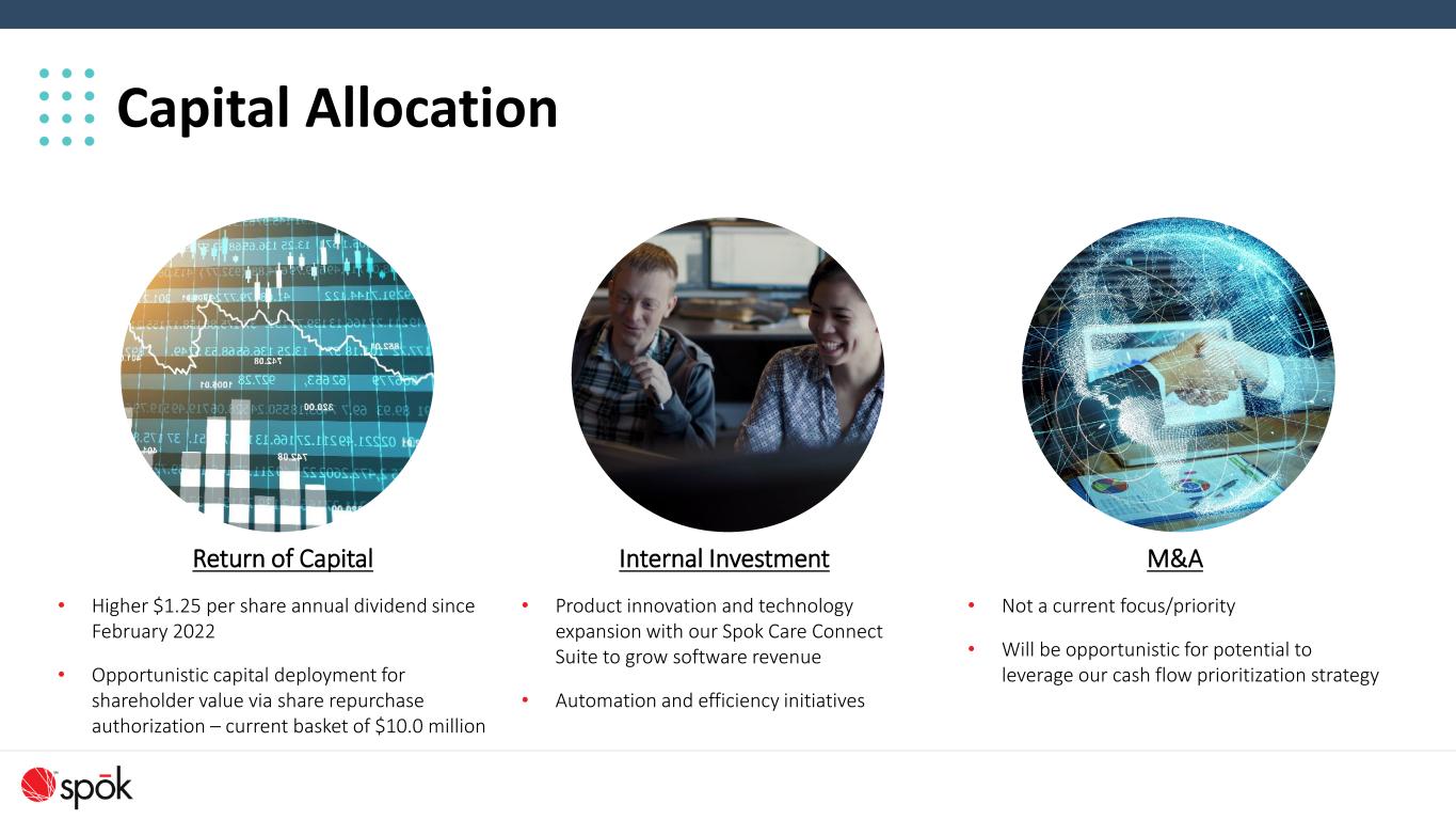 Capital Allocation Return of Capital • Higher $1.25 per share annual dividend since February 2022 • Opportunistic capital deployment for shareholder value via share repurchase authorization – current basket of $10.0 million M&A • Not a current focus/priority • Will be opportunistic for potential to leverage our cash flow prioritization strategy Internal Investment • Product innovation and technology expansion with our Spok Care Connect Suite to grow software revenue • Automation and efficiency initiatives