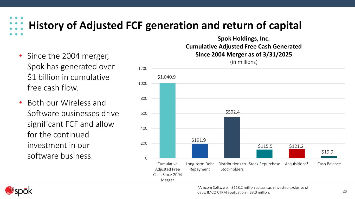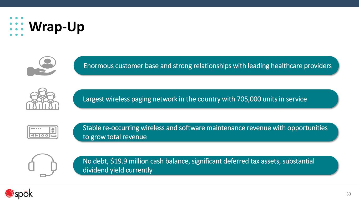 29 History of Adjusted FCF generation and return of capital • Since the 2004 merger, Spok has generated over $1 billion in cumulative free cash flow. • Both our Wireless and Software businesses drive significant FCF and allow for the continued investment in our software business. 29 0 200 400 600 800 1000 1200 Cumulative Adjusted Free Cash Since 2004 Merger Long-term Debt Repayment Distributions to Stockholders Stock Repurchase Acquisitions* Cash Balance $1,040.9 Spok Holdings, Inc. Cumulative Adjusted Free Cash Generated Since 2004 Merger as of 3/31/2025 (in millions) $191.9 $592.4 $115.5 $121.2 $19.9 *Amcom Software = $118.2 million actual cash invested exclusive of debt; IMCO CTRM application = $3.0 million.