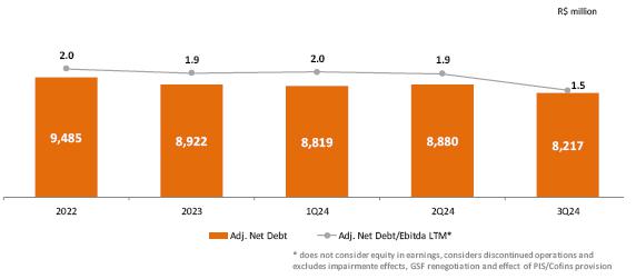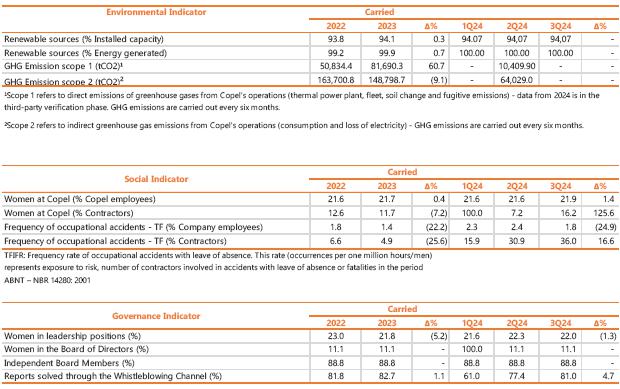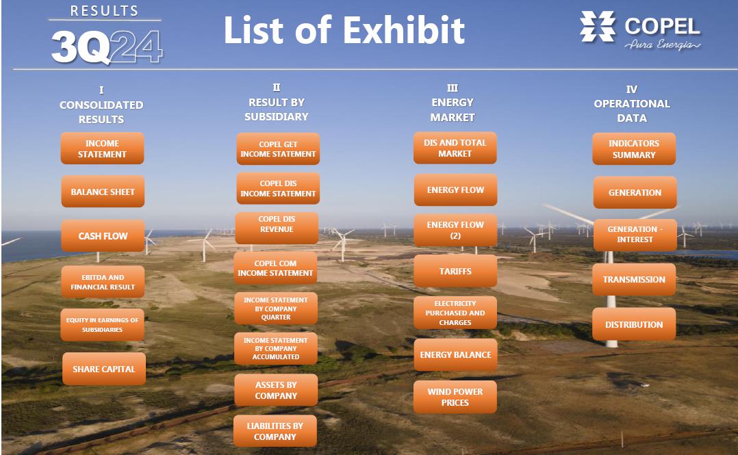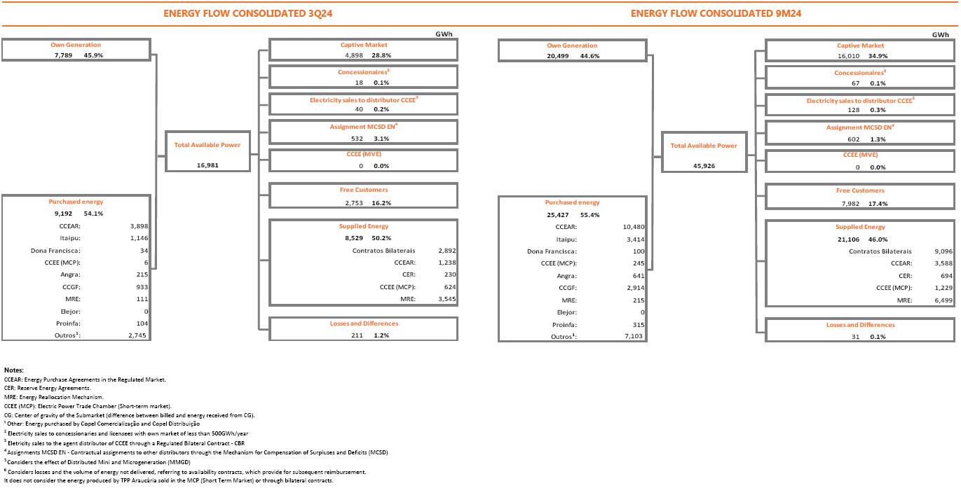 | 1 Proportional to Copel's interest in the project. Values referring to the 2023/2024 cycle, effective from July 1, 2024, according to REH 3.348/2024 - Technical Note No. 105/2024 – STR/ANEEL, of July 09, 2024. Considers investments that came into operation until 09/30/2024. ² Considers double circuit sections (circuits that share the same transmission tower). ³ Contract renewed according to Law 12,783/13. The O&M portion is part of the RBSE, under the terms of the Law. It will be received until the end of the concession (Jan/2043). The value of the APR for the 2024-2025 cycle, excluding the RBSE, according to REH 3,3348/2024, is R$ 148.3 million. This amount refers to additional RAP for reinforcements and improvements, in effect when REH 3,348/2024 was published. 4 As of 10.31.2018, the APR was reduced by 50%. 5 The construction of 38 km of sectioning lines was foreseen in the implementation of the Andirá Leste and Medianeira SEs, 2 km of which for Contract 060/2001 and 36 km for LTs that do not belong to Copel GeT, which, despite being included in the APR, in reason for the investment made, will not be added to Copel's assets. 6 As of 07/09/2021, the APR was reduced by 50%. 7 Consolidated Result. 8 Equity Income. |