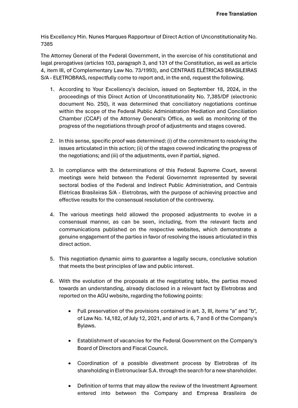 His Excellency Min. Nunes Marques Rapporteur of Direct Action of Unconstitutionality No. 7385 The Attorney General of the Federal Government, in the exercise of his constitutional and legal prerogatives (articles 103, paragraph 3, and 131 of the Constitution, as well as article 4, item III, of Complementary Law No. 73/1993), and CENTRAIS ELÉTRICAS BRASILEIRAS S/A - ELETROBRAS, respectfully come to report and, in the end, request the following. 1. According to Your Excellency's decision, issued on September 18, 2024, in the proceedings of this Direct Action of Unconstitutionality No. 7,385/DF (electronic document No. 250), it was determined that conciliatory negotiations continue within the scope of the Federal Public Administration Mediation and Conciliation Chamber (CCAF) of the Attorney General's Office, as well as monitoring of the progress of the negotiations through proof of adjustments and stages covered. 2. In this sense, specific proof was determined: (i) of the commitment to resolving the issues articulated in this action; (ii) of the stages covered indicating the progress of the negotiations; and (iii) of the adjustments, even if partial, signed. 3. In compliance with the determinations of this Federal Supreme Court, several meetings were held between the Federal Governemnt represented by several sectoral bodies of the Federal and Indirect Public Administration, and Centrais Elétricas Brasileiras S/A - Eletrobras, with the purpose of achieving proactive and effective results for the consensual resolution of the controversy. 4. The various meetings held allowed the proposed adjustments to evolve in a consensual manner, as can be seen, including, from the relevant facts and communications published on the respective websites, which demonstrate a genuine engagement of the parties in favor of resolving the issues articulated in this direct action. 5. This negotiation dynamic aims to guarantee a legally secure, conclusive solution that meets the best principles of law and public interest. 6. With the evolution of the proposals at the negotiating table, the parties moved towards an understanding, already disclosed in a relevant fact by Eletrobras and reported on the AGU website, regarding the following points: • Full preservation of the provisions contained in art. 3, III, items "a" and "b", of Law No. 14,182, of July 12, 2021, and of arts. 6, 7 and 8 of the Company's Bylaws. • Establishment of vacancies for the Federal Government on the Company's Board of Directors and Fiscal Council. • Coordination of a possible divestment process by Eletrobras of its shareholding in Eletronuclear S.A. through the search for a new shareholder.