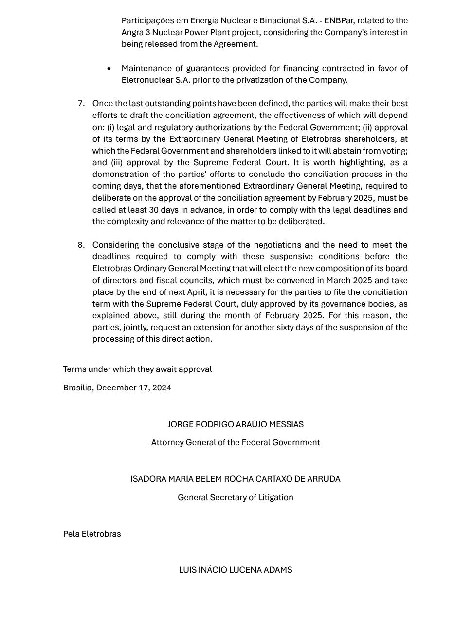 • Definition of terms that may allow the review of the Investment Agreement entered into between the Company and Empresa Brasileira de Participações em Energia Nuclear e Binacional S.A. - ENBPar, related to the Angra 3 Nuclear Power Plant project, considering the Company's interest in being released from the Agreement. • Maintenance of guarantees provided for financing contracted in favor of Eletronuclear S.A. prior to the privatization of the Company. 7. Once the last outstanding points have been defined, the parties will make their best efforts to draft the conciliation agreement, the effectiveness of which will depend on: (i) legal and regulatory authorizations by the Federal Government; (ii) approval of its terms by the Extraordinary General Meeting of Eletrobras shareholders, at which the Federal Government and shareholders linked to it will abstain from voting; and (iii) approval by the Supreme Federal Court. It is worth highlighting, as a demonstration of the parties' efforts to conclude the conciliation process in the coming days, that the aforementioned Extraordinary General Meeting, required to deliberate on the approval of the conciliation agreement by February 2025, must be called at least 30 days in advance, in order to comply with the legal deadlines and the complexity and relevance of the matter to be deliberated. 8. Considering the conclusive stage of the negotiations and the need to meet the deadlines required to comply with these suspensive conditions before the Eletrobras Ordinary General Meeting that will elect the new composition of its board of directors and fiscal councils, which must be convened in March 2025 and take place by the end of next April, it is necessary for the parties to file the conciliation term with the Supreme Federal Court, duly approved by its governance bodies, as explained above, still during the month of February 2025. For this reason, the parties, jointly, request an extension for another sixty days of the suspension of the processing of this direct action. Terms under which they await approval Brasilia, December 17, 2024 JORGE RODRIGO ARAÚJO MESSIAS Attorney General of the Federal Government ISADORA MARIA BELEM ROCHA CARTAXO DE ARRUDA General Secretary of Litigation Pela Eletrobras LUIS INÁCIO LUCENA ADAMS Pursuant to the requirements of the Securities Exchange Act of 1934, the registrant has duly caused this report to be signed on its behalf by the undersigned, thereunto duly authorized.