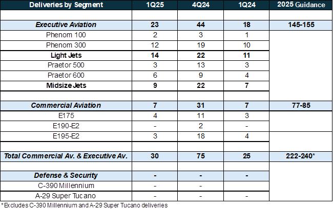 The company's guidance foresees between 77 and 85 deliveries in Commercial Aviation in 2025 (midpoint 10% higher in the annual comparison), and 145 to 155 in Executive Aviation (midpoint 15% higher year over year).