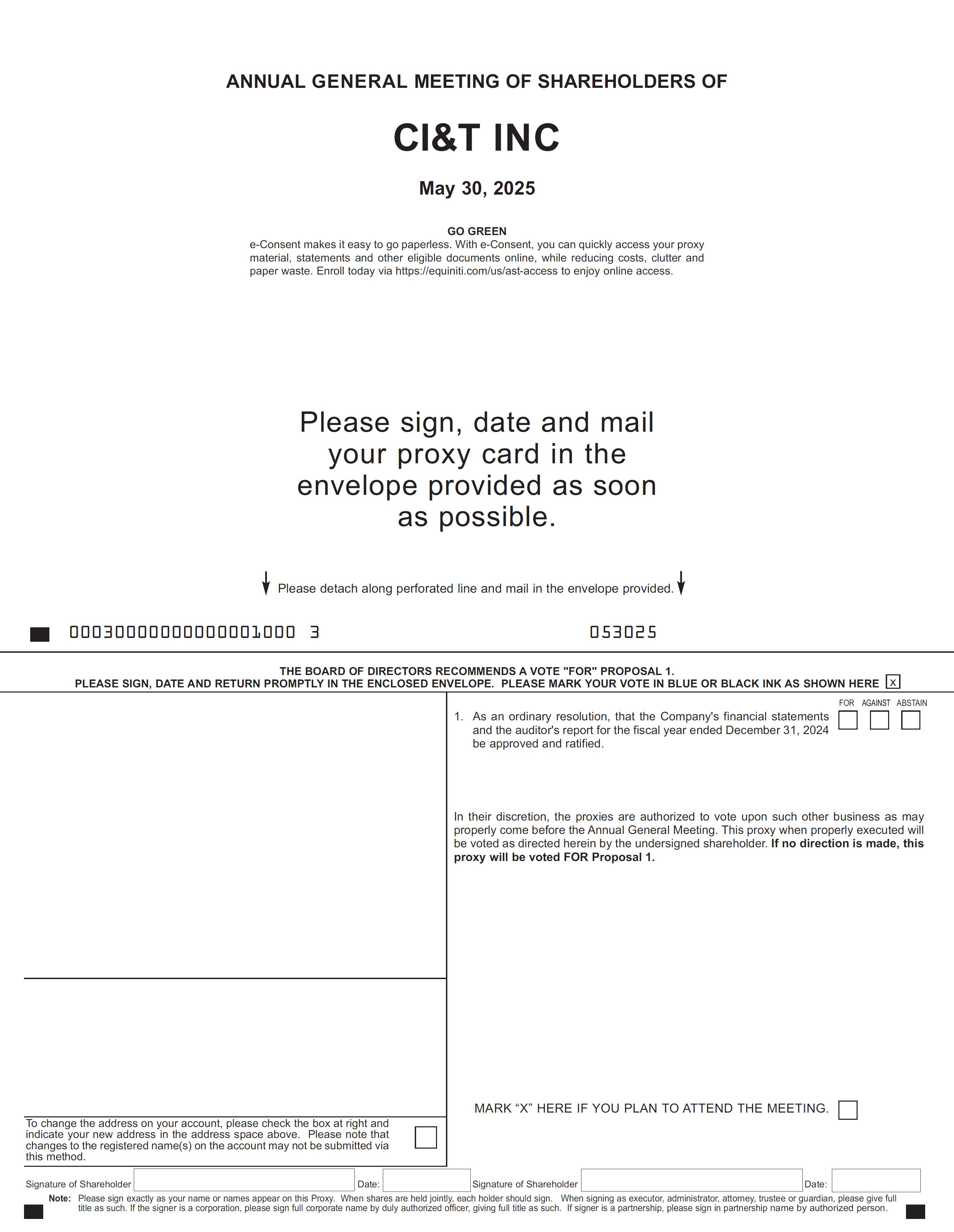 If you wish to attend the AGM virtually, please contact our Investor Relations Department at investors@ciandt.com to request an access code. We may request certain information to confirm your eligibility as a shareholder or proxy prior to issuing the code.