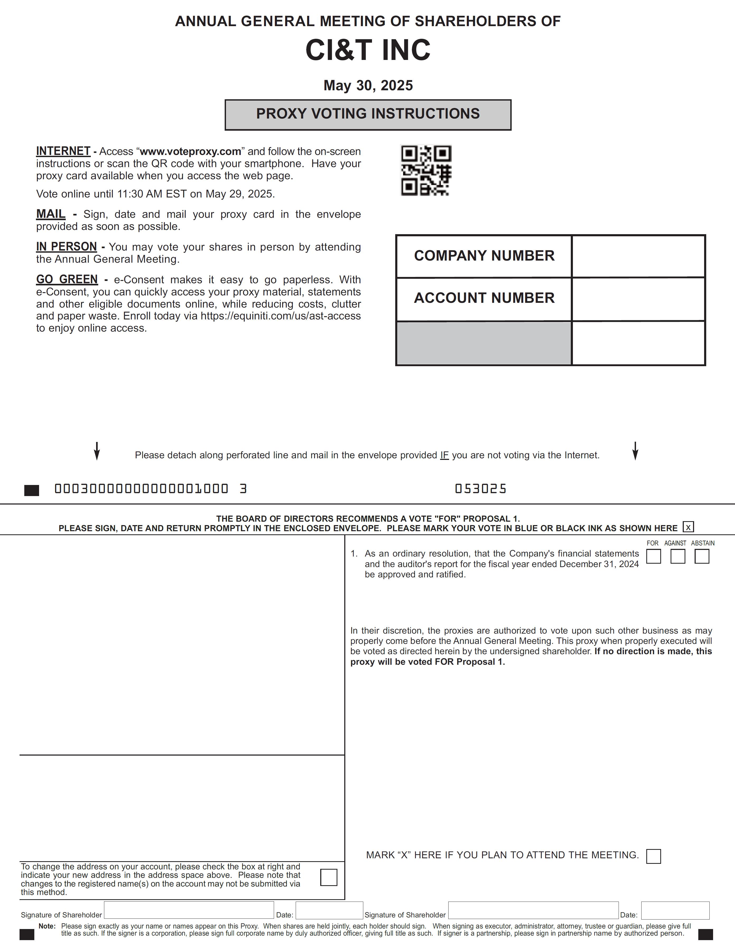 The Board recommends that you vote “FOR” the resolution at the AGM. Your vote is very important to us! Whether or not you plan to attend, please take a moment to complete, sign, and return the proxy card included with this notice by following the instructions provided.