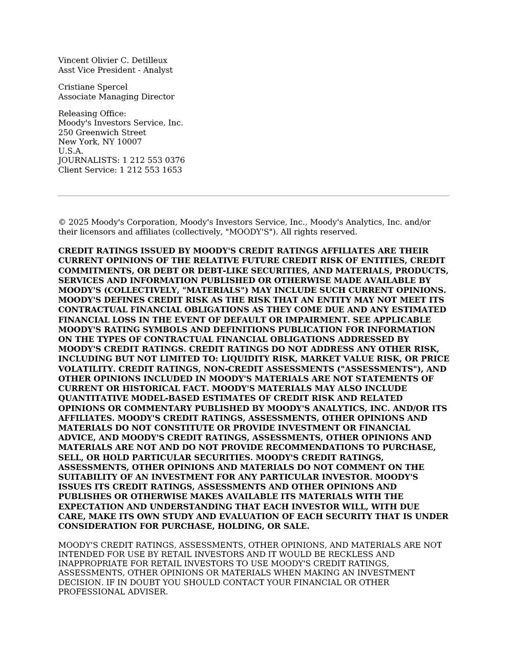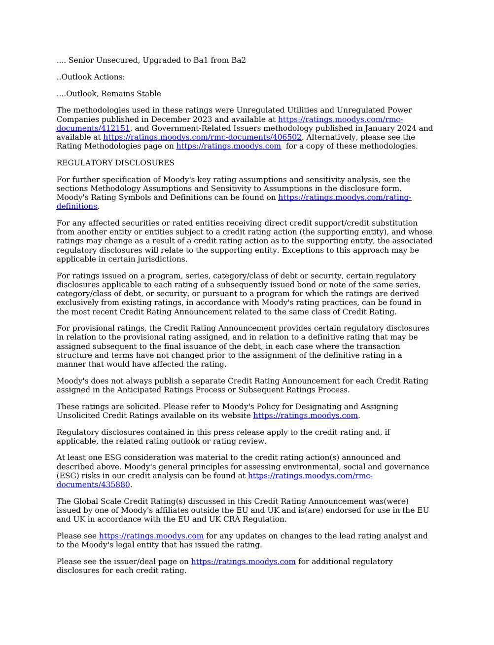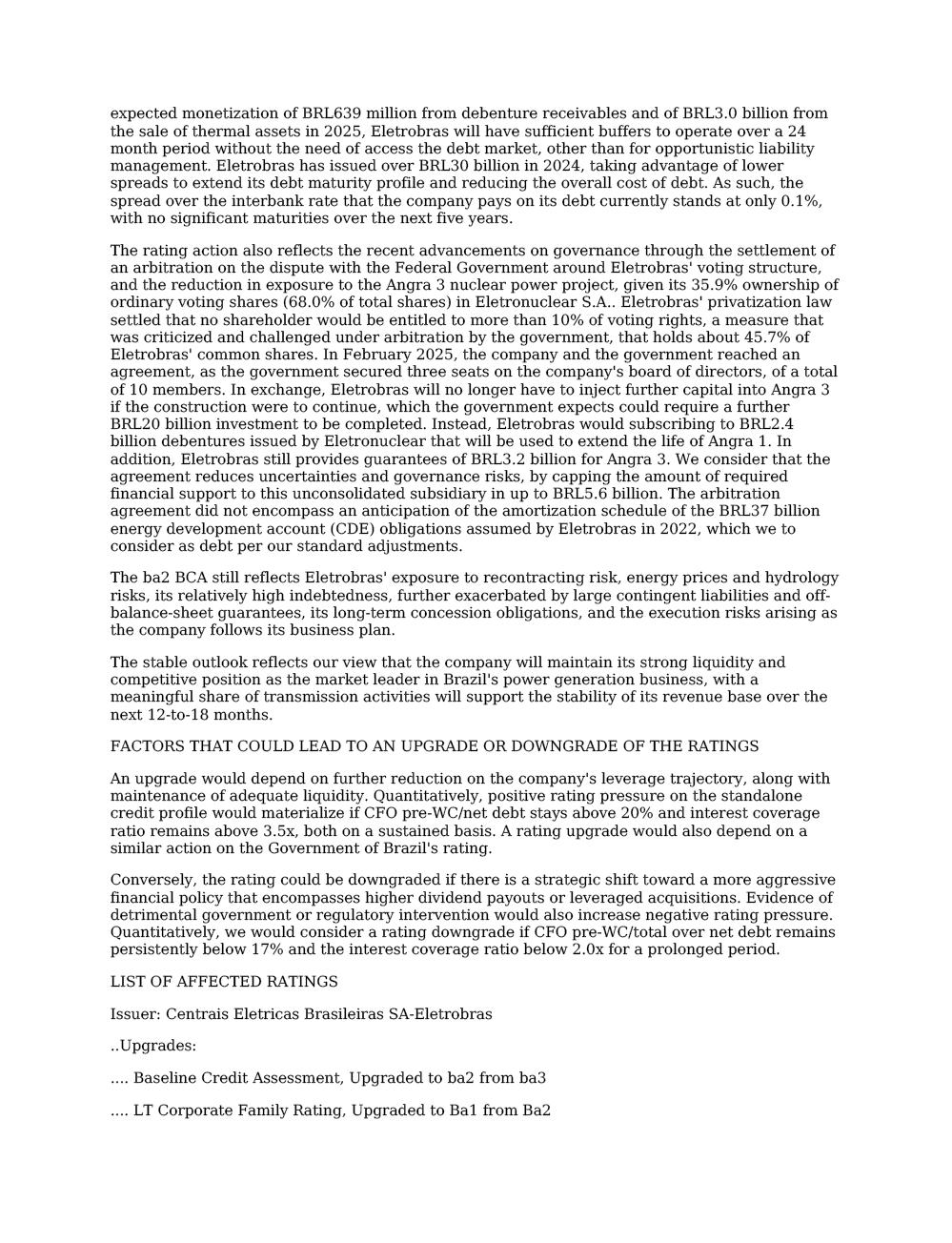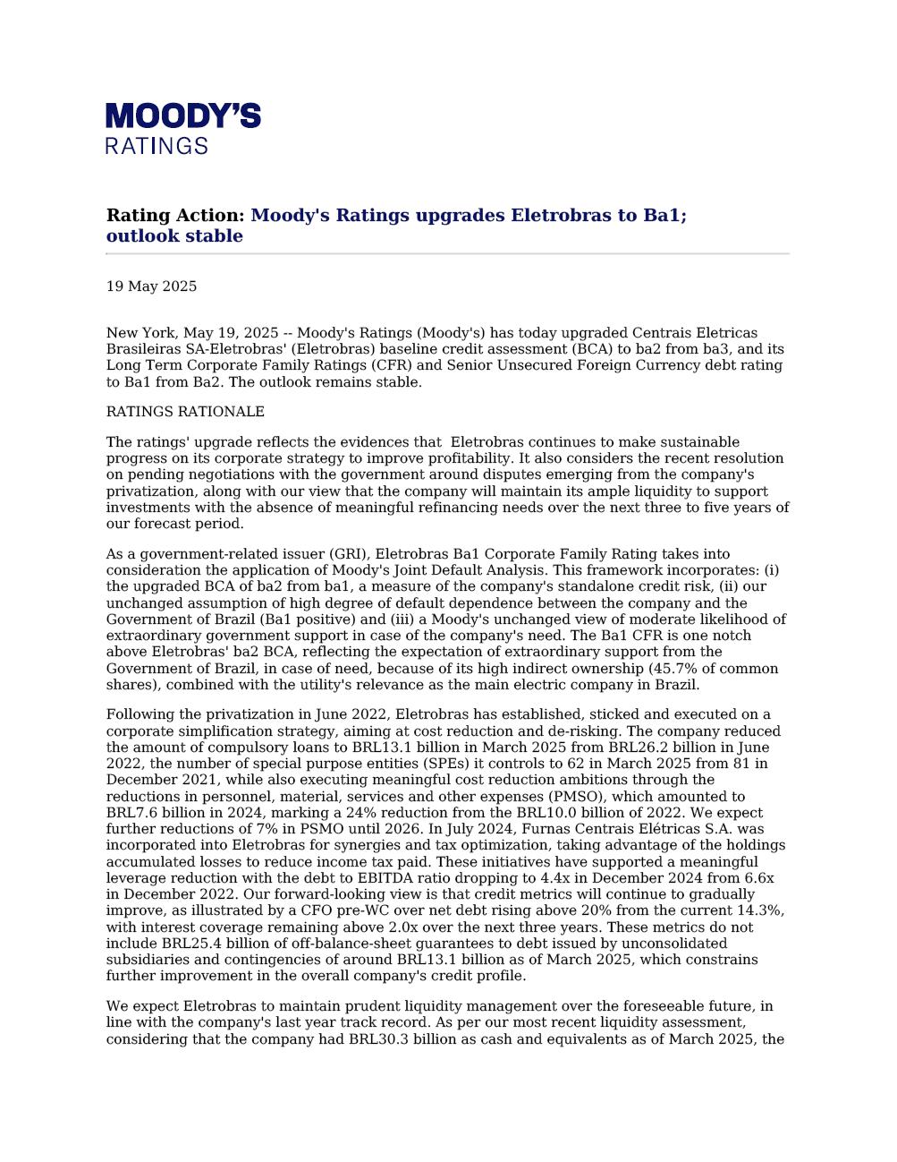 Rating Action: Moody's Ratings upgrades Eletrobras to Ba1; outlook stable 19 May 2025 New York, May 19, 2025 -- Moody's Ratings (Moody's) has today upgraded Centrais Eletricas Brasileiras SA-Eletrobras' (Eletrobras) baseline credit assessment (BCA) to ba2 from ba3, and its Long Term Corporate Family Ratings (CFR) and Senior Unsecured Foreign Currency debt rating to Ba1 from Ba2. The outlook remains stable. RATINGS RATIONALE The ratings' upgrade reflects the evidences that Eletrobras continues to make sustainable progress on its corporate strategy to improve profitability. It also considers the recent resolution on pending negotiations with the government around disputes emerging from the company's privatization, along with our view that the company will maintain its ample liquidity to support investments with the absence of meaningful refinancing needs over the next three to five years of our forecast period. As a government-related issuer (GRI), Eletrobras Ba1 Corporate Family Rating takes into consideration the application of Moody's Joint Default Analysis. This framework incorporates: (i) the upgraded BCA of ba2 from ba1, a measure of the company's standalone credit risk, (ii) our unchanged assumption of high degree of default dependence between the company and the Government of Brazil (Ba1 positive) and (iii) a Moody's unchanged view of moderate likelihood of extraordinary government support in case of the company's need. The Ba1 CFR is one notch above Eletrobras' ba2 BCA, reflecting the expectation of extraordinary support from the Government of Brazil, in case of need, because of its high indirect ownership (45.7% of common shares), combined with the utility's relevance as the main electric company in Brazil. Following the privatization in June 2022, Eletrobras has established, sticked and executed on a corporate simplification strategy, aiming at cost reduction and de-risking. The company reduced the amount of compulsory loans to BRL13.1 billion in March 2025 from BRL26.2 billion in June 2022, the number of special purpose entities (SPEs) it controls to 62 in March 2025 from 81 in December 2021, while also executing meaningful cost reduction ambitions through the reductions in personnel, material, services and other expenses (PMSO), which amounted to BRL7.6 billion in 2024, marking a 24% reduction from the BRL10.0 billion of 2022. We expect further reductions of 7% in PSMO until 2026. In July 2024, Furnas Centrais Elétricas S.A. was incorporated into Eletrobras for synergies and tax optimization, taking advantage of the holdings accumulated losses to reduce income tax paid. These initiatives have supported a meaningful leverage reduction with the debt to EBITDA ratio dropping to 4.4x in December 2024 from 6.6x in December 2022. Our forward-looking view is that credit metrics will continue to gradually improve, as illustrated by a CFO pre-WC over net debt rising above 20% from the current 14.3%, with interest coverage remaining above 2.0x over the next three years. These metrics do not include BRL25.4 billion of off-balance-sheet guarantees to debt issued by unconsolidated subsidiaries and contingencies of around BRL13.1 billion as of March 2025, which constrains further improvement in the overall company's credit profile. We expect Eletrobras to maintain prudent liquidity management over the foreseeable future, in line with the company's last year track record. As per our most recent liquidity assessment, considering that the company had BRL30.3 billion as cash and equivalents as of March 2025, the expected monetization of BRL639 million from debenture receivables and of BRL3.0 billion from the sale of thermal assets in 2025, Eletrobras will have sufficient buffers to operate over a 24 month period without the need of access the debt market, other than for opportunistic liability management. Eletrobras has issued over BRL30 billion in 2024, taking advantage of lower spreads to extend its debt maturity profile and reducing the overall cost of debt. As such, the spread over the interbank rate that the company pays on its debt currently stands at only 0.1%, with no significant maturities over the next five years. The rating action also reflects the recent advancements on governance through the settlement of an arbitration on the dispute with the Federal Government around Eletrobras' voting structure, and the reduction in exposure to the Angra 3 nuclear power project, given its 35.9% ownership of ordinary voting shares (68.0% of total shares) in Eletronuclear S.A.. Eletrobras' privatization law settled that no shareholder would be entitled to more than 10% of voting rights, a measure that was criticized and challenged under arbitration by the government, that holds about 45.7% of Eletrobras' common shares. In February 2025, the company and the government reached an agreement, as the government secured three seats on the company's board of directors, of a total of 10 members. In exchange, Eletrobras will no longer have to inject further capital into Angra 3 if the construction were to continue, which the government expects could require a further BRL20 billion investment to be completed. Instead, Eletrobras would subscribing to BRL2.4 billion debentures issued by Eletronuclear that will be used to extend the life of Angra 1. In addition, Eletrobras still provides guarantees of BRL3.2 billion for Angra 3. We consider that the agreement reduces uncertainties and governance risks, by capping the amount of required financial support to this unconsolidated subsidiary in up to BRL5.6 billion. The arbitration agreement did not encompass an anticipation of the amortization schedule of the BRL37 billion energy development account (CDE) obligations assumed by Eletrobras in 2022, which we to consider as debt per our standard adjustments. The ba2 BCA still reflects Eletrobras' exposure to recontracting risk, energy prices and hydrology risks, its relatively high indebtedness, further exacerbated 