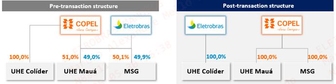 Eletrobras transferred all of its minority interests in Mata de Santa Genebra Transmissão S.A. - MSG - and in the Mauá Hydroelectric Plant - UHE Mauá - to Copel, receiving in return, in addition to UHE Colíder, a payment in cash of R$196.6 million, after adjustments provided for in the contract, such as the receipt of dividends from MSG.