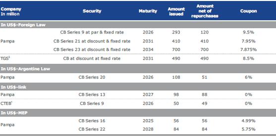 This transaction extended the Company’s debt maturity profile, reduced interest expenses and positioned the 2034 Notes as Pampa’s benchmark bond. Notably, the 2034 Notes were priced at the lowest spread over US Treasuries in Pampa’s debt issuance history.