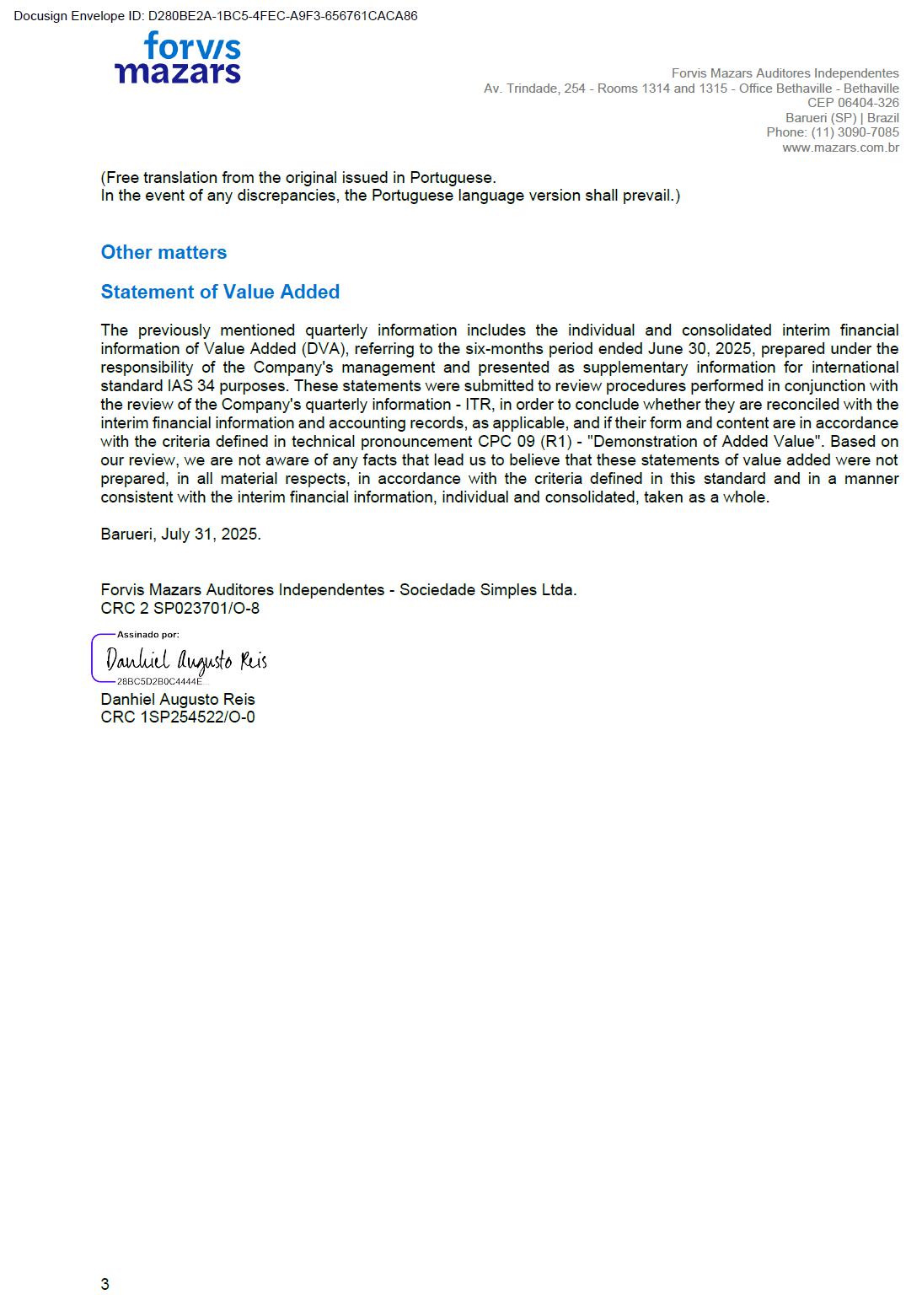 In the event of any discrepancies, the Portuguese language version shall prevail.) 3 Other matters Statement of Value Added The previously mentioned quarterly information includes the individual and consolidated interim financial information of Value Added (DVA), referring to the six-months period ended June 30, 2025, prepared under the responsibility of the Company's management and presented as supplementary information for international standard IAS 34 purposes. These statements were submitted to review procedures performed in conjunction with the review of the Company's quarterly information - ITR, in order to conclude whether they are reconciled with the interim financial information and accounting records, as applicable, and if their form and content are in accordance with the criteria defined in technical pronouncement CPC 09 (R1) - "Demonstration of Added Value". Based on our review, we are not aware of any facts that lead us to believe that these statements of value added were not prepared, in all material respects, in accordance with the criteria defined in this standard and in a manner consistent with the interim financial information, individual and consolidated, taken as a whole. Barueri, July 31, 2025. Forvis Mazars Auditores Independentes - Sociedade Simples Ltda. CRC 2 SP023701/O-8 Danhiel Augusto Reis CRC 1SP254522/O-0 Docusign Envelope ID: D280BE2A-1BC5-4FEC-A9F3-656761CACA86