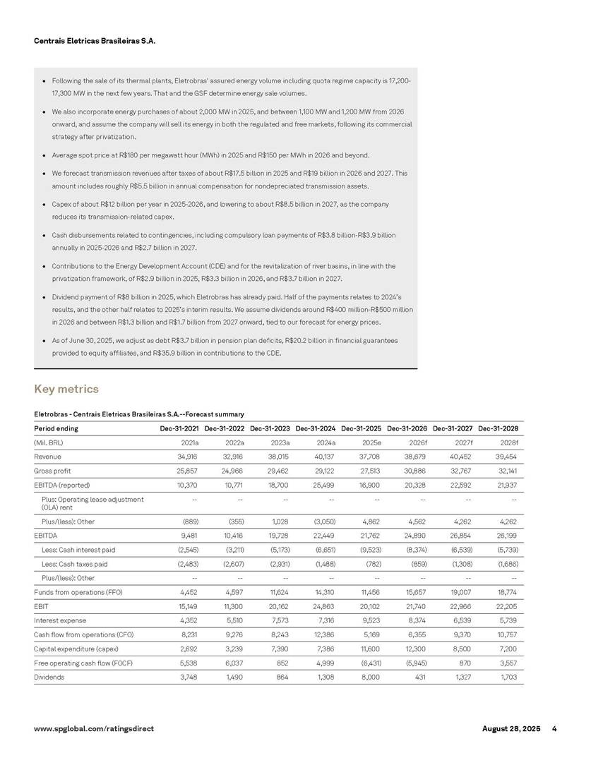 Centrais Eletricas Brasileiras S.A. August 28, 2025 This report does not constitute a rating action. Ratings Score Snapshot Credit Highlights Overview Key strengths Key risks Brazil’s largest electricity group, with about 44 gigawatts (GW) of installed power generation capacity (18% market share) and over 74,000 kilometers (km) of transmission lines (37% of the national grid). Leverage peak in 2025 amid elevated interest rates, higher dividends, and capital expenditures (capex) of about Brazilian real (R$) 12 billion per year in 2025-2026. Eletrobras derives more than half of its EBITDA from power transmission, under a stable regulatory regime, which brings predictability to EBITDA generation. High domestic interest rates will keep interest expenses costly because half of debt is at floating rates. Improving efficiency of operations and falling contingency risks post privatization. Guarantees provided to nonconsolidated companies and privatization obligations pressure adjusted credit metrics. Large and uncontracted energy position could represent an upside opportunity for long-term power purchase agreements (PPAs). As Eletrobras increases its exposure to the free energy market, it faces higher volatility risks in energy prices, which could impair cash flows. We expect Eletrobras' leverage to peak in 2025 following significant investments and dividends, and gradual deleveraging afterward. We consider investments of around R$12 billion annually in 2025-2026. Post its privatization in 2022, Centrais Eletricas Brasileiras S.A. – Eletrobras is prioritizing investments in its transmission networks, focusing on new projects, BB/Stable/-- Business risk: Financial risk: Highly leveraged Vulnerable Minimal Excellent Anchor Modifiers Group/ government Issuer credit rating Satisfactory Aggressive bb bb bb Primary Contact Bruno Ferreira, CFA Sao Paulo 55-11-3039-9798 Bruno.Ferreira @spglobal.com Additional Contacts Flavia M Bedran Sao Paulo 55-11-3039-9758 flavia.bedran @spglobal.com Julyana Yokota Sao Paulo 55-11-3039-9731 julyana.yokota @spglobal.com www.spglobal.com/ratingsdirect August 28, 2025 1 reinforcements, and upgrades. This should translate to additional annual permitted revenues (RAP) of more than R$2 billion in the next few years. At the same time, the regulator revised down payments from RBSE (Rede Básica do Sistema Existente) by approximately R$1.3 billion per year. The RBSE payments are indemnification payments for the nondepreciated portion of transmission assets renewed under Law 12,783/2013. As a result, and also due to the high interest burden, we expect negative free operating cash flow (FOCF) of R$5.5 billion-R$6.5 billion annually in the next two years, mostly covered by the company's sizable cash position of R$29.8 billion as of June 2025, although we believe Eletrobras may continue accessing the credit and capital markets opportunistically and for liability management. The negative FOCF, coupled with Eletrobras' announcement of a record dividends payment of R$8 billion in 2025, including the R$4 billion interim dividends related to 2025's results, will lead leverage to peak this year. We forecast net adjusted debt to EBITDA in the 5.0x-5.5x range and funds from operations (FFO) to debt around 10% in 2025, from our previous expectations of 10%- 12%. The negative effect of prolonged higher interest rates in Brazil will also impair the FFO-todebt ratio. We expect Eletrobras to begin gradually lowering leverage in 2026, with adjusted debt to EBITDA improving to slightly below 5.0x and FFO to debt between 12%-14%, and the same metrics around 4.5x and 15%-17% from 2027 onward. Lower leverage will be fostered by inflation adjustments in the transmission business, additional RAP from ongoing investments, and higher energy sales and prices in the free market, as Eletrobras migrates capacity from regulated quotas following the privatization process until 2027. Finally, expected increasing FFO reflects our view that interest rates should start receding in 2026 to 13%, from 15% in 2025. Eletrobras continues to focus on efficiencies and addressing contingent liabilities. Since privatization, the company has been working on simplifying its corporate structure, as well as upgrading technology and improving internal processes to enhance operating efficiency. Additionally, Eletrobras is negotiating its contingent liabilities, including its compulsory loan amounts, which decreased to R$12 billion as of June 2025, from R$17.3 billion in 2023. We forecast that compulsory loan payments, coupled with other contingencies, will lead to cash disbursements of R$3.8 billion per year in 2025-2026. Lower provisions and higher profits in the generation segment, along with efficiency gains in personnel, services, materials, and other expenses, should contribute to increased margins in the coming years. In 2025, we forecast EBITDA margins of 54%-55%, slightly below the 55.9% EBITDA margin in 2024, due to the downward revision of RBSE payments. We expect margins expected to grow to 60%-62% from 2026 onward. Conciliation with the federal government is ongoing. The lawsuit initiated by the federal government in 2023 about disputes in Eletrobras' privatization process has been settled and is now awaiting approval by the Supreme Court. As part of the agreement, Eletrobras is selling its remaining minority stake in Eletronuclear (36% voting, 68% capital), while it will exempt from making new capital contributions to finalize the construction of the nuclear plant Angra III. In exchange, the government secured expanded representation on Eletrobras' board of directors. It now holds three seats from two, out of 10 board members. Finally, the agreement ratifies the government’s 10% voting cap despite its 45.9% current ownership. Although the agreement increases government influence, considering its broader presence on the board, the agreement also allows Eletrobras to continue focusing on its core www.spglobal.