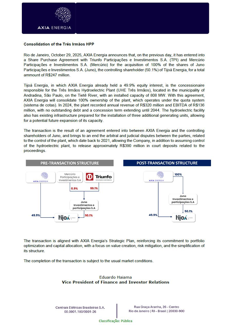 Classificação: Pública Consolidation of the Três Irmãos HPP Rio de Janeiro, October 29, 2025, AXIA Energia announces that, on the previous day, it has entered into a Share Purchase Agreement with Triunfo Participações e Investimentos S.A. (TPI) and Mercúrio Participações e Investimentos S.A. (Mercúrio) for the acquisition of 100% of the shares of Juno Participações e Investimentos S.A. (Juno), the controlling shareholder (50.1%) of Tijoá Energia, for a total ammount of R$247 million. Tijoá Energia, in which AXIA Energia already held a 49.9% equity interest, is the concessionaire responsible for the Três Irmãos Hydroelectric Plant (UHE Três Irmãos), located in the municipality of Andradina, São Paulo, on the Tietê River, with an installed capacity of 808 MW. With this agreement, AXIA Energia will consolidate 100% ownership of the plant, which operates under the quota system (sistema de cotas). In 2024, the plant recorded annual revenue of R$320 million and EBITDA of R$136 million, with no outstanding debt and a concession term extending until 2044. The hydroelectric facility also has existing infrastructure prepared for the installation of three additional generating units, allowing for a potential future expansion of its capacity. The transaction is the result of an agreement entered into between AXIA Energia and the controlling shareholders of Juno, and brings to an end the arbitral and judicial disputes between the parties, related to the control of the plant, which date back to 2021, allowing the Company, in addition to assuming control of the hydroelectric plant, to release approximately R$390 million in court deposits related to the proceedings. The transaction is aligned with AXIA Energia’s Strategic Plan, reinforcing its commitment to portfolio optimization and capital allocation, with a focus on value creation, risk mitigation, and the simplification of its structure. The completion of the transaction is subject to the usual market conditions. Eduardo Haiama Vice President of Finance and Investor Relations Pursuant to the requirements of the Securities Exchange Act of 1934, the registrant has duly caused this report to be signed on its behalf by the undersigned, thereunto duly authorized.