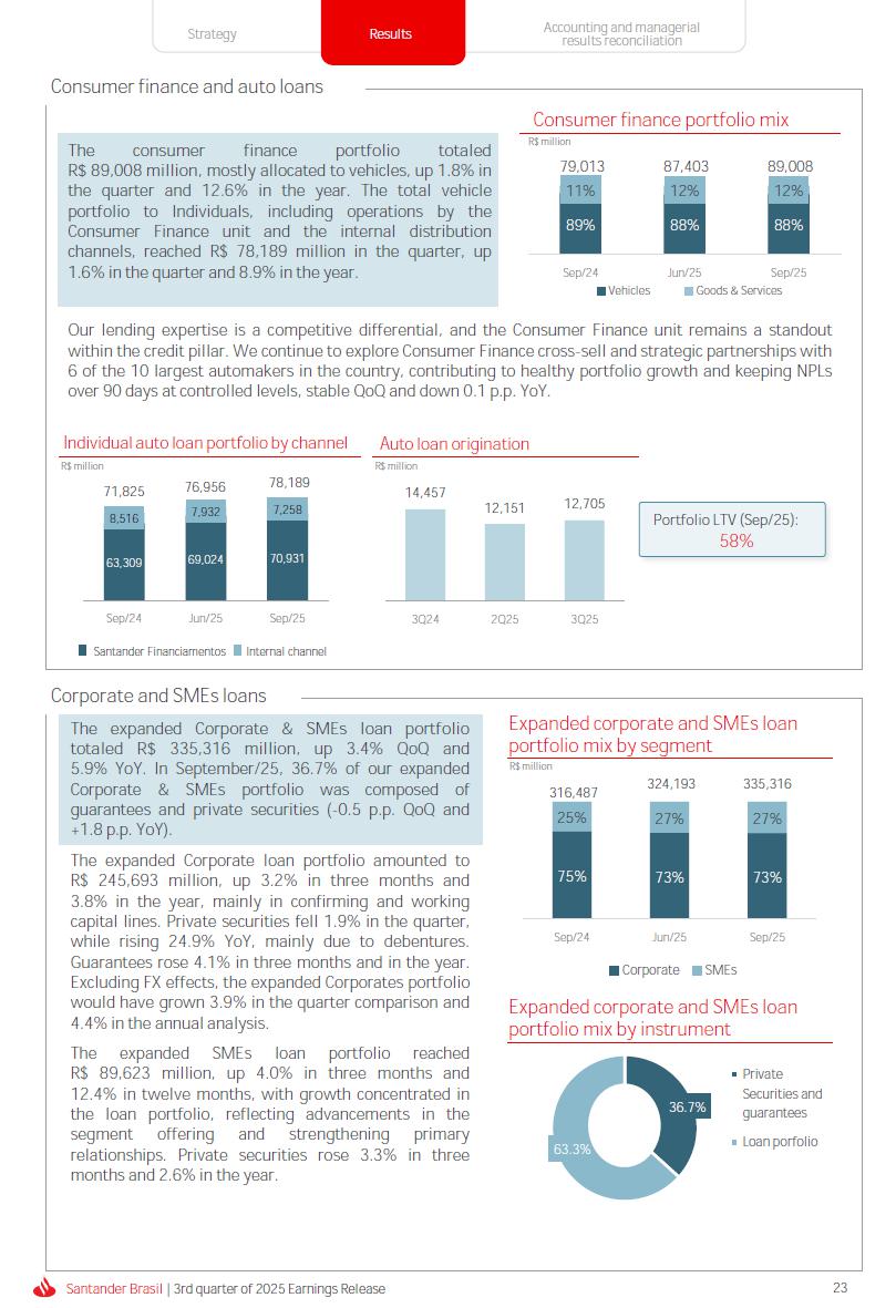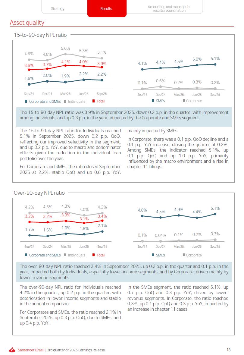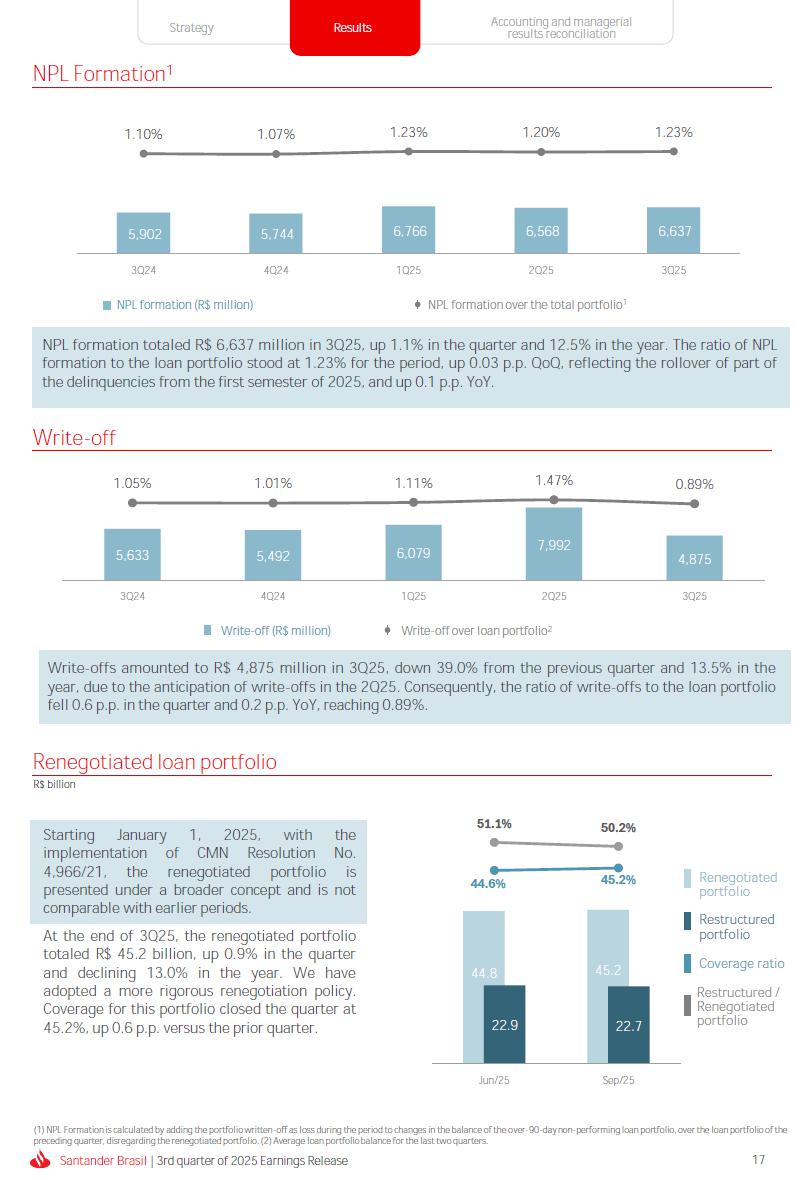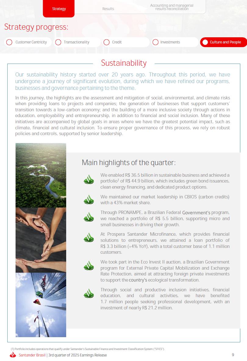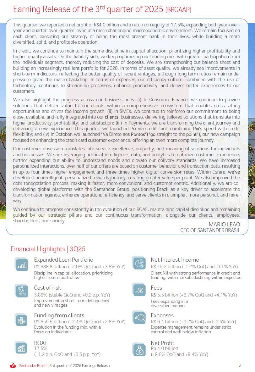 If “Yes” is marked, indicate below the file number assigned to the registrant in connection with Rule 12g3-2(b): N/A Earnings Release 3rd quarter of 2025 (BRGAAP) www.santander.com.br/ri/en/ Strategy highlights 3 Strategy progress 4 Customer centricity 4 Transactionality 5 Credit 6 Investments 7 Culture and People 8 Performance analysis 10 Executive summary 11 Income Statement and Balance Sheet Analysis 12 Managerial income statement 12 Net interest income 13 Fees 14 Provisions for loan losses' results and cost of risk 16 NPL Formation, write-off and renegotiated loan portfolio 17 Asset quality 18 Expenses 19 Other Operating Income and Expenses 20 Balance sheet 20 Loan portfolio 21 Funding 24 Capital 24 Reconciliation of accounting and managerial results 25 Third quarter 2025 Index 2 Santander Brasil | 3rd quarter of 2025 Earnings Release Financial Highlights | 3Q25 Earning Release of the 3rdquarter of 2025 (BRGAAP) MARIO LEÃO CEO OF SANTANDER BRASIL Expanded Loan Portfolio R$ 688.8 billion (+2.0% QoQ and +3.8% YoY) Discipline in capital allocation, prioritizing higher-return portfolios Expenses Expense management remains under strict control and well below inflation Cost of risk Improvement in short-term delinquency and new vintages Net Profit Net Interest Income R$ 15.2 billion (-1.2% QoQ and -0.1% YoY) Fees R$ 5.5billion(+6.7%QoQand+4.1%YoY) Fees expanding in a diversified manner Client NII with strong performance in credit and funding, with markets declining within expected R$6.4billion(+0.2%QoQand-0.5%YoY) 3.86% (stableQoQand+0.2 p.p. YoY) (+9.6% QoQ and +9.4% YoY) Funding from clients Evolution in the funding mix, with a focus on Individuals R$ 659.5billion(+2.4%QoQand+2.8%YoY) Thisquarter,wereportedanetprofitofR$4.0billionandareturnonequityof17.5%,expandingbothyear-over-yearandquarter-over-quarter,eveninamorechallengingmacroeconomicenvironment.Weremainfocusedoneachclient,executingourstrategyofbeingthemostpresentbankintheirlives,whilebuildingamorediversified,solid,andprofitableoperation. Incredit,wecontinuetomaintainthesamedisciplineincapitalallocation,prioritizinghigherprofitabilityandhigher-qualityassets.Ontheliabilityside,wekeepoptimizingourfundingmix,withgreaterparticipationfromtheIndividualssegment,therebyreducingthecostofdeposits.Wearestrengtheningourbalancesheetandbuildinganincreasinglyresilientportfoliofor2026.Intermsofassetquality,wealreadyseeimprovementsinshort-termindicators,reflectingthebetterqualityofrecentvintages,althoughlongtermratiosremainunderpressuregiventhemacrobackdrop.Intermsofexpenses,ourefficiencyculture,combinedwiththeuseoftechnology,continuestostreamlineprocesses,enhanceproductivity,anddeliverbetterexperiencestoourcustomers. Wealsohighlighttheprogressacrossourbusinesslines:(i)InConsumerFinance,wecontinuetoprovidesolutionsthatdelivervaluetoourclientswithinacomprehensiveecosystemthatenablescross-sellingopportunitiesanddrivesfeeincomegrowth;(ii)InSMEs,wecontinuetoreinforceourcommitmenttobeingclose,available,andfullyintegratedintoourbusinesses,deliveringtailoredsolutionsthattranslateintohigherproductivity,profitability,andsatisfaction;(iii)InPayments,wearetransformingtheclientjourneyanddeliveringanewexperience.Thisquarter,welaunchedPixviacreditcard,combiningspeedwithcreditflexibility;and(iv)InOctober,welaunchedVáDiretoaosstraighttotheournewcampaignfocusedonenhancingthecreditcardcustomerexperience,offeringanevenmorecompletejourney. Ourcustomerobsessiontranslatesintoserviceexcellence,empathy,andmeaningfulsolutionsforindividualsandbusinesses.Weareleveragingartificialintelligence,data,andanalyticstooptimizecustomerexperience,furtherexpandingourabilitytounderstandneedsandelevateourdeliverystandards.Wehaveincreasedpersonalizedinteractions,overhalfofouroffersarebasedoncustomerbehaviorandtransactiondata,resultinginuptofourtimeshigherengagementandthreetimeshigherdigitalconversionrates.WithinEsfera,developedanintelligent,personalizedrewardsjourney,creatinggreatervalueperpoint.Wealsoimprovedthedebtrenegotiationprocess,makingitfaster,moreconvenient,andcustomer-centric.Additionally,weareco-developingglobalplatformswiththeSantanderGroup,positioningBrazilasakeydrivertoacceleratethetransformationagenda,enhanceoperationalefficiency,andserveclientsinasimpler,morepersonal,andfairerway. WecontinuetoprogressconsistentlyintheevolutionofourROAE,maintainingcapitaldisciplineandremainingguidedbyourstrategicpillarsandourcontinuoustransformation,alongsideourclients,employees,shareholders,andsociety. R$ 4.0billion ROAE 17.5% (+1.2 p.p. QoQ and +0.5 p.p. YoY) Santander Brasil | 3rd quarter of 2025 Earnings Release 3 We are constantly striving to improve our offerings and customer service by combining human contact with the digital environment to bring the best experience at every touchpoint with the Bank. In the digital channel, we continue to evolve technologically, with increasingly simpler yet more comprehensive journeys. We are focusing on hyper-personalization, where 52% of our offers are already based on customer behaviors. As an example of the results of these efforts, we achieved up to four times higher engagement and three times greater digital conversion in cards. In Esfera, we are building an intelligent reward journey, supported by AI to analyze customer behavior and deliver a more seamless experience, with personalized offers and benefits, adding more value to each point earned. In emDia, we are using generative AI to assist customers in the debt renegotiation process through voice and text agents, making it faster, more convenient, and with an improved experience, resulting in greater productivity and customer satisfaction. Our combined efforts are reflected in growing customer satisfaction over the past two years across both Individuals and Companies segments. Among SMEs, we reached the highest NPS level in our history, demonstrating our commitment to delivering solutions that meet our needs, with excellence in service and experience. (1) Considering transactionality, 