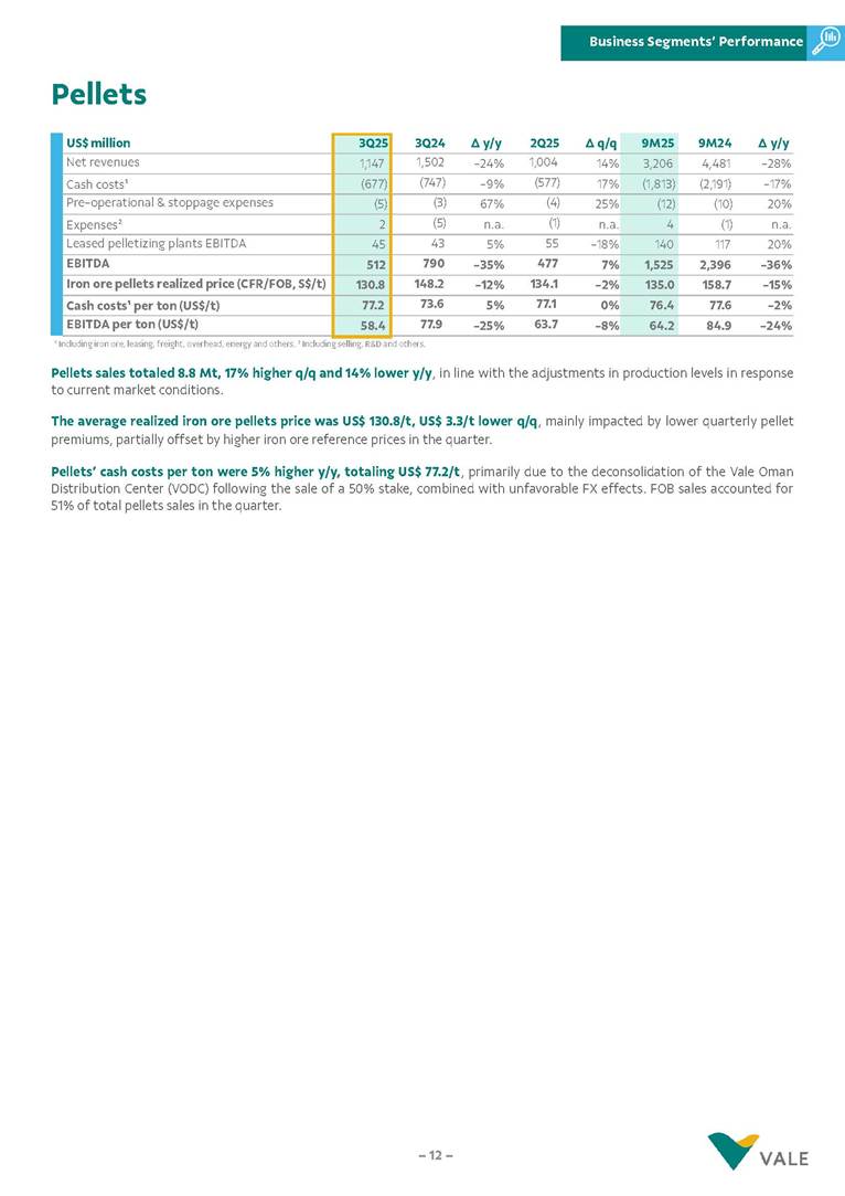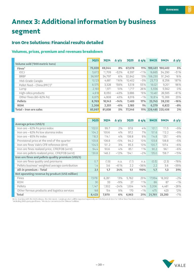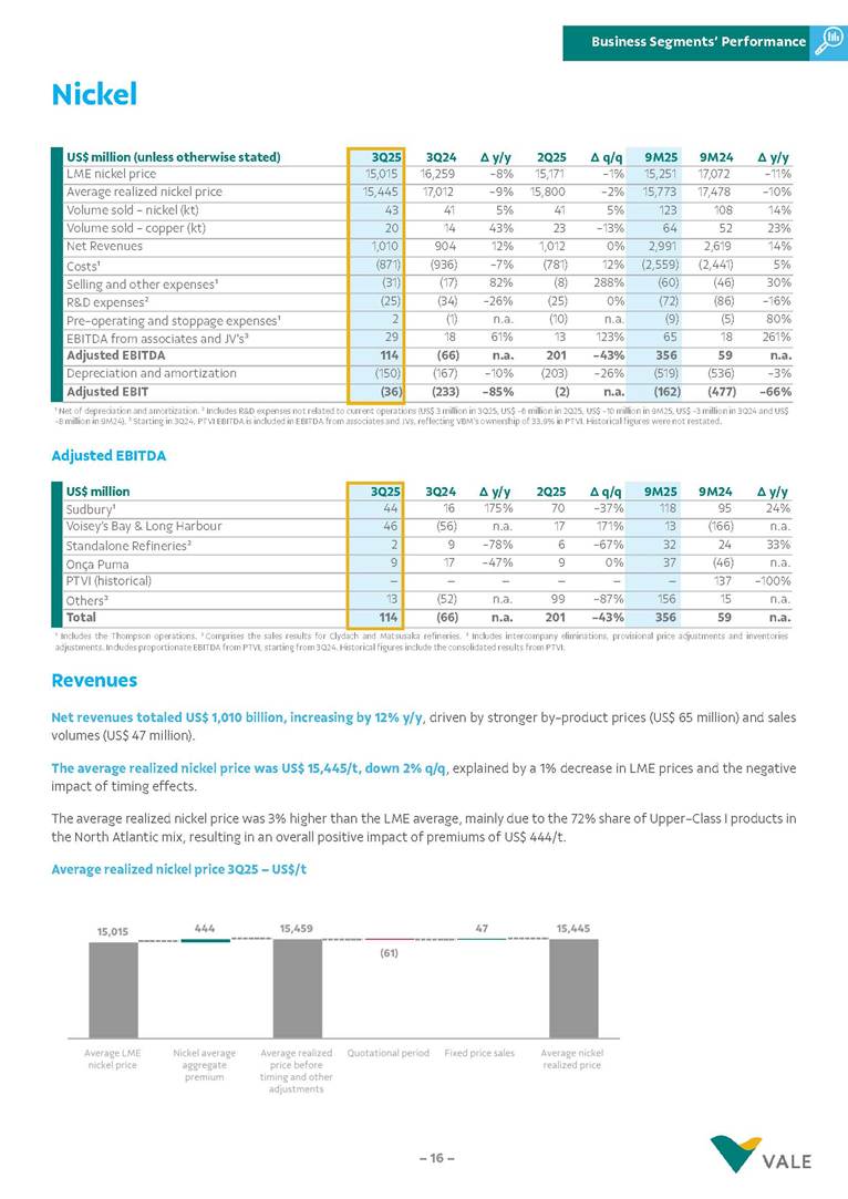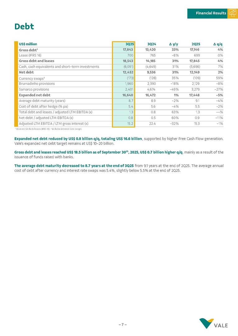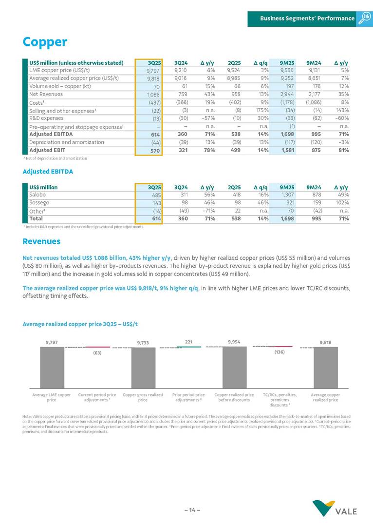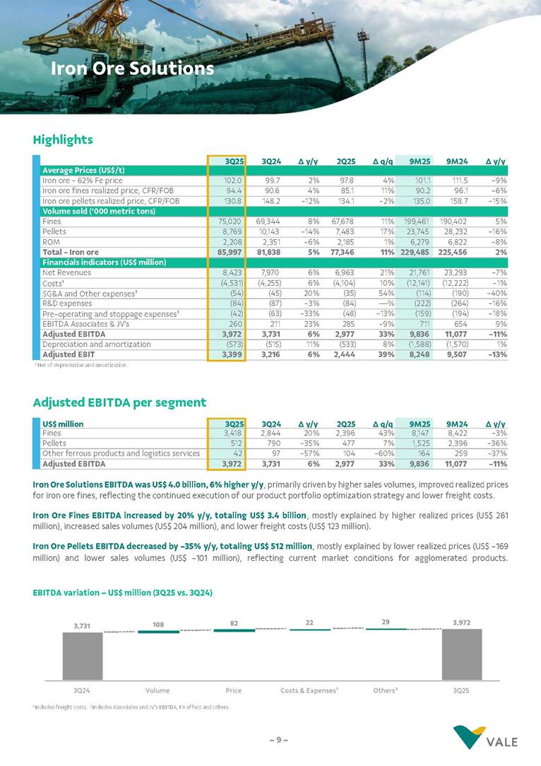 – 1 – 8. Selected financial indicators 9. US$ million 3Q25 3Q24 Δ y/y 2Q25 Δ q/q 9M25 9M24 Δ y/y Net operating revenues 10,420 9,553 9% 8,804 18% 27,343 27,932 -2% 10. Total costs and expenses (ex-Brumadinho and dams decharacterization) 1 (7,229) (6,896) 5% (6,630) 9% (19,829) (19,916) 0% Expenses related to Brumadinho and dams decharacterization (30) (126) -76% (38) -21% (165) (166) -1% 11. Adjusted EBIT 3,608 2,867 26% 2,606 38% 8,625 8,791 -2% 12. Adjusted EBITDA 4,369 3,615 21% 3,386 29% 10,870 11,046 -2% 13. Proforma EBITDA2 3 4,399 3,773 17% 3,424 28% 11,035 11,273 -2% 14. Proforma EBITDA margin (%) 42% 39% 3 p.p. 39% 3 p.p. 40% 40% 0 p.p. 5. Free cash flow 2,568 587 337% 1,008 155% 4,080 5,610 -27% 6. Recurring free cash flow 1,562 512 205% 1,008 55% 3,074 2,954 4% 7. Attributable net income 2,685 2,412 11% 2,117 27% 6,196 6,860 -10% 3. Proforma net income attributable to Vale’s shareholders 2,744 1,538 78% 2,117 30% 6,332 5,230 21% 4. Net debt⁴ 12,452 9,536 31% 12,149 2% 12,452 9,536 31% 2. Expanded net debt 16,640 16,472 1% 17,448 -5% 16,640 16,472 1% 1. Capital expenditures 1,250 1,398 -11% 1,053 19% 3,477 4,121 -16% 1 Includes adjustment of US$ 155 million in 3Q25, US$ 168 million in 2Q25, US$ 490 million in 9M25, US$ 94 million in 3Q24 and US$ 243 million in 9M24 to reflect the streaming transactions performance at market price. 2 Excluding expenses related to Brumadinho and non-recurring items. 3 Including the EBITDA from associates and JVs. Historical figures were restated. 4 Including leases (IFRS 16). Results Highlights • Robust sales performance across all business segments. Iron ore, copper and nickel sales increased by 5% (+4 Mt), 20% (+15 kt) and 6% (+2 kt) y/y, respectively, supported by solid operational performance. • The average realized iron ore fines price was US$ 94.4/t, 11% higher q/q and 4% higher y/y, outperforming the broader increase in iron ore reference price. This performance reflects quality premiums improvements driven by the product portfolio strategy. • All-in costs for iron ore declined 4% y/y to US$ 52.9/t, driven by enhanced quality premiums and reduced freight costs. • Iron ore fines’ C1 cash cost, excluding third-party purchases, remained largely flat y/y and on track to meet the 2025 guidance, reaching US$ 20.7/t in the quarter. • Copper all-in costs were down 65% y/y (to US$ 994/t), while nickel all-in costs declined 32% y/y (to US$ 12,347/t). These improvements were driven by operational efficiencies, increased production and higher by-products revenues. • Copper all-in cost guidance for 2025 further revised down to US$ 1,000-1,500/t (from US$ 1,500-2,000/t), driven by higher gold prices. Nickel all-in cost guidance for 2025 revised down to US$ 13,000-14,000/t, (from US$ 14,000-15,500/t), driven by solid operational performance and strong metals price, benefitting polymetallic assets. • Proforma EBITDA totaled US$ 4.4 billion, up 17% y/y and 28% q/q, driven by higher volumes, cost efficiencies, and higher iron ore, copper and by-products prices. • Capital expenditures of US$ 1.3 billion were US$ 0.1 billion lower y/y, on track to meet the guidance of US$ 5.4-5.7 billion set for 2025. • Recurring Free Cash Flow generation was US$ 1.6 billion, US$ 1.0 billion higher y/y, primarily reflecting stronger EBITDA. • Expanded net debt of US$ 16.6 billion at quarter-end, US$ 0.8 billion lower q/q, driven by robust FCF generation. Rio de Janeiro, October 30th, 2025 Vale’s performance in 3Q25 “We delivered another strong quarter, marked by solid operational performance, continued progress on our strategic agenda and commitment to safety. Iron ore production reached its highest quarterly level since 2018 and copper had its best Q3 result since 2019, while we continued to improve our cost competitiveness on nickel. All of these reflect the operational consistency and relentless dedication of our teams. We advanced key growth projects under the New Carajás program and successfully started up the 2nd furnace at Onça Puma, unlocking growth and reinforcing our long-term value creation strategy. Our flexible iron ore portfolio, supported by an extended value chain, once again proved essential in enhancing our competitiveness and resilience across market cycles. Safety remains our priority, and we are very happy to have achieved an important milestone by having no dams classified at emergency level 3 - a fundamental step in our journey to become a trusted partner to society. These results strengthen my confidence in Vale’s future and in the value we are creating for all stakeholders.", commented Gustavo Pimenta, CEO – 2 – Business Highlights Iron Ore Solutions • Successful execution of the portfolio strategy, with a US$ 2/t improvement in iron ore fines premiums q/q, supported by the increase in blended and concentrated products. In the quarter, Vale also officially launched its mid-grade Carajás product, which provides greater operational flexibility and optimization of the mining plan. The company remains focused on maximizing value through an optimized product portfolio enabled by its supply chain flexibility. Energy Transition Metals • Onça Puma 2nd furnace successfully started operations in September. Delivered on schedule and 13% below budget (US$ 480 million final CAPEX), the project adds 15 ktpy of nickel capacity, increasing the site's nameplate capacity to 40 ktpy. Recent developments • New Carajás Program continues to advance with (i) the operating license obtained for mine-related activities at the Serra Sul +20 Mtpy iron ore project, (ii) the operating license obtained for the Serra Leste expansion to 10 Mtpy of iron ore production, and (iii) progress on access works for the Bacaba copper project, which obtained its preliminary license in June and is awaiting installation license. • Aliança Energia JV was completed in September after regulatory approvals. Following the completion, Vale receiv