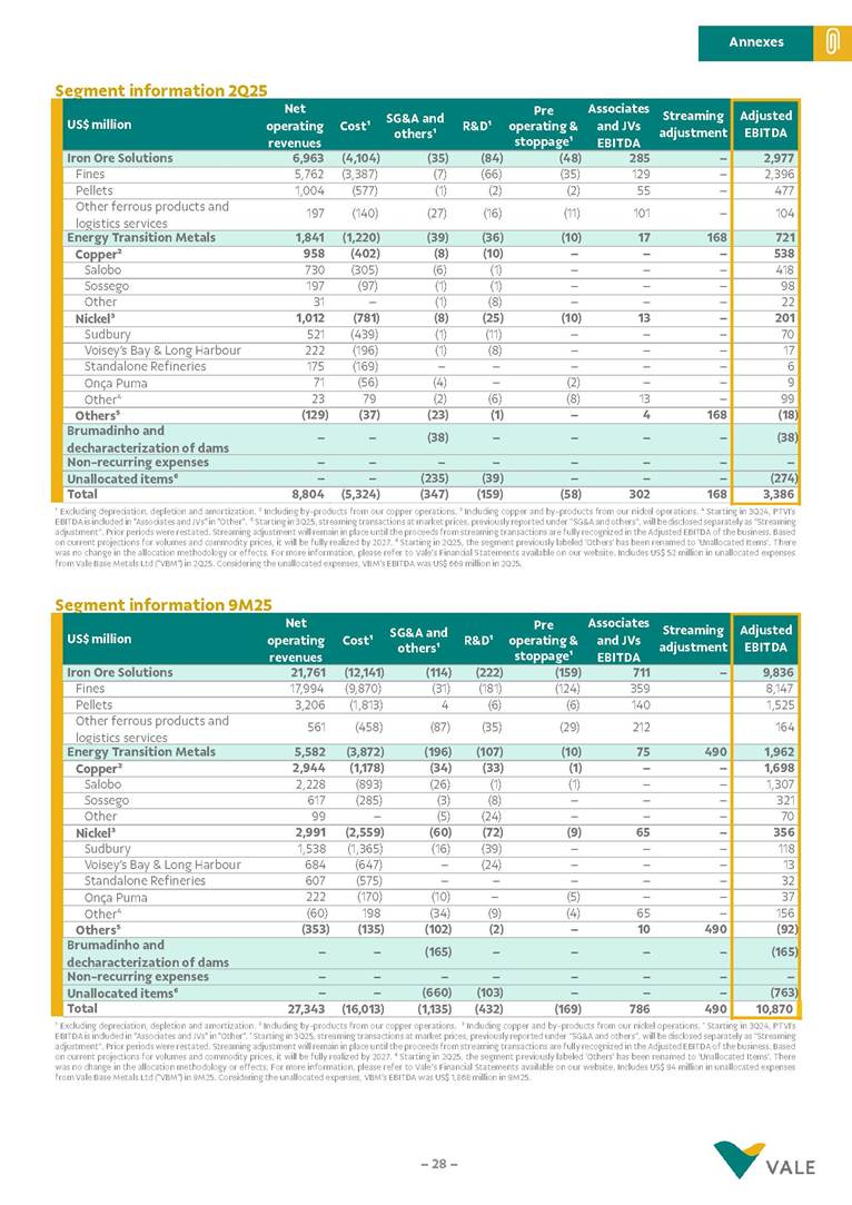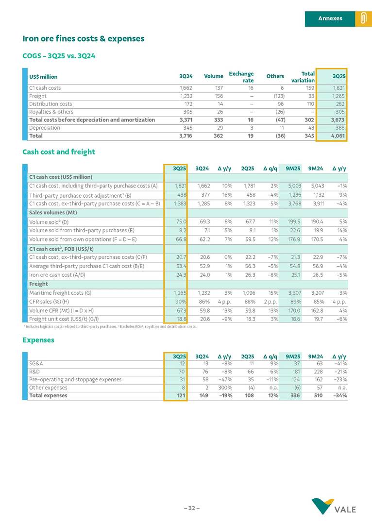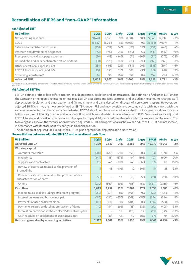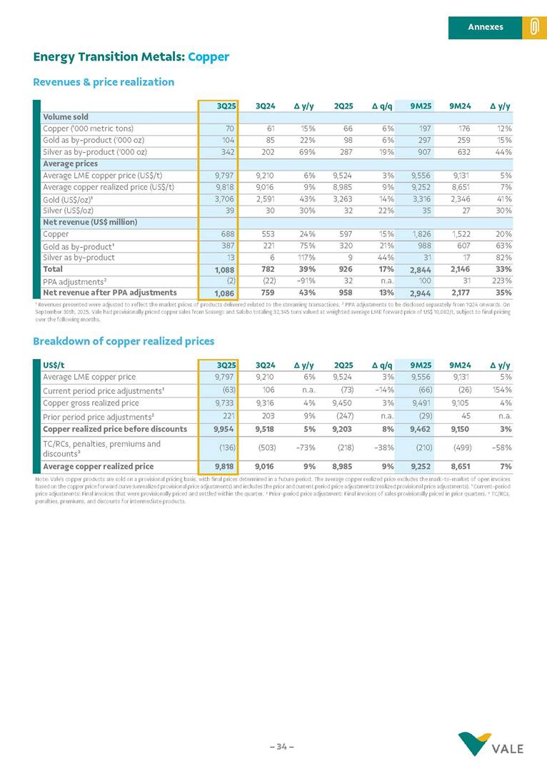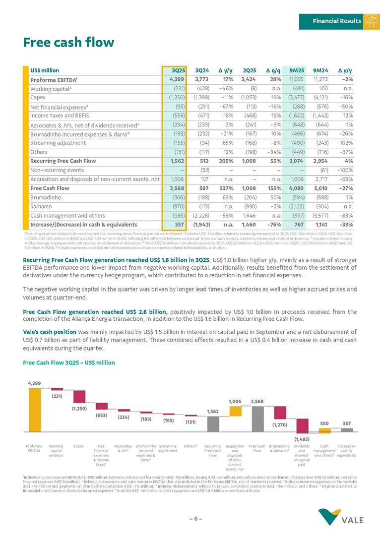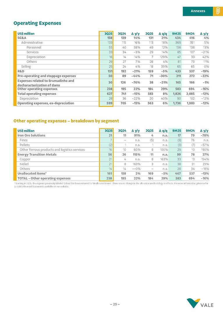– 1 – 8. Selected financial indicators 9. US$ million 3Q25 3Q24 Δ y/y 2Q25 Δ q/q 9M25 9M24 Δ y/y Net operating revenues 10,420 9,553 9% 8,804 18% 27,343 27,932 -2% 10. Total costs and expenses (ex-Brumadinho and dams decharacterization) 1 (7,229) (6,896) 5% (6,630) 9% (19,829) (19,916) 0% Expenses related to Brumadinho and dams decharacterization (30) (126) -76% (38) -21% (165) (166) -1% 11. Adjusted EBIT 3,608 2,867 26% 2,606 38% 8,625 8,791 -2% 12. Adjusted EBITDA 4,369 3,615 21% 3,386 29% 10,870 11,046 -2% 13. Proforma EBITDA2 3 4,399 3,773 17% 3,424 28% 11,035 11,273 -2% 14. Proforma EBITDA margin (%) 42% 39% 3 p.p. 39% 3 p.p. 40% 40% 0 p.p. 5. Free cash flow 2,568 587 337% 1,008 155% 4,080 5,610 -27% 6. Recurring free cash flow 1,562 512 205% 1,008 55% 3,074 2,954 4% 7. Attributable net income 2,685 2,412 11% 2,117 27% 6,196 6,860 -10% 3. Proforma net income attributable to Vale’s shareholders 2,744 1,538 78% 2,117 30% 6,332 5,230 21% 4. Net debt⁴ 12,452 9,536 31% 12,149 2% 12,452 9,536 31% 2. Expanded net debt 16,640 16,472 1% 17,448 -5% 16,640 16,472 1% 1. Capital expenditures 1,250 1,398 -11% 1,053 19% 3,477 4,121 -16% 1 Includes adjustment of US$ 155 million in 3Q25, US$ 168 million in 2Q25, US$ 490 million in 9M25, US$ 94 million in 3Q24 and US$ 243 million in 9M24 to reflect the streaming transactions performance at market price. 2 Excluding expenses related to Brumadinho and non-recurring items. 3 Including the EBITDA from associates and JVs. Historical figures were restated. 4 Including leases (IFRS 16). Results Highlights • Robust sales performance across all business segments. Iron ore, copper and nickel sales increased by 5% (+4 Mt), 20% (+15 kt) and 6% (+2 kt) y/y, respectively, supported by solid operational performance. • The average realized iron ore fines price was US$ 94.4/t, 11% higher q/q and 4% higher y/y, outperforming the broader increase in iron ore reference price. This performance reflects quality premiums improvements driven by the product portfolio strategy. • All-in costs for iron ore declined 4% y/y to US$ 52.9/t, driven by enhanced quality premiums and reduced freight costs. • Iron ore fines’ C1 cash cost, excluding third-party purchases, remained largely flat y/y and on track to meet the 2025 guidance, reaching US$ 20.7/t in the quarter. • Copper all-in costs were down 65% y/y (to US$ 994/t), while nickel all-in costs declined 32% y/y (to US$ 12,347/t). These improvements were driven by operational efficiencies, increased production and higher by-products revenues. • Copper all-in cost guidance for 2025 further revised down to US$ 1,000-1,500/t (from US$ 1,500-2,000/t), driven by higher gold prices. Nickel all-in cost guidance for 2025 revised down to US$ 13,000-14,000/t, (from US$ 14,000-15,500/t), driven by solid operational performance and strong metals price, benefitting polymetallic assets. • Proforma EBITDA totaled US$ 4.4 billion, up 17% y/y and 28% q/q, driven by higher volumes, cost efficiencies, and higher iron ore, copper and by-products prices. • Capital expenditures of US$ 1.3 billion were US$ 0.1 billion lower y/y, on track to meet the guidance of US$ 5.4-5.7 billion set for 2025. • Recurring Free Cash Flow generation was US$ 1.6 billion, US$ 1.0 billion higher y/y, primarily reflecting stronger EBITDA. • Expanded net debt of US$ 16.6 billion at quarter-end, US$ 0.8 billion lower q/q, driven by robust FCF generation. Rio de Janeiro, October 30th, 2025 Vale’s performance in 3Q25 “We delivered another strong quarter, marked by solid operational performance, continued progress on our strategic agenda and commitment to safety. Iron ore production reached its highest quarterly level since 2018 and copper had its best Q3 result since 2019, while we continued to improve our cost competitiveness on nickel. All of these reflect the operational consistency and relentless dedication of our teams. We advanced key growth projects under the New Carajás program and successfully started up the 2nd furnace at Onça Puma, unlocking growth and reinforcing our long-term value creation strategy. Our flexible iron ore portfolio, supported by an extended value chain, once again proved essential in enhancing our competitiveness and resilience across market cycles. Safety remains our priority, and we are very happy to have achieved an important milestone by having no dams classified at emergency level 3 - a fundamental step in our journey to become a trusted partner to society. These results strengthen my confidence in Vale’s future and in the value we are creating for all stakeholders.", commented Gustavo Pimenta, CEO – 2 – Business Highlights Iron Ore Solutions • Successful execution of the portfolio strategy, with a US$ 2/t improvement in iron ore fines premiums q/q, supported by the increase in blended and concentrated products. In the quarter, Vale also officially launched its mid-grade Carajás product, which provides greater operational flexibility and optimization of the mining plan. The company remains focused on maximizing value through an optimized product portfolio enabled by its supply chain flexibility. Energy Transition Metals • Onça Puma 2nd furnace successfully started operations in September. Delivered on schedule and 13% below budget (US$ 480 million final CAPEX), the project adds 15 ktpy of nickel capacity, increasing the site's nameplate capacity to 40 ktpy. Recent developments • New Carajás Program continues to advance with (i) the operating license obtained for mine-related activities at the Serra Sul +20 Mtpy iron ore project, (ii) the operating license obtained for the Serra Leste expansion to 10 Mtpy of iron ore production, and (iii) progress on access works for the Bacaba copper project, which obtained its preliminary license in June and is awaiting installation license. • Aliança Energia JV was completed in September after regulatory approvals. Following the completion, Vale receiv