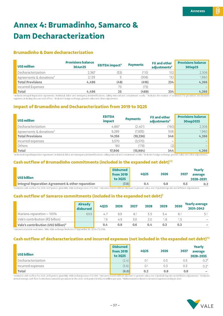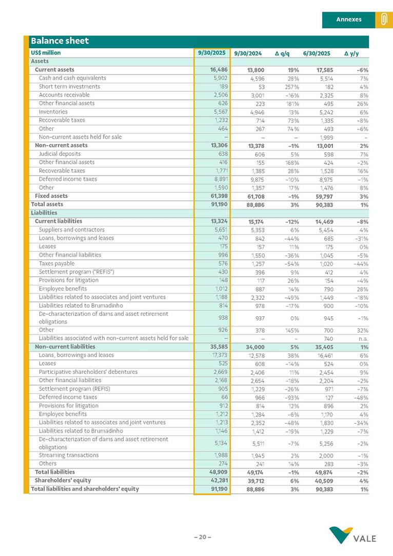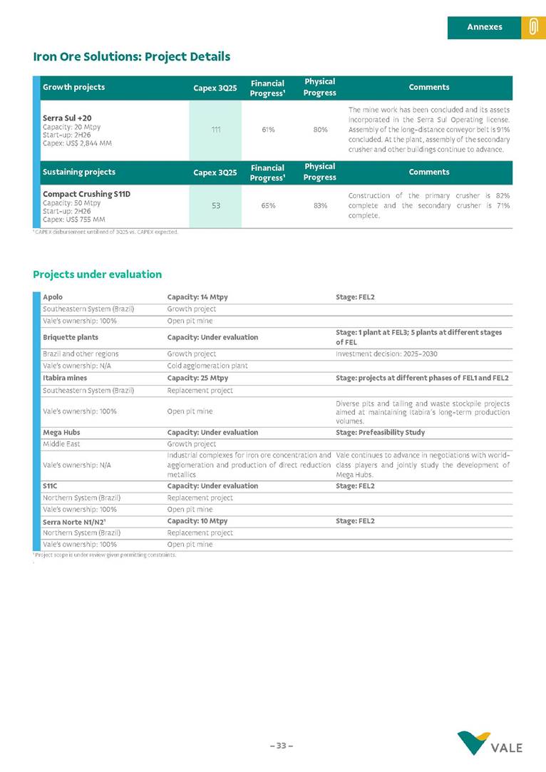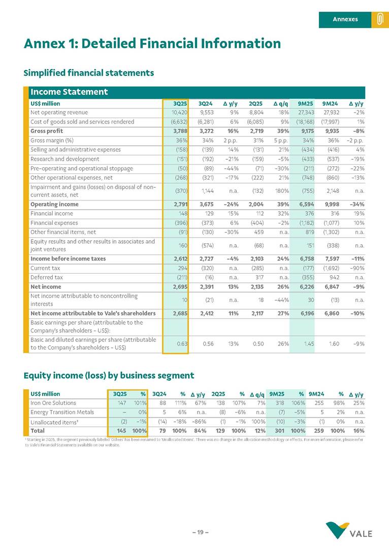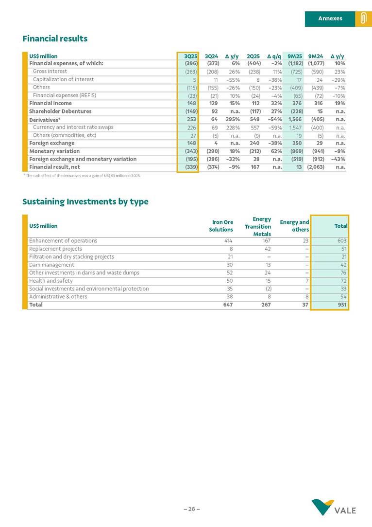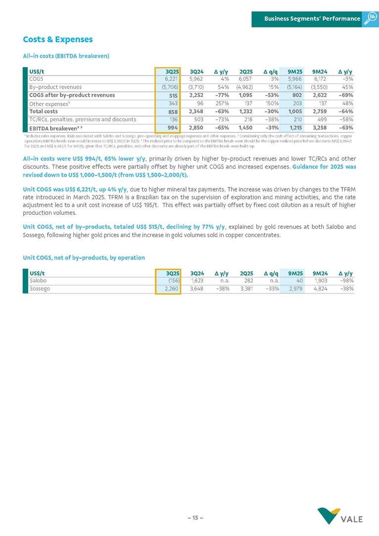 – 1 – 8. Selected financial indicators 9. US$ million 3Q25 3Q24 Δ y/y 2Q25 Δ q/q 9M25 9M24 Δ y/y Net operating revenues 10,420 9,553 9% 8,804 18% 27,343 27,932 -2% 10. Total costs and expenses (ex-Brumadinho and dams decharacterization) 1 (7,229) (6,896) 5% (6,630) 9% (19,829) (19,916) 0% Expenses related to Brumadinho and dams decharacterization (30) (126) -76% (38) -21% (165) (166) -1% 11. Adjusted EBIT 3,608 2,867 26% 2,606 38% 8,625 8,791 -2% 12. Adjusted EBITDA 4,369 3,615 21% 3,386 29% 10,870 11,046 -2% 13. Proforma EBITDA2 3 4,399 3,773 17% 3,424 28% 11,035 11,273 -2% 14. Proforma EBITDA margin (%) 42% 39% 3 p.p. 39% 3 p.p. 40% 40% 0 p.p. 5. Free cash flow 2,568 587 337% 1,008 155% 4,080 5,610 -27% 6. Recurring free cash flow 1,562 512 205% 1,008 55% 3,074 2,954 4% 7. Attributable net income 2,685 2,412 11% 2,117 27% 6,196 6,860 -10% 3. Proforma net income attributable to Vale’s shareholders 2,744 1,538 78% 2,117 30% 6,332 5,230 21% 4. Net debt⁴ 12,452 9,536 31% 12,149 2% 12,452 9,536 31% 2. Expanded net debt 16,640 16,472 1% 17,448 -5% 16,640 16,472 1% 1. Capital expenditures 1,250 1,398 -11% 1,053 19% 3,477 4,121 -16% 1 Includes adjustment of US$ 155 million in 3Q25, US$ 168 million in 2Q25, US$ 490 million in 9M25, US$ 94 million in 3Q24 and US$ 243 million in 9M24 to reflect the streaming transactions performance at market price. 2 Excluding expenses related to Brumadinho and non-recurring items. 3 Including the EBITDA from associates and JVs. Historical figures were restated. 4 Including leases (IFRS 16). Results Highlights • Robust sales performance across all business segments. Iron ore, copper and nickel sales increased by 5% (+4 Mt), 20% (+15 kt) and 6% (+2 kt) y/y, respectively, supported by solid operational performance. • The average realized iron ore fines price was US$ 94.4/t, 11% higher q/q and 4% higher y/y, outperforming the broader increase in iron ore reference price. This performance reflects quality premiums improvements driven by the product portfolio strategy. • All-in costs for iron ore declined 4% y/y to US$ 52.9/t, driven by enhanced quality premiums and reduced freight costs. • Iron ore fines’ C1 cash cost, excluding third-party purchases, remained largely flat y/y and on track to meet the 2025 guidance, reaching US$ 20.7/t in the quarter. • Copper all-in costs were down 65% y/y (to US$ 994/t), while nickel all-in costs declined 32% y/y (to US$ 12,347/t). These improvements were driven by operational efficiencies, increased production and higher by-products revenues. • Copper all-in cost guidance for 2025 further revised down to US$ 1,000-1,500/t (from US$ 1,500-2,000/t), driven by higher gold prices. Nickel all-in cost guidance for 2025 revised down to US$ 13,000-14,000/t, (from US$ 14,000-15,500/t), driven by solid operational performance and strong metals price, benefitting polymetallic assets. • Proforma EBITDA totaled US$ 4.4 billion, up 17% y/y and 28% q/q, driven by higher volumes, cost efficiencies, and higher iron ore, copper and by-products prices. • Capital expenditures of US$ 1.3 billion were US$ 0.1 billion lower y/y, on track to meet the guidance of US$ 5.4-5.7 billion set for 2025. • Recurring Free Cash Flow generation was US$ 1.6 billion, US$ 1.0 billion higher y/y, primarily reflecting stronger EBITDA. • Expanded net debt of US$ 16.6 billion at quarter-end, US$ 0.8 billion lower q/q, driven by robust FCF generation. Rio de Janeiro, October 30th, 2025 Vale’s performance in 3Q25 “We delivered another strong quarter, marked by solid operational performance, continued progress on our strategic agenda and commitment to safety. Iron ore production reached its highest quarterly level since 2018 and copper had its best Q3 result since 2019, while we continued to improve our cost competitiveness on nickel. All of these reflect the operational consistency and relentless dedication of our teams. We advanced key growth projects under the New Carajás program and successfully started up the 2nd furnace at Onça Puma, unlocking growth and reinforcing our long-term value creation strategy. Our flexible iron ore portfolio, supported by an extended value chain, once again proved essential in enhancing our competitiveness and resilience across market cycles. Safety remains our priority, and we are very happy to have achieved an important milestone by having no dams classified at emergency level 3 - a fundamental step in our journey to become a trusted partner to society. These results strengthen my confidence in Vale’s future and in the value we are creating for all stakeholders.", commented Gustavo Pimenta, CEO – 2 – Business Highlights Iron Ore Solutions • Successful execution of the portfolio strategy, with a US$ 2/t improvement in iron ore fines premiums q/q, supported by the increase in blended and concentrated products. In the quarter, Vale also officially launched its mid-grade Carajás product, which provides greater operational flexibility and optimization of the mining plan. The company remains focused on maximizing value through an optimized product portfolio enabled by its supply chain flexibility. Energy Transition Metals • Onça Puma 2nd furnace successfully started operations in September. Delivered on schedule and 13% below budget (US$ 480 million final CAPEX), the project adds 15 ktpy of nickel capacity, increasing the site's nameplate capacity to 40 ktpy. Recent developments • New Carajás Program continues to advance with (i) the operating license obtained for mine-related activities at the Serra Sul +20 Mtpy iron ore project, (ii) the operating license obtained for the Serra Leste expansion to 10 Mtpy of iron ore production, and (iii) progress on access works for the Bacaba copper project, which obtained its preliminary license in June and is awaiting installation license. • Aliança Energia JV was completed in September after regulatory approvals. Following the completion, Vale receiv