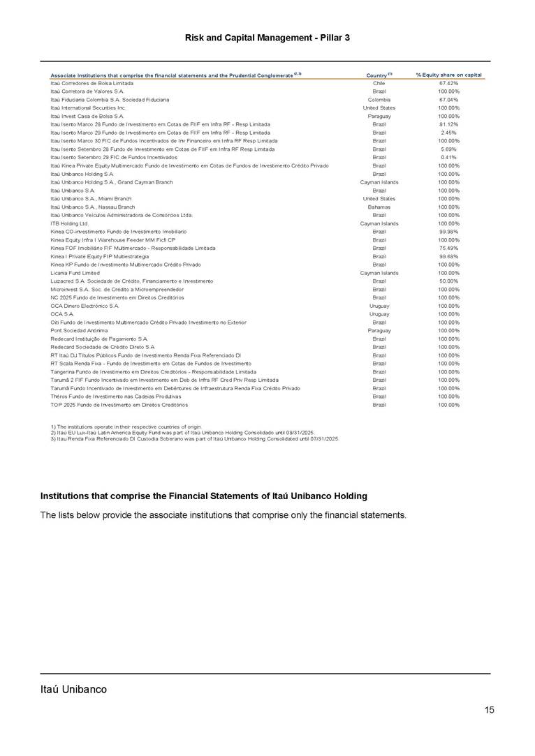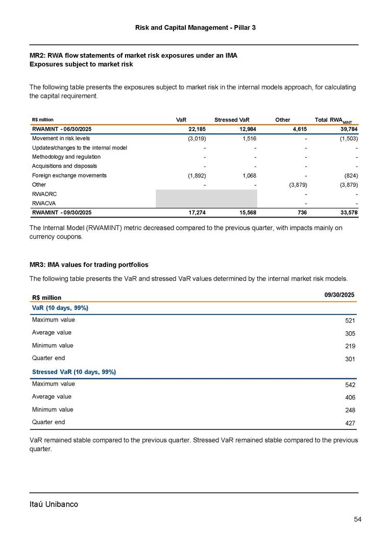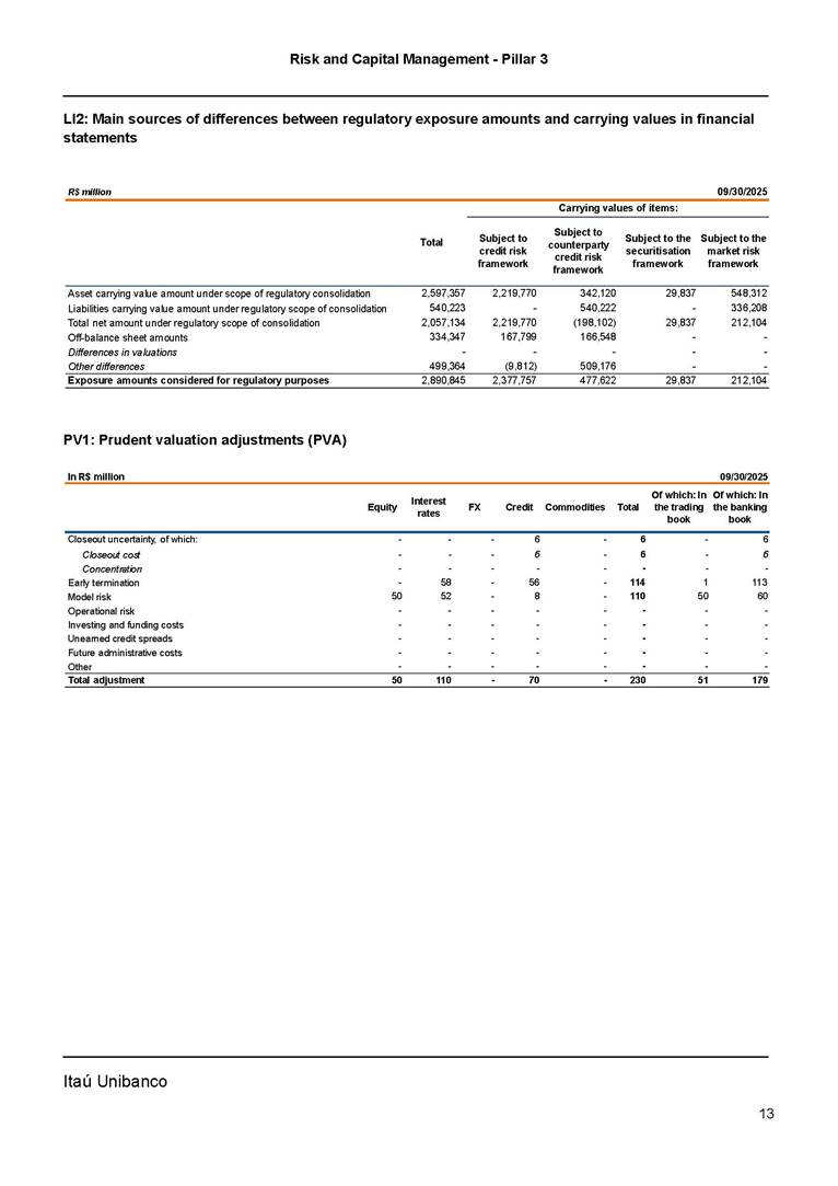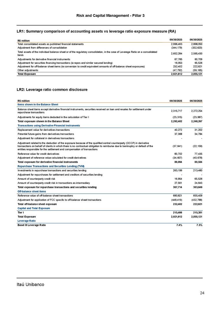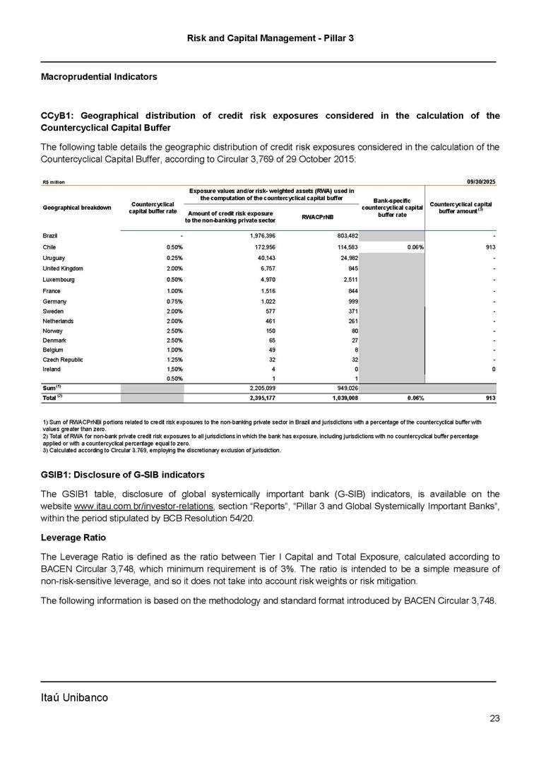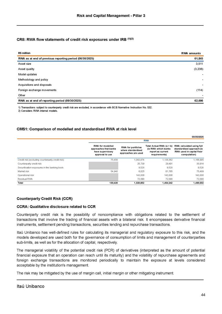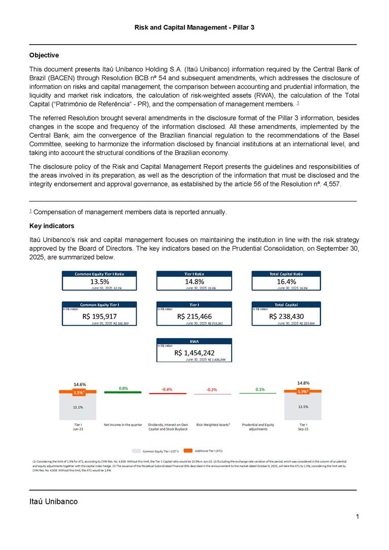 Risk and Capital Management - Pillar 3 Itaú Unibanco Holding S.A. Third Quarter of 2025 Objective 1 Key indicators 1 Prudential Metrics and Risk Management 2 KM1: Key metrics at consolidated level 2 OVA: Bank risk management approach 4 Scope and main characteristics of risk management 4 Risk and Capital Governance 5 Ituber Culture 6 Risk Appetite 7 Stress Testing 8 Recovery and Resolution Plan 8 Capital Adequacy Assessment 10 Capital Adequacy 10 OV1: Overview of risk-weighted assets (RWA) 10 Links between financial statements and regulatory exposures 11 LIA: Explanations of differences between accounting and regulatory exposure amounts 11 LI1: Differences between accounting and regulatory scopes of consolidation and mapping of financial statement categories with regulatory risk categories 12 LI2: Main sources of differences between regulatory exposure amounts and carrying values in financial statements 13 PV1: Prudent valuation adjustments (PVA) 13 Institutions that comprise the Financial Statement of Itaú Unibanco Holding 15 Non Consolidated Institutions 18 Material Entities 19 Composition of Capital 19 CCA: Main features of regulatory capital instuments 19 CC1: Composition of regulatory capital 20 CC2: Reconciliation of regulatory capital to balance sheet 22 Macroprudential Indicators 23 CCyB1: Geographical distribution of credit risk exposures considered in the calculation of the Countercyclical Capital Buffer 23 GSIB1: Disclosure of G-SIB indicators 23 Leverage Ratio 23 LR1: Summary comparison of accounting assets vs leverage ratio exposure measure (RA) 24 LR2: Leverage ratio common disclosure 24 Liquidity Ratios 25 LIQA: Liquidity Risk Management Information 25 Framework and Treatment 25 LIQ1: Liquidity Coverage Ratio (LCR) 26 LIQ2: Net Stable Funding Ratio (NSFR) 27 Credit Risk 28 CRA: Qualitative information on credit risk management 28 CR1: Credit Quality of Assets 29 CR2: Changes in Stock of defaulted loans and debts securities 30 CRB: Additional disclosure related to the credit quality of assets Credit risk mitigation 30 Exposure by industry 30 Exposure by remaining maturity 31 Overdue exposures 31 Exposure by geographical area in Brazil and by country 31 Largest debtors exposures 32 Restructured exposures 32 CRC: Qualitative disclosure related to Credit Risk Mitigation techniques 32 CR3: Credit Risk mitigation techniques – overview 33 CR4: Standardized Approach – Credit Risk exposure and credit risk mitigation effects 34 CR5: Standardized Approach – exposures by asset classes and risk weights 35 CRE: Qualitative disclosure related to IRB models 39 CR8: RWA flow statements of credit risk exposures under IRB 41 CMS1: Comparison of modelled and standardised RWA at risk level 41 Counterparty Credit Risk (CCR) 41 CCRA: Qualitative disclosure related to CCR 44 CCR1: Analysis of CCR exposures by approach 42 CCR3: Standardized approach – CCR exposures by regulatory portfolio and risk weights 42 CCR5: Composition of collateral for CCR exposures 42 CCR6: CCR associated with credit derivatives exposures 43 CCR8: CCR associated with Exposures to central counterparties 43 Securitization Exposures 43 SECA: Qualitative disclosure requirements related to securitisation exposures 43 SEC1: Securitisation exposures in the banking book 44 SEC2: Securitisation exposures in the trading book 44 SEC3: Securitisation exposures in the banking book and associated regulatory capital requirements – bank acting as originator or as sponsor 44 SEC4: Securitisation exposures in the banking book and associated capital requirements – bank acting as investor 44 Market Risk 45 MRA: Qualitative disclosure requirements related to market risk 45 MR1: Market risk under standardized approach 47 MRB: Qualitative disclosures on market risk in the Internal Models Approach (IMA) 47 MR2: RWA flow statements of market risk exposures under an IMA 51 Exposures subject to market risk 51 MR3: IMA values for trading portfolios 51 MR4: Comparison of VaR estimates with gains/losses 52 Backtesting 52 Total Exposure associated with Derivatives 52 IRRBB 53 IRRBBA: IRRBB risk management objectives and policies 53 Framework and Treatment 53 Other Risks 55 Insurance products, pension plans and premium bonds risks 55 Social, Environmental and Climatic Risks 55 Model Risk 56 Regulatory or Compliance Risk 57 Reputational Risk 57 Cyber Risk 59 Country Risk 59 Business and Strategy Risk 59 Step-in Risk 60 Emerging Risks 60 Operational Risk 60 Crisis Management and Operational Resilience 61 Independent Validation of Risk Models 62 Glossary of Acronyms 62 Glossary of Regulations 65 Risk and Capital Management - Pillar 3 __________________________________________________________________________________________ __________________________________________________________________________________________ Itaú Unibanco 1 Objective This document presents Itaú Unibanco Holding S.A. (Itaú Unibanco) information required by the Central Bank of Brazil (BACEN) through Resolution BCB nº 54 and subsequent amendments, which addresses the disclosure of information on risks and capital management, the comparison between accounting and prudential information, the liquidity and market risk indicators, the calculation of risk-weighted assets (RWA), the calculation of the Total Capital (“Patrimônio de Referência” - PR), and the compensation of management members. 1 The referred Resolution brought several amendments in the disclosure format of the Pillar 3 information, besides changes in the scope and frequency of the information disclosed. All these amendments, implemented by the Central Bank, aim the convergence of the Brazilian financial regulation to the recommendations of the Basel Committee, seeking to harmonize the information disclosed by financial institutions at an international level, and taking into account the structural conditions of the Brazilian economy. The disclosure policy of the Risk and Capital Management Report presents t