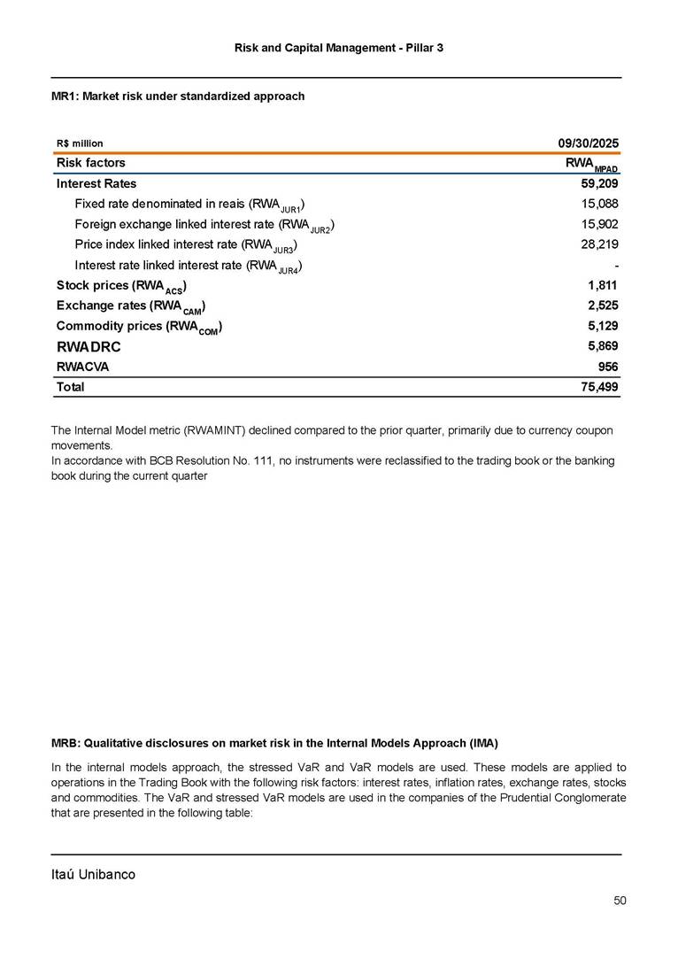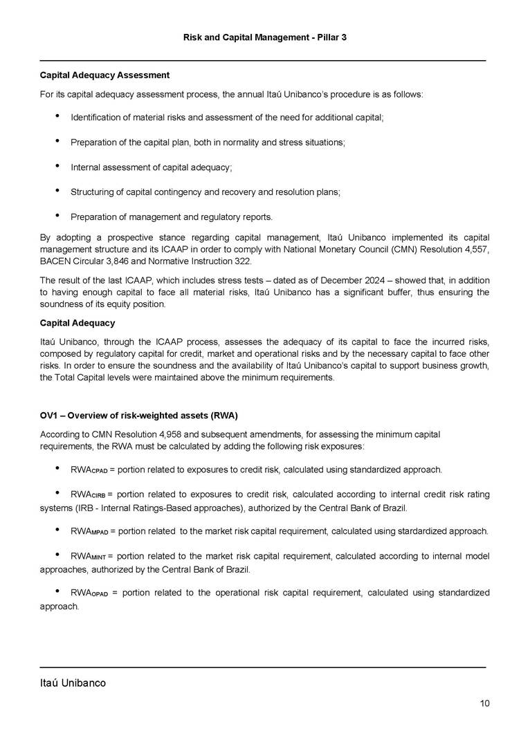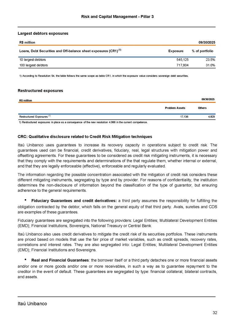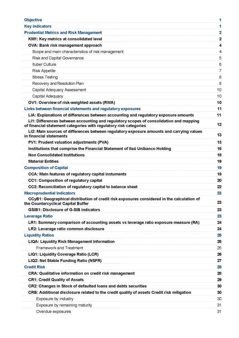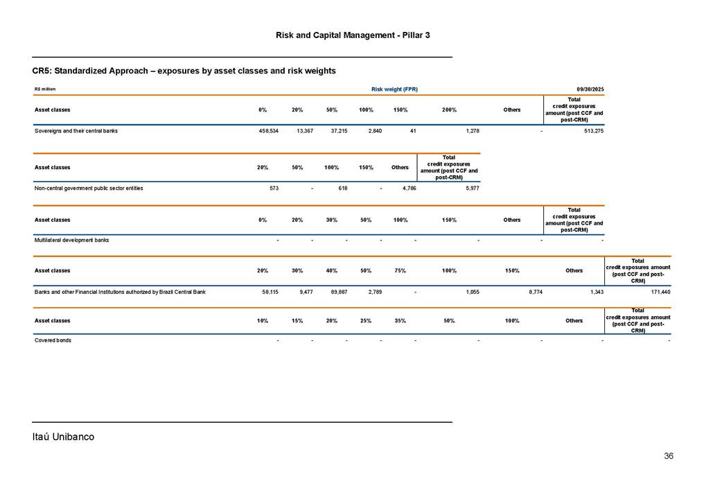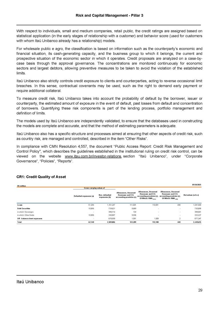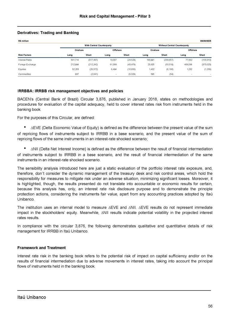 Risk and Capital Management - Pillar 3 Itaú Unibanco Holding S.A. Third Quarter of 2025 Objective 1 Key indicators 1 Prudential Metrics and Risk Management 2 KM1: Key metrics at consolidated level 2 OVA: Bank risk management approach 4 Scope and main characteristics of risk management 4 Risk and Capital Governance 5 Ituber Culture 6 Risk Appetite 7 Stress Testing 8 Recovery and Resolution Plan 8 Capital Adequacy Assessment 10 Capital Adequacy 10 OV1: Overview of risk-weighted assets (RWA) 10 Links between financial statements and regulatory exposures 11 LIA: Explanations of differences between accounting and regulatory exposure amounts 11 LI1: Differences between accounting and regulatory scopes of consolidation and mapping of financial statement categories with regulatory risk categories 12 LI2: Main sources of differences between regulatory exposure amounts and carrying values in financial statements 13 PV1: Prudent valuation adjustments (PVA) 13 Institutions that comprise the Financial Statement of Itaú Unibanco Holding 15 Non Consolidated Institutions 18 Material Entities 19 Composition of Capital 19 CCA: Main features of regulatory capital instuments 19 CC1: Composition of regulatory capital 20 CC2: Reconciliation of regulatory capital to balance sheet 22 Macroprudential Indicators 23 CCyB1: Geographical distribution of credit risk exposures considered in the calculation of the Countercyclical Capital Buffer 23 GSIB1: Disclosure of G-SIB indicators 23 Leverage Ratio 23 LR1: Summary comparison of accounting assets vs leverage ratio exposure measure (RA) 24 LR2: Leverage ratio common disclosure 24 Liquidity Ratios 25 LIQA: Liquidity Risk Management Information 25 Framework and Treatment 25 LIQ1: Liquidity Coverage Ratio (LCR) 26 LIQ2: Net Stable Funding Ratio (NSFR) 27 Credit Risk 28 CRA: Qualitative information on credit risk management 28 CR1: Credit Quality of Assets 29 CR2: Changes in Stock of defaulted loans and debts securities 30 CRB: Additional disclosure related to the credit quality of assets Credit risk mitigation 30 Exposure by industry 30 Exposure by remaining maturity 31 Overdue exposures 31 Exposure by geographical area in Brazil and by country 31 Largest debtors exposures 32 Restructured exposures 32 CRC: Qualitative disclosure related to Credit Risk Mitigation techniques 32 CR3: Credit Risk mitigation techniques – overview 33 CR4: Standardized Approach – Credit Risk exposure and credit risk mitigation effects 34 CR5: Standardized Approach – exposures by asset classes and risk weights 35 CRE: Qualitative disclosure related to IRB models 39 CR8: RWA flow statements of credit risk exposures under IRB 41 CMS1: Comparison of modelled and standardised RWA at risk level 41 Counterparty Credit Risk (CCR) 41 CCRA: Qualitative disclosure related to CCR 44 CCR1: Analysis of CCR exposures by approach 42 CCR3: Standardized approach – CCR exposures by regulatory portfolio and risk weights 42 CCR5: Composition of collateral for CCR exposures 42 CCR6: CCR associated with credit derivatives exposures 43 CCR8: CCR associated with Exposures to central counterparties 43 Securitization Exposures 43 SECA: Qualitative disclosure requirements related to securitisation exposures 43 SEC1: Securitisation exposures in the banking book 44 SEC2: Securitisation exposures in the trading book 44 SEC3: Securitisation exposures in the banking book and associated regulatory capital requirements – bank acting as originator or as sponsor 44 SEC4: Securitisation exposures in the banking book and associated capital requirements – bank acting as investor 44 Market Risk 45 MRA: Qualitative disclosure requirements related to market risk 45 MR1: Market risk under standardized approach 47 MRB: Qualitative disclosures on market risk in the Internal Models Approach (IMA) 47 MR2: RWA flow statements of market risk exposures under an IMA 51 Exposures subject to market risk 51 MR3: IMA values for trading portfolios 51 MR4: Comparison of VaR estimates with gains/losses 52 Backtesting 52 Total Exposure associated with Derivatives 52 IRRBB 53 IRRBBA: IRRBB risk management objectives and policies 53 Framework and Treatment 53 Other Risks 55 Insurance products, pension plans and premium bonds risks 55 Social, Environmental and Climatic Risks 55 Model Risk 56 Regulatory or Compliance Risk 57 Reputational Risk 57 Cyber Risk 59 Country Risk 59 Business and Strategy Risk 59 Step-in Risk 60 Emerging Risks 60 Operational Risk 60 Crisis Management and Operational Resilience 61 Independent Validation of Risk Models 62 Glossary of Acronyms 62 Glossary of Regulations 65 Risk and Capital Management - Pillar 3 __________________________________________________________________________________________ __________________________________________________________________________________________ Itaú Unibanco 1 Objective This document presents Itaú Unibanco Holding S.A. (Itaú Unibanco) information required by the Central Bank of Brazil (BACEN) through Resolution BCB nº 54 and subsequent amendments, which addresses the disclosure of information on risks and capital management, the comparison between accounting and prudential information, the liquidity and market risk indicators, the calculation of risk-weighted assets (RWA), the calculation of the Total Capital (“Patrimônio de Referência” - PR), and the compensation of management members. 1 The referred Resolution brought several amendments in the disclosure format of the Pillar 3 information, besides changes in the scope and frequency of the information disclosed. All these amendments, implemented by the Central Bank, aim the convergence of the Brazilian financial regulation to the recommendations of the Basel Committee, seeking to harmonize the information disclosed by financial institutions at an international level, and taking into account the structural conditions of the Brazilian economy. The disclosure policy of the Risk and Capital Management Report presents t