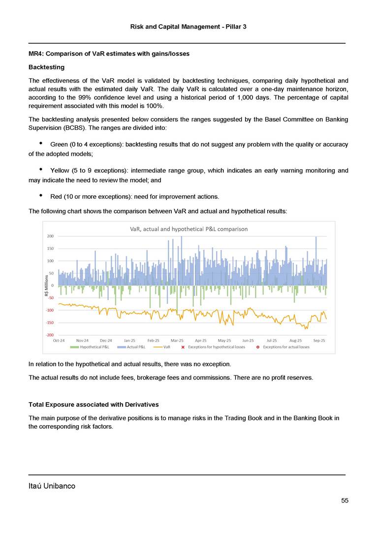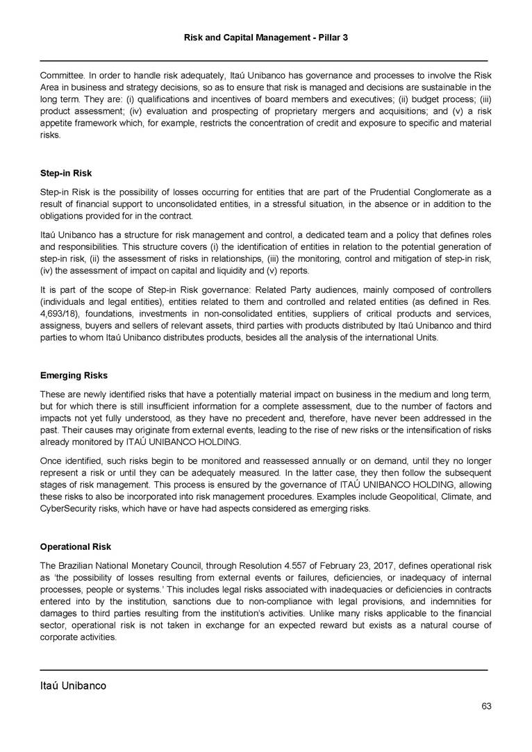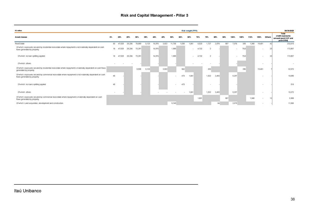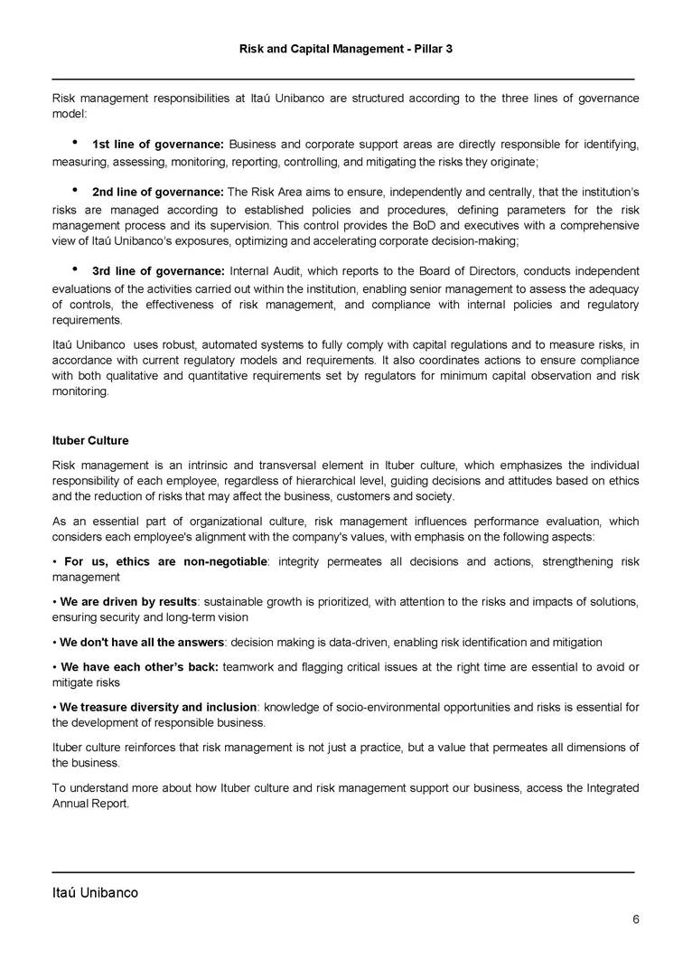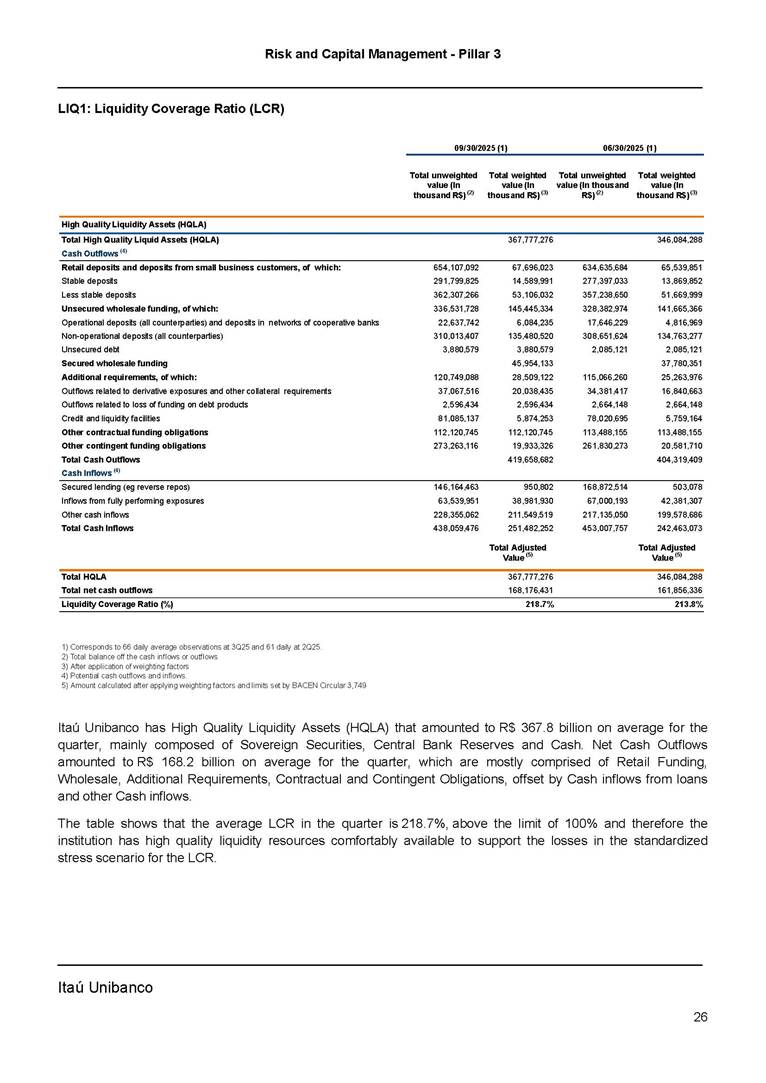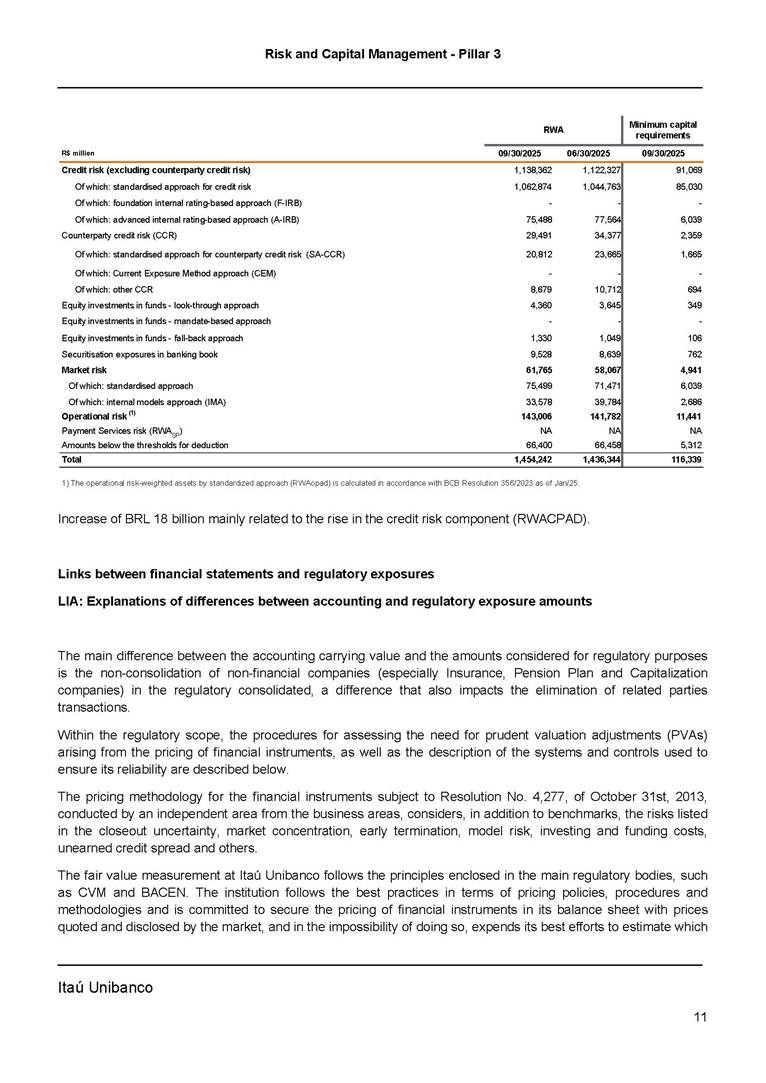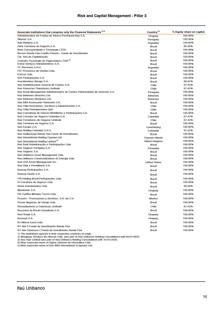 Risk and Capital Management - Pillar 3 Itaú Unibanco Holding S.A. Third Quarter of 2025 Objective 1 Key indicators 1 Prudential Metrics and Risk Management 2 KM1: Key metrics at consolidated level 2 OVA: Bank risk management approach 4 Scope and main characteristics of risk management 4 Risk and Capital Governance 5 Ituber Culture 6 Risk Appetite 7 Stress Testing 8 Recovery and Resolution Plan 8 Capital Adequacy Assessment 10 Capital Adequacy 10 OV1: Overview of risk-weighted assets (RWA) 10 Links between financial statements and regulatory exposures 11 LIA: Explanations of differences between accounting and regulatory exposure amounts 11 LI1: Differences between accounting and regulatory scopes of consolidation and mapping of financial statement categories with regulatory risk categories 12 LI2: Main sources of differences between regulatory exposure amounts and carrying values in financial statements 13 PV1: Prudent valuation adjustments (PVA) 13 Institutions that comprise the Financial Statement of Itaú Unibanco Holding 15 Non Consolidated Institutions 18 Material Entities 19 Composition of Capital 19 CCA: Main features of regulatory capital instuments 19 CC1: Composition of regulatory capital 20 CC2: Reconciliation of regulatory capital to balance sheet 22 Macroprudential Indicators 23 CCyB1: Geographical distribution of credit risk exposures considered in the calculation of the Countercyclical Capital Buffer 23 GSIB1: Disclosure of G-SIB indicators 23 Leverage Ratio 23 LR1: Summary comparison of accounting assets vs leverage ratio exposure measure (RA) 24 LR2: Leverage ratio common disclosure 24 Liquidity Ratios 25 LIQA: Liquidity Risk Management Information 25 Framework and Treatment 25 LIQ1: Liquidity Coverage Ratio (LCR) 26 LIQ2: Net Stable Funding Ratio (NSFR) 27 Credit Risk 28 CRA: Qualitative information on credit risk management 28 CR1: Credit Quality of Assets 29 CR2: Changes in Stock of defaulted loans and debts securities 30 CRB: Additional disclosure related to the credit quality of assets Credit risk mitigation 30 Exposure by industry 30 Exposure by remaining maturity 31 Overdue exposures 31 Exposure by geographical area in Brazil and by country 31 Largest debtors exposures 32 Restructured exposures 32 CRC: Qualitative disclosure related to Credit Risk Mitigation techniques 32 CR3: Credit Risk mitigation techniques – overview 33 CR4: Standardized Approach – Credit Risk exposure and credit risk mitigation effects 34 CR5: Standardized Approach – exposures by asset classes and risk weights 35 CRE: Qualitative disclosure related to IRB models 39 CR8: RWA flow statements of credit risk exposures under IRB 41 CMS1: Comparison of modelled and standardised RWA at risk level 41 Counterparty Credit Risk (CCR) 41 CCRA: Qualitative disclosure related to CCR 44 CCR1: Analysis of CCR exposures by approach 42 CCR3: Standardized approach – CCR exposures by regulatory portfolio and risk weights 42 CCR5: Composition of collateral for CCR exposures 42 CCR6: CCR associated with credit derivatives exposures 43 CCR8: CCR associated with Exposures to central counterparties 43 Securitization Exposures 43 SECA: Qualitative disclosure requirements related to securitisation exposures 43 SEC1: Securitisation exposures in the banking book 44 SEC2: Securitisation exposures in the trading book 44 SEC3: Securitisation exposures in the banking book and associated regulatory capital requirements – bank acting as originator or as sponsor 44 SEC4: Securitisation exposures in the banking book and associated capital requirements – bank acting as investor 44 Market Risk 45 MRA: Qualitative disclosure requirements related to market risk 45 MR1: Market risk under standardized approach 47 MRB: Qualitative disclosures on market risk in the Internal Models Approach (IMA) 47 MR2: RWA flow statements of market risk exposures under an IMA 51 Exposures subject to market risk 51 MR3: IMA values for trading portfolios 51 MR4: Comparison of VaR estimates with gains/losses 52 Backtesting 52 Total Exposure associated with Derivatives 52 IRRBB 53 IRRBBA: IRRBB risk management objectives and policies 53 Framework and Treatment 53 Other Risks 55 Insurance products, pension plans and premium bonds risks 55 Social, Environmental and Climatic Risks 55 Model Risk 56 Regulatory or Compliance Risk 57 Reputational Risk 57 Cyber Risk 59 Country Risk 59 Business and Strategy Risk 59 Step-in Risk 60 Emerging Risks 60 Operational Risk 60 Crisis Management and Operational Resilience 61 Independent Validation of Risk Models 62 Glossary of Acronyms 62 Glossary of Regulations 65 Risk and Capital Management - Pillar 3 __________________________________________________________________________________________ __________________________________________________________________________________________ Itaú Unibanco 1 Objective This document presents Itaú Unibanco Holding S.A. (Itaú Unibanco) information required by the Central Bank of Brazil (BACEN) through Resolution BCB nº 54 and subsequent amendments, which addresses the disclosure of information on risks and capital management, the comparison between accounting and prudential information, the liquidity and market risk indicators, the calculation of risk-weighted assets (RWA), the calculation of the Total Capital (“Patrimônio de Referência” - PR), and the compensation of management members. 1 The referred Resolution brought several amendments in the disclosure format of the Pillar 3 information, besides changes in the scope and frequency of the information disclosed. All these amendments, implemented by the Central Bank, aim the convergence of the Brazilian financial regulation to the recommendations of the Basel Committee, seeking to harmonize the information disclosed by financial institutions at an international level, and taking into account the structural conditions of the Brazilian economy. The disclosure policy of the Risk and Capital Management Report presents t