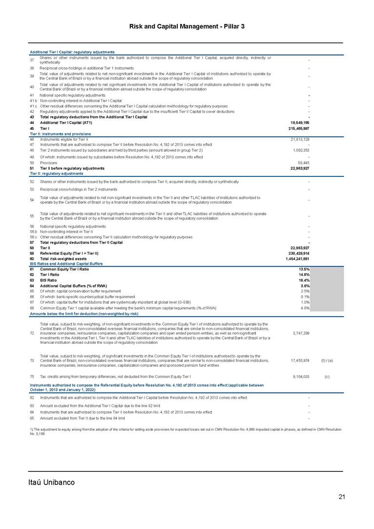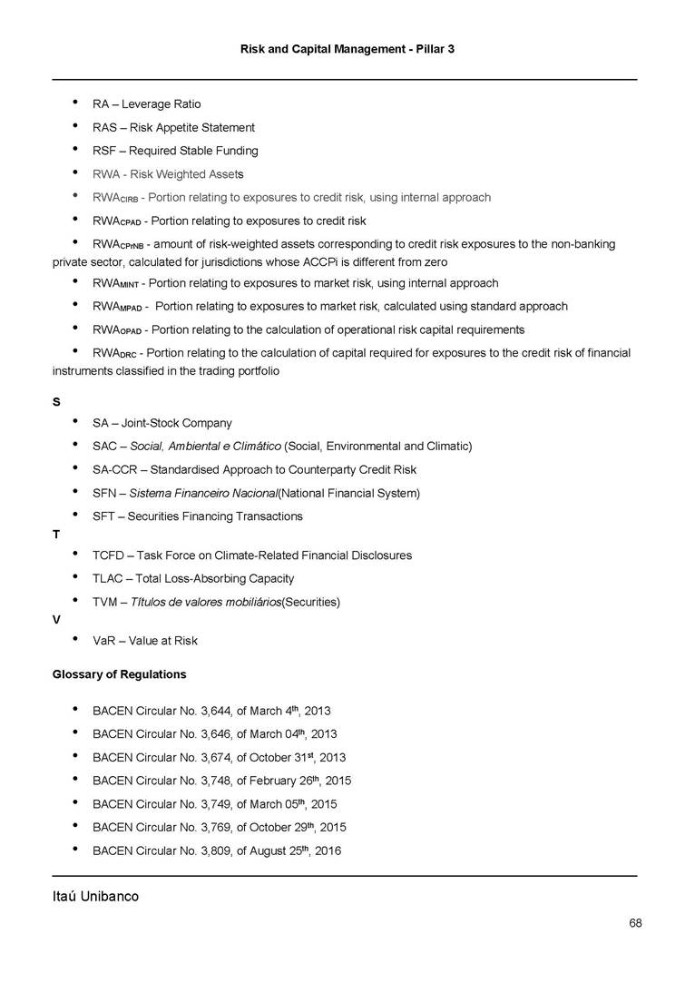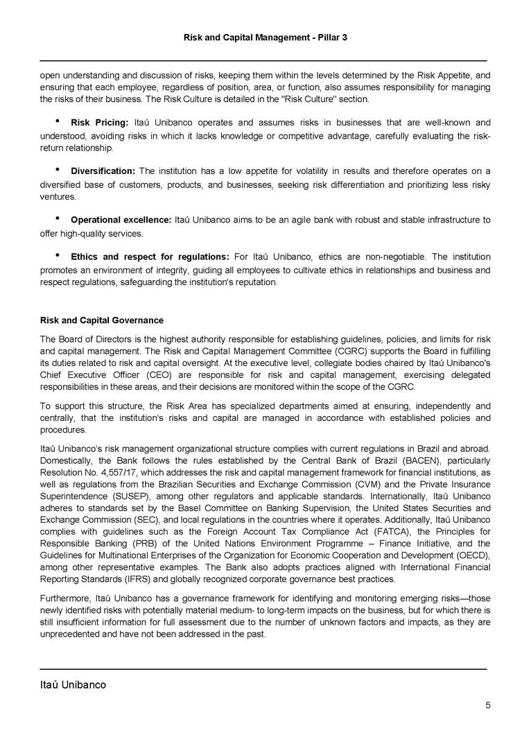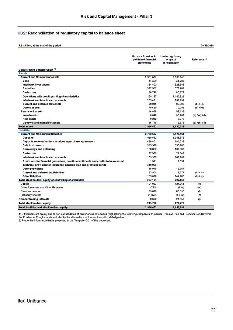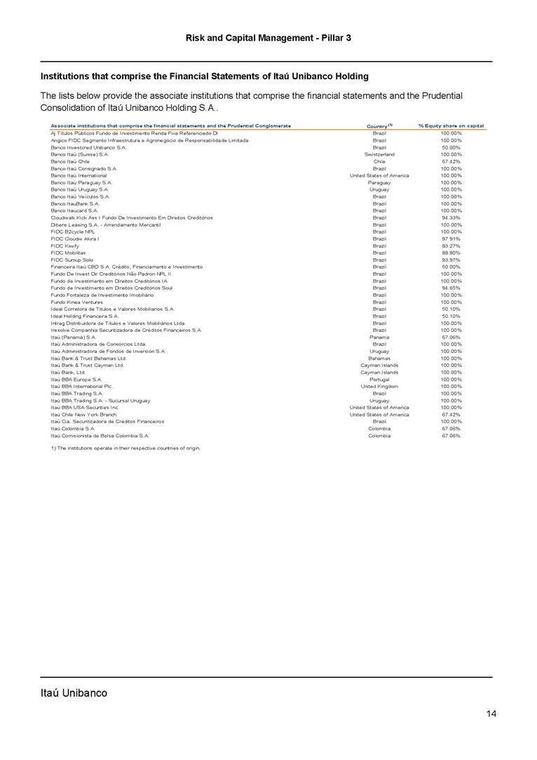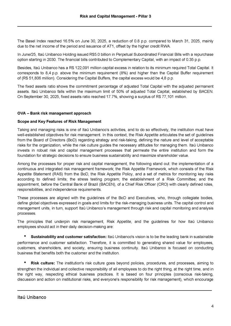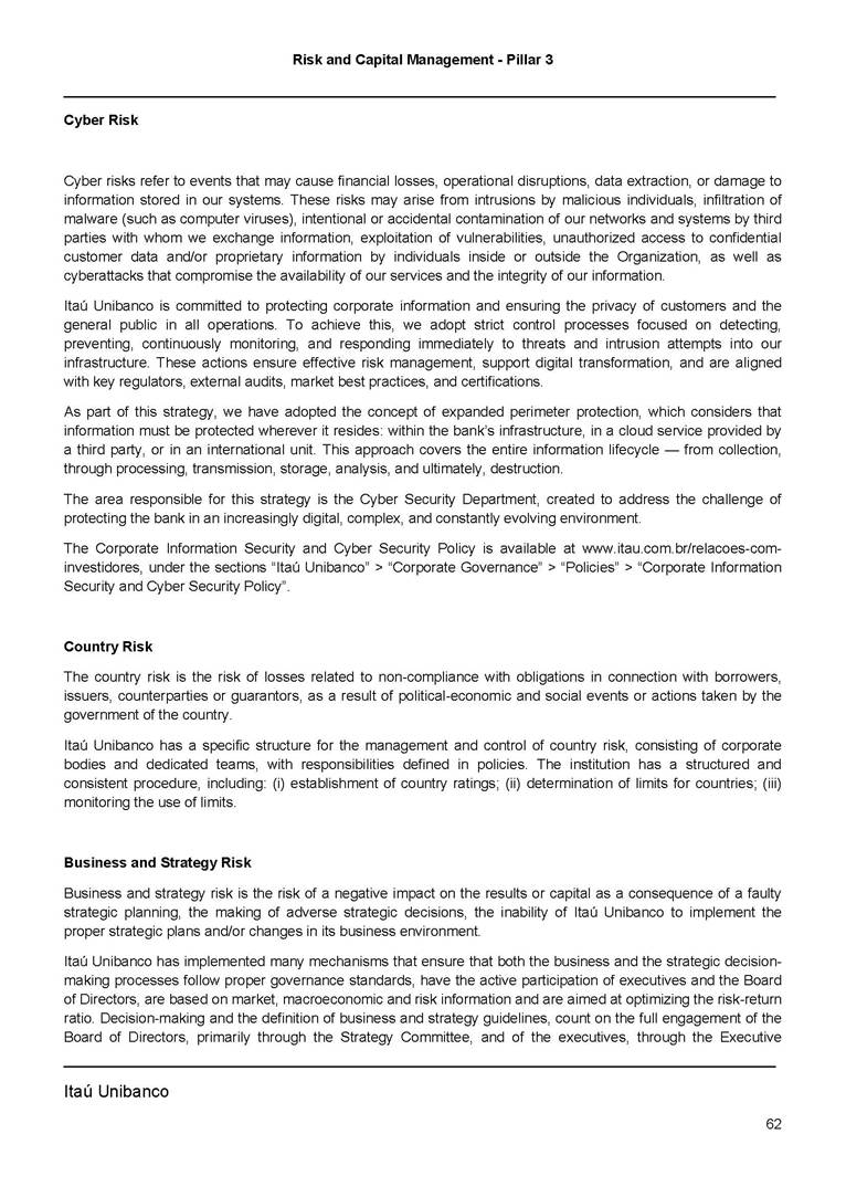Risk and Capital Management - Pillar 3 Itaú Unibanco Holding S.A. Third Quarter of 2025 Objective 1 Key indicators 1 Prudential Metrics and Risk Management 2 KM1: Key metrics at consolidated level 2 OVA: Bank risk management approach 4 Scope and main characteristics of risk management 4 Risk and Capital Governance 5 Ituber Culture 6 Risk Appetite 7 Stress Testing 8 Recovery and Resolution Plan 8 Capital Adequacy Assessment 10 Capital Adequacy 10 OV1: Overview of risk-weighted assets (RWA) 10 Links between financial statements and regulatory exposures 11 LIA: Explanations of differences between accounting and regulatory exposure amounts 11 LI1: Differences between accounting and regulatory scopes of consolidation and mapping of financial statement categories with regulatory risk categories 12 LI2: Main sources of differences between regulatory exposure amounts and carrying values in financial statements 13 PV1: Prudent valuation adjustments (PVA) 13 Institutions that comprise the Financial Statement of Itaú Unibanco Holding 15 Non Consolidated Institutions 18 Material Entities 19 Composition of Capital 19 CCA: Main features of regulatory capital instuments 19 CC1: Composition of regulatory capital 20 CC2: Reconciliation of regulatory capital to balance sheet 22 Macroprudential Indicators 23 CCyB1: Geographical distribution of credit risk exposures considered in the calculation of the Countercyclical Capital Buffer 23 GSIB1: Disclosure of G-SIB indicators 23 Leverage Ratio 23 LR1: Summary comparison of accounting assets vs leverage ratio exposure measure (RA) 24 LR2: Leverage ratio common disclosure 24 Liquidity Ratios 25 LIQA: Liquidity Risk Management Information 25 Framework and Treatment 25 LIQ1: Liquidity Coverage Ratio (LCR) 26 LIQ2: Net Stable Funding Ratio (NSFR) 27 Credit Risk 28 CRA: Qualitative information on credit risk management 28 CR1: Credit Quality of Assets 29 CR2: Changes in Stock of defaulted loans and debts securities 30 CRB: Additional disclosure related to the credit quality of assets Credit risk mitigation 30 Exposure by industry 30 Exposure by remaining maturity 31 Overdue exposures 31 Exposure by geographical area in Brazil and by country 31 Largest debtors exposures 32 Restructured exposures 32 CRC: Qualitative disclosure related to Credit Risk Mitigation techniques 32 CR3: Credit Risk mitigation techniques – overview 33 CR4: Standardized Approach – Credit Risk exposure and credit risk mitigation effects 34 CR5: Standardized Approach – exposures by asset classes and risk weights 35 CRE: Qualitative disclosure related to IRB models 39 CR8: RWA flow statements of credit risk exposures under IRB 41 CMS1: Comparison of modelled and standardised RWA at risk level 41 Counterparty Credit Risk (CCR) 41 CCRA: Qualitative disclosure related to CCR 44 CCR1: Analysis of CCR exposures by approach 42 CCR3: Standardized approach – CCR exposures by regulatory portfolio and risk weights 42 CCR5: Composition of collateral for CCR exposures 42 CCR6: CCR associated with credit derivatives exposures 43 CCR8: CCR associated with Exposures to central counterparties 43 Securitization Exposures 43 SECA: Qualitative disclosure requirements related to securitisation exposures 43 SEC1: Securitisation exposures in the banking book 44 SEC2: Securitisation exposures in the trading book 44 SEC3: Securitisation exposures in the banking book and associated regulatory capital requirements – bank acting as originator or as sponsor 44 SEC4: Securitisation exposures in the banking book and associated capital requirements – bank acting as investor 44 Market Risk 45 MRA: Qualitative disclosure requirements related to market risk 45 MR1: Market risk under standardized approach 47 MRB: Qualitative disclosures on market risk in the Internal Models Approach (IMA) 47 MR2: RWA flow statements of market risk exposures under an IMA 51 Exposures subject to market risk 51 MR3: IMA values for trading portfolios 51 MR4: Comparison of VaR estimates with gains/losses 52 Backtesting 52 Total Exposure associated with Derivatives 52 IRRBB 53 IRRBBA: IRRBB risk management objectives and policies 53 Framework and Treatment 53 Other Risks 55 Insurance products, pension plans and premium bonds risks 55 Social, Environmental and Climatic Risks 55 Model Risk 56 Regulatory or Compliance Risk 57 Reputational Risk 57 Cyber Risk 59 Country Risk 59 Business and Strategy Risk 59 Step-in Risk 60 Emerging Risks 60 Operational Risk 60 Crisis Management and Operational Resilience 61 Independent Validation of Risk Models 62 Glossary of Acronyms 62 Glossary of Regulations 65 Risk and Capital Management - Pillar 3 __________________________________________________________________________________________ __________________________________________________________________________________________ Itaú Unibanco 1 Objective This document presents Itaú Unibanco Holding S.A. (Itaú Unibanco) information required by the Central Bank of Brazil (BACEN) through Resolution BCB nº 54 and subsequent amendments, which addresses the disclosure of information on risks and capital management, the comparison between accounting and prudential information, the liquidity and market risk indicators, the calculation of risk-weighted assets (RWA), the calculation of the Total Capital (“Patrimônio de Referência” - PR), and the compensation of management members. 1 The referred Resolution brought several amendments in the disclosure format of the Pillar 3 information, besides changes in the scope and frequency of the information disclosed. All these amendments, implemented by the Central Bank, aim the convergence of the Brazilian financial regulation to the recommendations of the Basel Committee, seeking to harmonize the information disclosed by financial institutions at an international level, and taking into account the structural conditions of the Brazilian economy. The disclosure policy of the Risk and Capital Management Report presents t