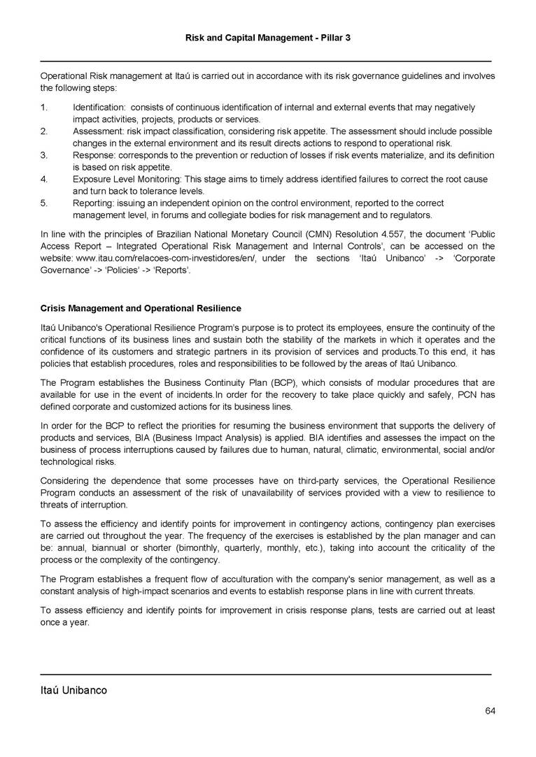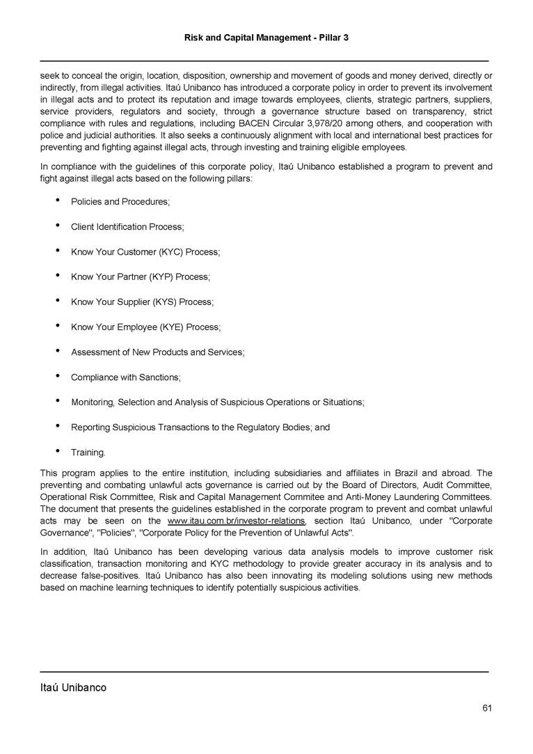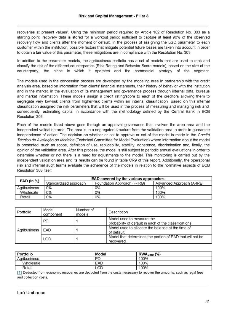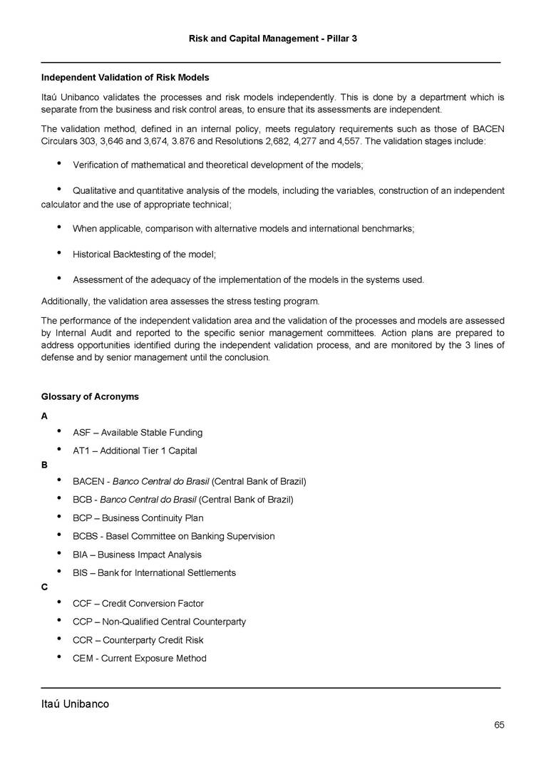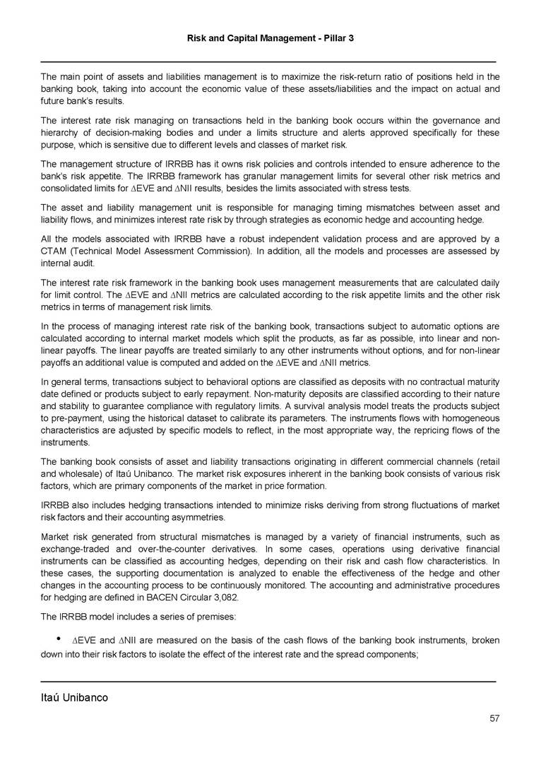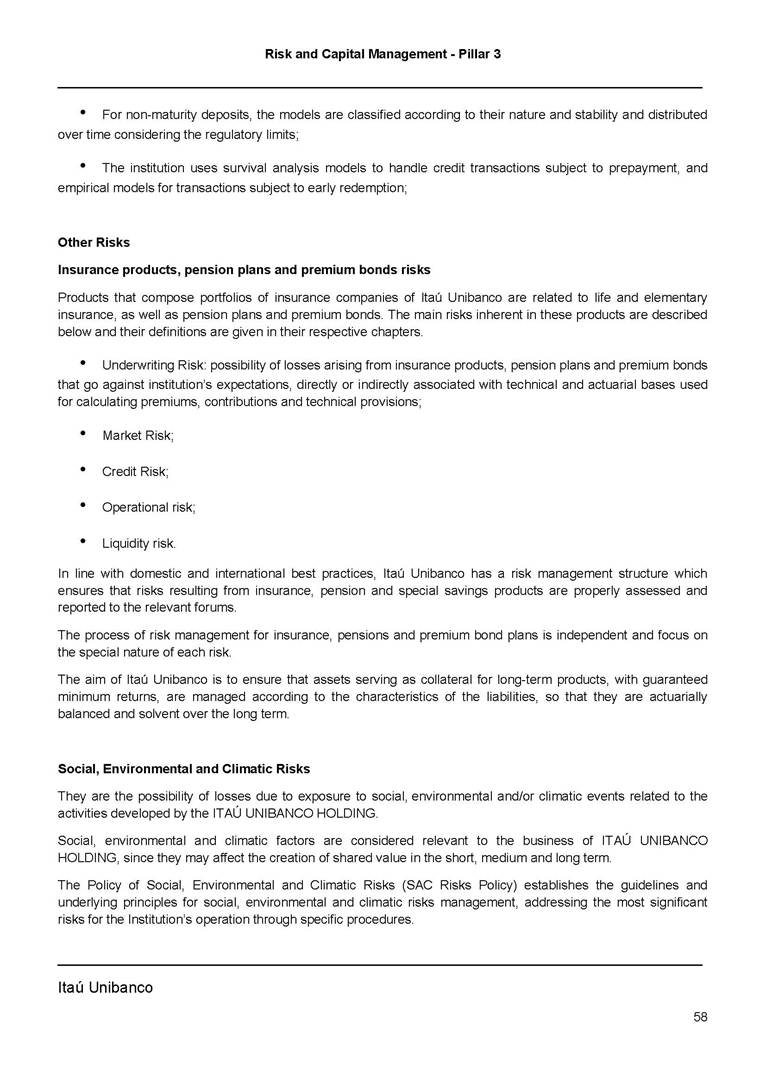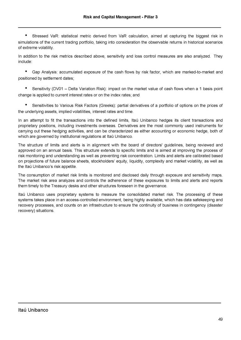Risk and Capital Management - Pillar 3 Itaú Unibanco Holding S.A. Third Quarter of 2025 Objective 1 Key indicators 1 Prudential Metrics and Risk Management 2 KM1: Key metrics at consolidated level 2 OVA: Bank risk management approach 4 Scope and main characteristics of risk management 4 Risk and Capital Governance 5 Ituber Culture 6 Risk Appetite 7 Stress Testing 8 Recovery and Resolution Plan 8 Capital Adequacy Assessment 10 Capital Adequacy 10 OV1: Overview of risk-weighted assets (RWA) 10 Links between financial statements and regulatory exposures 11 LIA: Explanations of differences between accounting and regulatory exposure amounts 11 LI1: Differences between accounting and regulatory scopes of consolidation and mapping of financial statement categories with regulatory risk categories 12 LI2: Main sources of differences between regulatory exposure amounts and carrying values in financial statements 13 PV1: Prudent valuation adjustments (PVA) 13 Institutions that comprise the Financial Statement of Itaú Unibanco Holding 15 Non Consolidated Institutions 18 Material Entities 19 Composition of Capital 19 CCA: Main features of regulatory capital instuments 19 CC1: Composition of regulatory capital 20 CC2: Reconciliation of regulatory capital to balance sheet 22 Macroprudential Indicators 23 CCyB1: Geographical distribution of credit risk exposures considered in the calculation of the Countercyclical Capital Buffer 23 GSIB1: Disclosure of G-SIB indicators 23 Leverage Ratio 23 LR1: Summary comparison of accounting assets vs leverage ratio exposure measure (RA) 24 LR2: Leverage ratio common disclosure 24 Liquidity Ratios 25 LIQA: Liquidity Risk Management Information 25 Framework and Treatment 25 LIQ1: Liquidity Coverage Ratio (LCR) 26 LIQ2: Net Stable Funding Ratio (NSFR) 27 Credit Risk 28 CRA: Qualitative information on credit risk management 28 CR1: Credit Quality of Assets 29 CR2: Changes in Stock of defaulted loans and debts securities 30 CRB: Additional disclosure related to the credit quality of assets Credit risk mitigation 30 Exposure by industry 30 Exposure by remaining maturity 31 Overdue exposures 31 Exposure by geographical area in Brazil and by country 31 Largest debtors exposures 32 Restructured exposures 32 CRC: Qualitative disclosure related to Credit Risk Mitigation techniques 32 CR3: Credit Risk mitigation techniques – overview 33 CR4: Standardized Approach – Credit Risk exposure and credit risk mitigation effects 34 CR5: Standardized Approach – exposures by asset classes and risk weights 35 CRE: Qualitative disclosure related to IRB models 39 CR8: RWA flow statements of credit risk exposures under IRB 41 CMS1: Comparison of modelled and standardised RWA at risk level 41 Counterparty Credit Risk (CCR) 41 CCRA: Qualitative disclosure related to CCR 44 CCR1: Analysis of CCR exposures by approach 42 CCR3: Standardized approach – CCR exposures by regulatory portfolio and risk weights 42 CCR5: Composition of collateral for CCR exposures 42 CCR6: CCR associated with credit derivatives exposures 43 CCR8: CCR associated with Exposures to central counterparties 43 Securitization Exposures 43 SECA: Qualitative disclosure requirements related to securitisation exposures 43 SEC1: Securitisation exposures in the banking book 44 SEC2: Securitisation exposures in the trading book 44 SEC3: Securitisation exposures in the banking book and associated regulatory capital requirements – bank acting as originator or as sponsor 44 SEC4: Securitisation exposures in the banking book and associated capital requirements – bank acting as investor 44 Market Risk 45 MRA: Qualitative disclosure requirements related to market risk 45 MR1: Market risk under standardized approach 47 MRB: Qualitative disclosures on market risk in the Internal Models Approach (IMA) 47 MR2: RWA flow statements of market risk exposures under an IMA 51 Exposures subject to market risk 51 MR3: IMA values for trading portfolios 51 MR4: Comparison of VaR estimates with gains/losses 52 Backtesting 52 Total Exposure associated with Derivatives 52 IRRBB 53 IRRBBA: IRRBB risk management objectives and policies 53 Framework and Treatment 53 Other Risks 55 Insurance products, pension plans and premium bonds risks 55 Social, Environmental and Climatic Risks 55 Model Risk 56 Regulatory or Compliance Risk 57 Reputational Risk 57 Cyber Risk 59 Country Risk 59 Business and Strategy Risk 59 Step-in Risk 60 Emerging Risks 60 Operational Risk 60 Crisis Management and Operational Resilience 61 Independent Validation of Risk Models 62 Glossary of Acronyms 62 Glossary of Regulations 65 Risk and Capital Management - Pillar 3 __________________________________________________________________________________________ __________________________________________________________________________________________ Itaú Unibanco 1 Objective This document presents Itaú Unibanco Holding S.A. (Itaú Unibanco) information required by the Central Bank of Brazil (BACEN) through Resolution BCB nº 54 and subsequent amendments, which addresses the disclosure of information on risks and capital management, the comparison between accounting and prudential information, the liquidity and market risk indicators, the calculation of risk-weighted assets (RWA), the calculation of the Total Capital (“Patrimônio de Referência” - PR), and the compensation of management members. 1 The referred Resolution brought several amendments in the disclosure format of the Pillar 3 information, besides changes in the scope and frequency of the information disclosed. All these amendments, implemented by the Central Bank, aim the convergence of the Brazilian financial regulation to the recommendations of the Basel Committee, seeking to harmonize the information disclosed by financial institutions at an international level, and taking into account the structural conditions of the Brazilian economy. The disclosure policy of the Risk and Capital Management Report presents t