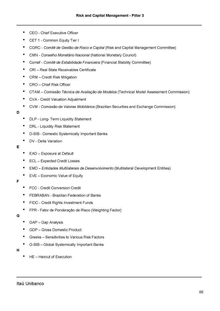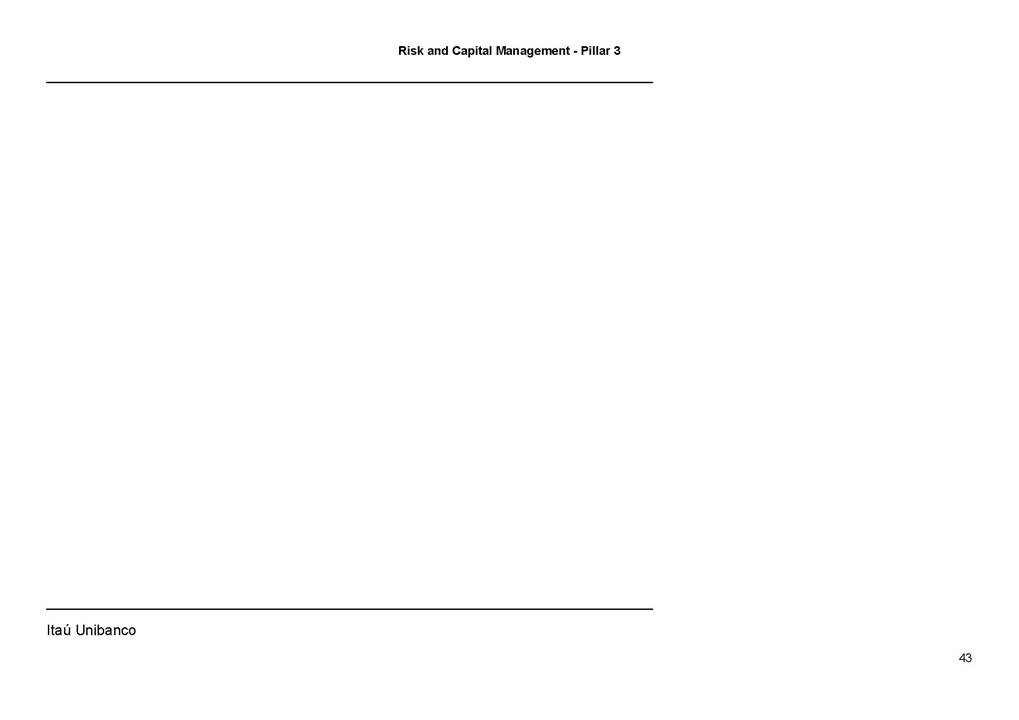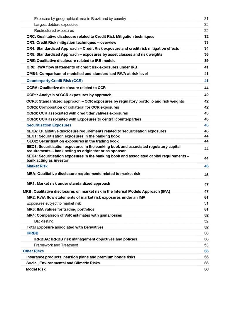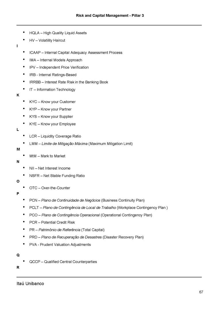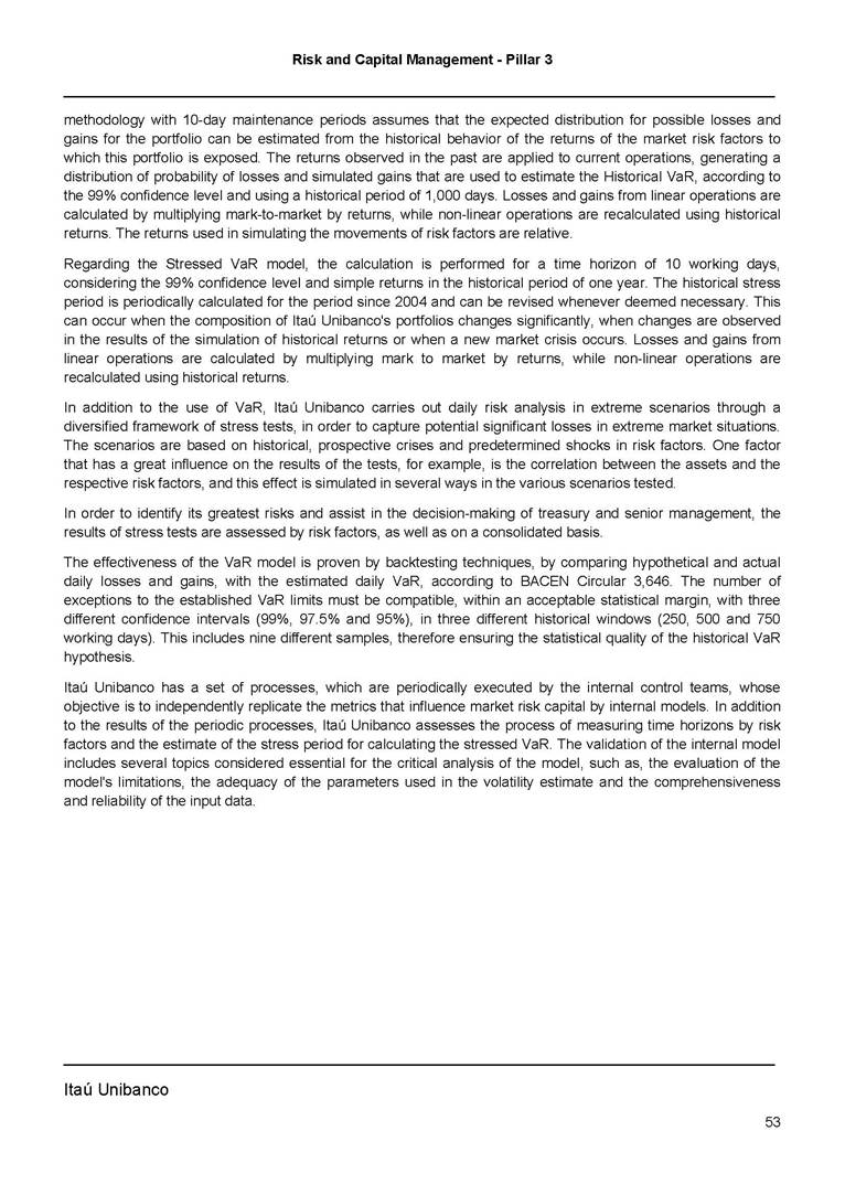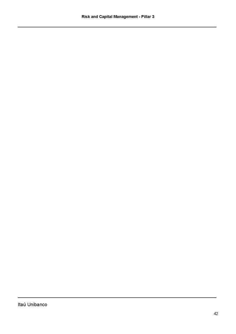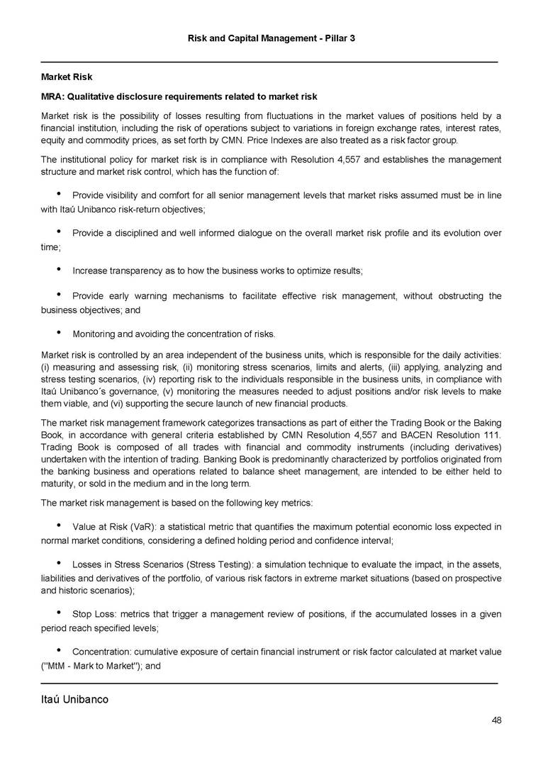 Risk and Capital Management - Pillar 3 Itaú Unibanco Holding S.A. Third Quarter of 2025 Objective 1 Key indicators 1 Prudential Metrics and Risk Management 2 KM1: Key metrics at consolidated level 2 OVA: Bank risk management approach 4 Scope and main characteristics of risk management 4 Risk and Capital Governance 5 Ituber Culture 6 Risk Appetite 7 Stress Testing 8 Recovery and Resolution Plan 8 Capital Adequacy Assessment 10 Capital Adequacy 10 OV1: Overview of risk-weighted assets (RWA) 10 Links between financial statements and regulatory exposures 11 LIA: Explanations of differences between accounting and regulatory exposure amounts 11 LI1: Differences between accounting and regulatory scopes of consolidation and mapping of financial statement categories with regulatory risk categories 12 LI2: Main sources of differences between regulatory exposure amounts and carrying values in financial statements 13 PV1: Prudent valuation adjustments (PVA) 13 Institutions that comprise the Financial Statement of Itaú Unibanco Holding 15 Non Consolidated Institutions 18 Material Entities 19 Composition of Capital 19 CCA: Main features of regulatory capital instuments 19 CC1: Composition of regulatory capital 20 CC2: Reconciliation of regulatory capital to balance sheet 22 Macroprudential Indicators 23 CCyB1: Geographical distribution of credit risk exposures considered in the calculation of the Countercyclical Capital Buffer 23 GSIB1: Disclosure of G-SIB indicators 23 Leverage Ratio 23 LR1: Summary comparison of accounting assets vs leverage ratio exposure measure (RA) 24 LR2: Leverage ratio common disclosure 24 Liquidity Ratios 25 LIQA: Liquidity Risk Management Information 25 Framework and Treatment 25 LIQ1: Liquidity Coverage Ratio (LCR) 26 LIQ2: Net Stable Funding Ratio (NSFR) 27 Credit Risk 28 CRA: Qualitative information on credit risk management 28 CR1: Credit Quality of Assets 29 CR2: Changes in Stock of defaulted loans and debts securities 30 CRB: Additional disclosure related to the credit quality of assets Credit risk mitigation 30 Exposure by industry 30 Exposure by remaining maturity 31 Overdue exposures 31 Exposure by geographical area in Brazil and by country 31 Largest debtors exposures 32 Restructured exposures 32 CRC: Qualitative disclosure related to Credit Risk Mitigation techniques 32 CR3: Credit Risk mitigation techniques – overview 33 CR4: Standardized Approach – Credit Risk exposure and credit risk mitigation effects 34 CR5: Standardized Approach – exposures by asset classes and risk weights 35 CRE: Qualitative disclosure related to IRB models 39 CR8: RWA flow statements of credit risk exposures under IRB 41 CMS1: Comparison of modelled and standardised RWA at risk level 41 Counterparty Credit Risk (CCR) 41 CCRA: Qualitative disclosure related to CCR 44 CCR1: Analysis of CCR exposures by approach 42 CCR3: Standardized approach – CCR exposures by regulatory portfolio and risk weights 42 CCR5: Composition of collateral for CCR exposures 42 CCR6: CCR associated with credit derivatives exposures 43 CCR8: CCR associated with Exposures to central counterparties 43 Securitization Exposures 43 SECA: Qualitative disclosure requirements related to securitisation exposures 43 SEC1: Securitisation exposures in the banking book 44 SEC2: Securitisation exposures in the trading book 44 SEC3: Securitisation exposures in the banking book and associated regulatory capital requirements – bank acting as originator or as sponsor 44 SEC4: Securitisation exposures in the banking book and associated capital requirements – bank acting as investor 44 Market Risk 45 MRA: Qualitative disclosure requirements related to market risk 45 MR1: Market risk under standardized approach 47 MRB: Qualitative disclosures on market risk in the Internal Models Approach (IMA) 47 MR2: RWA flow statements of market risk exposures under an IMA 51 Exposures subject to market risk 51 MR3: IMA values for trading portfolios 51 MR4: Comparison of VaR estimates with gains/losses 52 Backtesting 52 Total Exposure associated with Derivatives 52 IRRBB 53 IRRBBA: IRRBB risk management objectives and policies 53 Framework and Treatment 53 Other Risks 55 Insurance products, pension plans and premium bonds risks 55 Social, Environmental and Climatic Risks 55 Model Risk 56 Regulatory or Compliance Risk 57 Reputational Risk 57 Cyber Risk 59 Country Risk 59 Business and Strategy Risk 59 Step-in Risk 60 Emerging Risks 60 Operational Risk 60 Crisis Management and Operational Resilience 61 Independent Validation of Risk Models 62 Glossary of Acronyms 62 Glossary of Regulations 65 Risk and Capital Management - Pillar 3 __________________________________________________________________________________________ __________________________________________________________________________________________ Itaú Unibanco 1 Objective This document presents Itaú Unibanco Holding S.A. (Itaú Unibanco) information required by the Central Bank of Brazil (BACEN) through Resolution BCB nº 54 and subsequent amendments, which addresses the disclosure of information on risks and capital management, the comparison between accounting and prudential information, the liquidity and market risk indicators, the calculation of risk-weighted assets (RWA), the calculation of the Total Capital (“Patrimônio de Referência” - PR), and the compensation of management members. 1 The referred Resolution brought several amendments in the disclosure format of the Pillar 3 information, besides changes in the scope and frequency of the information disclosed. All these amendments, implemented by the Central Bank, aim the convergence of the Brazilian financial regulation to the recommendations of the Basel Committee, seeking to harmonize the information disclosed by financial institutions at an international level, and taking into account the structural conditions of the Brazilian economy. The disclosure policy of the Risk and Capital Management Report presents t