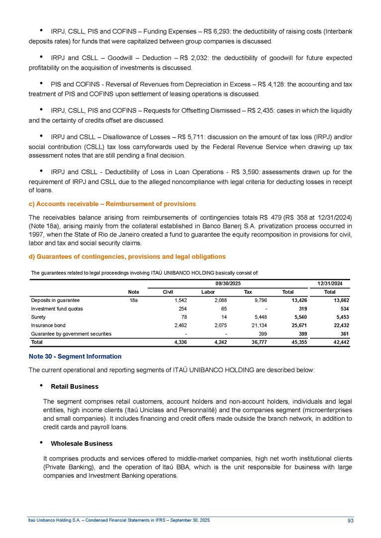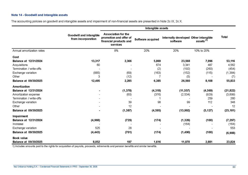 Condensed Financial Statements in IFRS Itaú Unibanco Holding S.A. September 30, 2025 Itaú Day 2025 We held the 5th edition of Itaú Day, an event in which we shared with the market information about the evolution of our business and its impact on our clients’ experience. Itaú Day was attended by the Co-chairmen of the Board of Directors and all members of the Executive Committee. More than 35,000 people have already watched the event, which is available on our Investor Relations website. Management Report 9M25 Key indicators and ratios of our performance from January to September 2025 over the same period of the previous year: Highlights of the first nine months of 2025 Access the full content Recurring Result R$33.1 billion 9M24 8.8% Credit Portfolio1 R$1.4 trillion 9M24 6.1% ROE Recurring 21.1% 9M24 stable Net interest Income2 R$91.8 billion 38.8% Efficiency Ratio3 14.8% Tier 1 Capital Ratio4 13.8% -30 bps -40 bps The credit portfolio1 expanded in Brazil: 6.0% in individuals and 8.7% in companies. There was decrease of 1.2% in Latin America. The 13.8% growth in net interest income² was mainly related to: (i) higher revenues with loan operations, due to higher volume; and (ii) in interbank deposits. The expected credit loss from financial assets increased by 13.9% due to higher expected credit loss with loan and lease operations. General and administrative expenses decreased by 4.8%, mainly due to the reduction in selling of non-financial products, provision for tax and social security lawsuits and other risks. Our accumulated efficiency ratio³ in the first nine months of 2025 decreased 30 bps and stood at 38.8%. (1) Credit portfolio includes financial guarantees provided and private securities. (2) The sum of (i) Interest and Similar Income, (ii) Interest and Similar Expenses, (iii) Income of Financial Assets and Liabilities at Fair Value through Profit or Loss, (iv) Foreign exchange results and exchange variations in foreign transactions. For better comparability, the tax effects of managerial adjustments were reclassified. (3) Efficiency ratio based in BRGAAP managerial disclosure. (4) Considering the limit of 1.5% for AT1, according to CMN Res. No. 4,958. Without this limit, the Tier I Capital Ratio would be 15.3% in Sep-24. Increase of 2.9% in commissions and banking fees and income from insurance and private pension contracts, as a result of the 30.4% increase in income from insurance and private pension contracts, due to the higher financial result for the period and higher insurance sales, mainly related to life and credit life, partially offset by the 1.2% reduction in commissions and banking fees, due to the higher revenues related to current account services, payments and collections and investment banking activities. Performance 9M25 X 9M24 2 3 (1) The sum of (i) Interest and Similar Income, (ii) Interest and Similar Expenses, (iii) Income of Financial Assets and Liabilities at Fair Value through Profit or Loss, (iv) Foreign exchange results and exchange variations in foreign transactions, (v) Commissions and Banking Fees, (vi) Income from Insurance Contracts and Private Pension, net of Reinsurance, and (vii) Other Income. For better comparability, the tax effects of managerial adjustments were reclassified. (2) The sum of (i) Interest and Similar Income, (ii) Interest and Similar Expenses, (iii) Income of Financial Assets and Liabilities at Fair Value through Profit or Loss, (iv) Foreign exchange results and exchange variations in foreign transactions. For better comparability, the tax effects of managerial adjustments were reclassified. (3) The sum on the Commissions and Banking Fees and Income from Insurance Contracts and Private Pension, net of Reinsurance. (4) The Return is calculated by dividing the Net income attributable to owners of the parent company by the Average Stockholders’ Equity. The quotient was multiplied by the number of periods in the year to derive the annualized rate. (5) The return is calculated by dividing the Recurring Result by the Average Stockholders’ Equity. The quotient was multiplied by the number of periods in the year to derive the annualized rate. (6) Source: Bloomberg. (7) The number of outstanding shares has been adjusted to reflect the 10% bonus that took place on March 20, 2025. Therefore, the indicators per share were reclassified. We present below the key indicators comprising our results: In R$ billions Income information 9M25 9M24 Variation Operating Revenues1 Net Interest Income2 Commissions and Banking Fees and Income from Insurance and Private Pension Contracts3 Expected Credit Loss from Financial Assets General and Administrative Expenses Net Income Net Income Attributable to Owners of the Parent Company Recurring Result Return on Average Equity - Annualized4 Recurring Return on Average Equity - Annualized5 Shares 9M257 9M24 7 Variation Net Income per Share - R$ Book Value per Share - R$ (in circulation on 09/30) Dividends and Interest on Own Capital net of Taxes per Share - R$ Average Financial Daily Trading Volume B3 (ON+PN) NYSE (ADR) Market Capitalization6 133.0 91.8 41.1 (24.9) (59.2) 33.7 33.0 33.1 21.0% 21.1% 130.0 80.6 40.0 (21.8) (62.2) 31.0 30.3 30.5 20.9% 21.1% 2.3% 13.8% 2.9% 13.9% -4.8% 8.7% 8.9% 8.8% 10 bps stable 3.06 20.02 0.75 1.8 0.8 1.0 397.2 2.81 18.69 0.71 1.4 0.8 0.6 330.8 8.9% 7.1% 4.9% 29.0% 2.5% 64.6% 20.1% 4 Know more Know more Know more We created a focused structure for crypto fund management Through Itaú Asset, we created our first dedicated structure for cryptoassets. This initiative reinforces our commitment to delivering innovative and tailored solutions to our clients, offering products that cover all allocation possibilities in the financial market. Our new crypto-focused team is now part of the Multimesas structure (similar to multi-asset), which includes more than 130 investment professionals. We are the first bank to offer Pix for small and medium-sized businesses using the Guaran