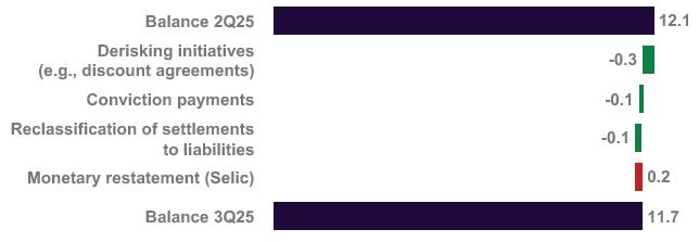 Compulsory Loan: the provision inventory was reduced by R$ 2.7 billion YoY and R$ 362 million sequentially, totaling R$ 11.7 billion in 3Q25. Agreements reached and favorable decisions led to a net reversal of R$ 300 million in the quarter.