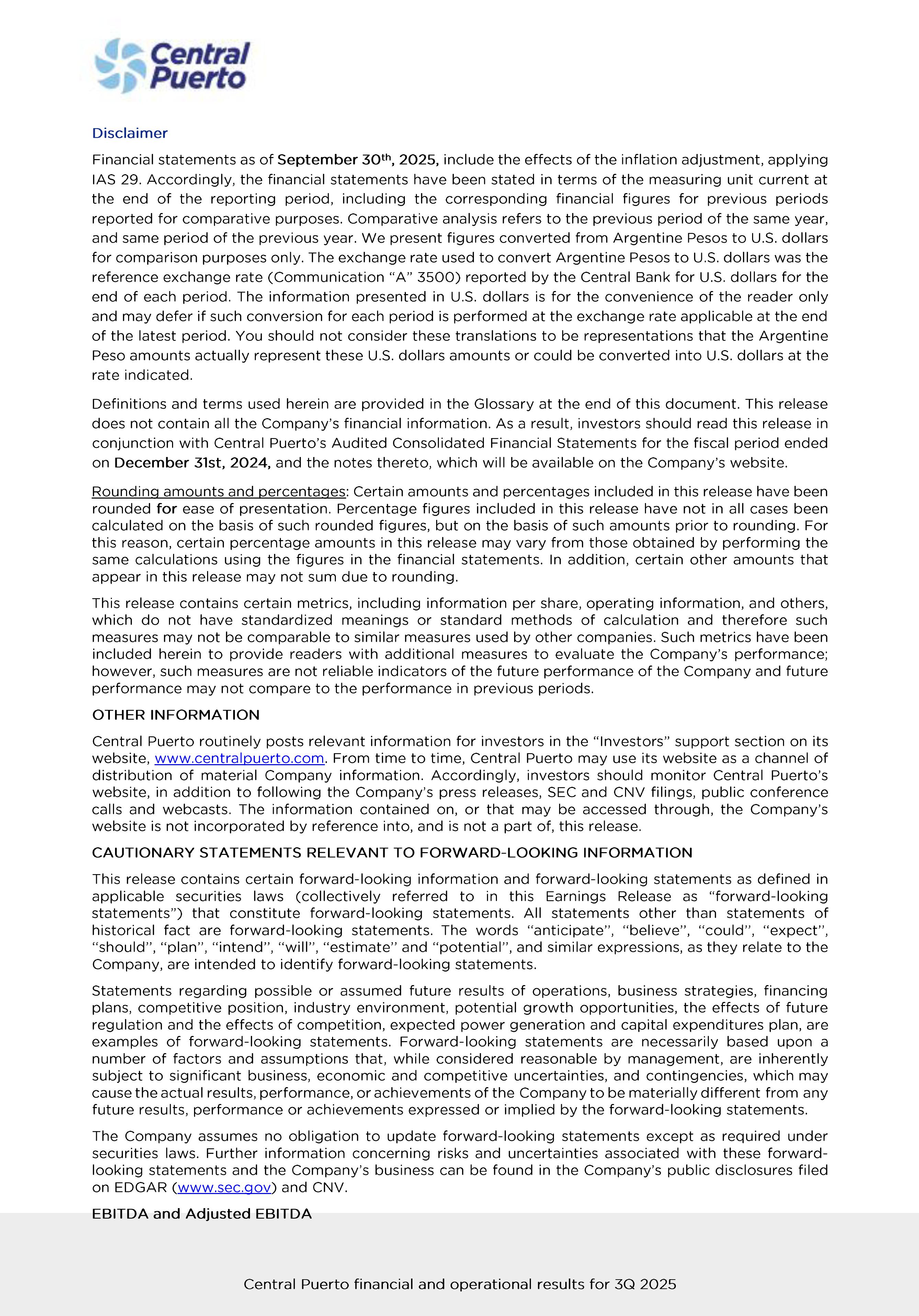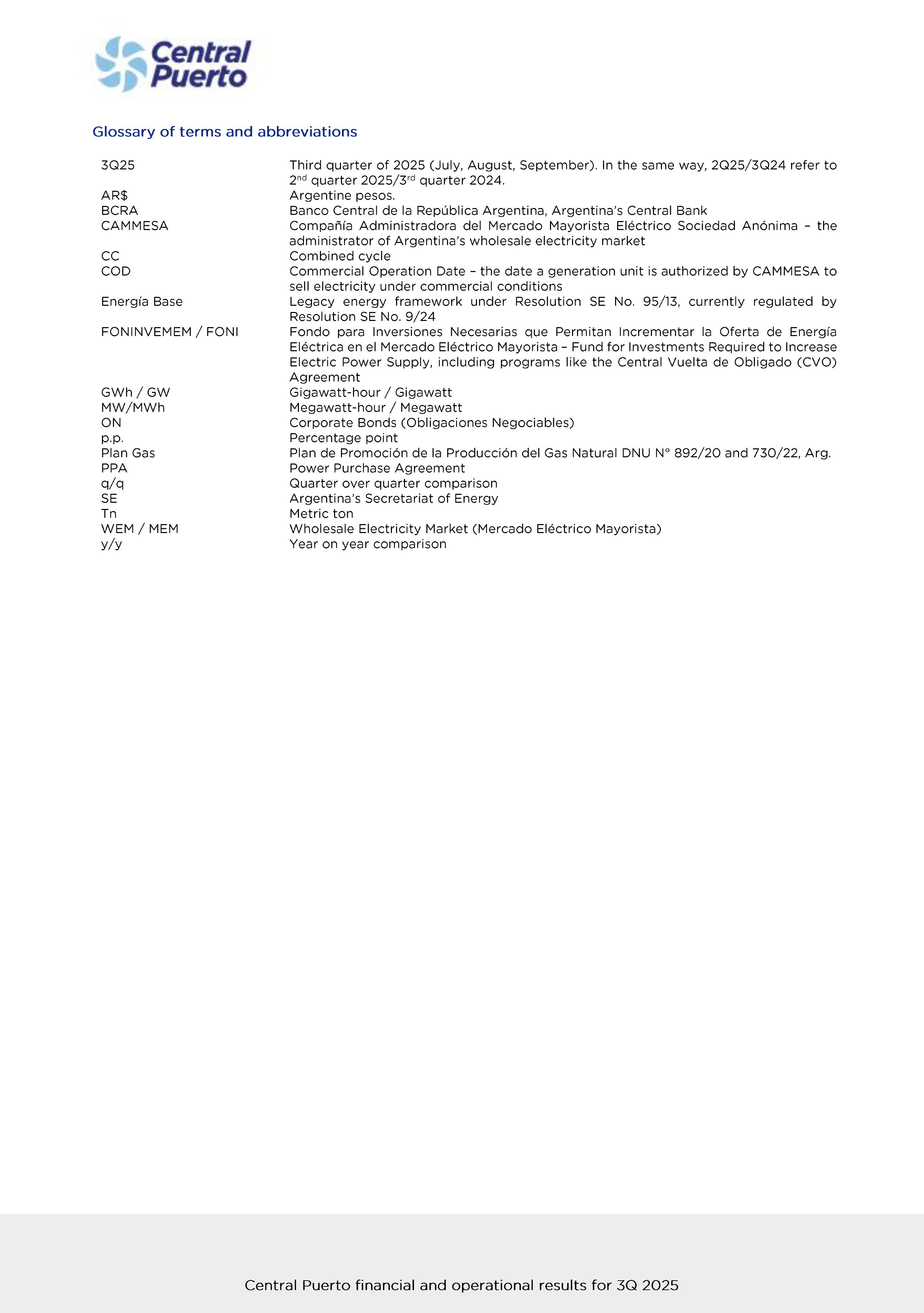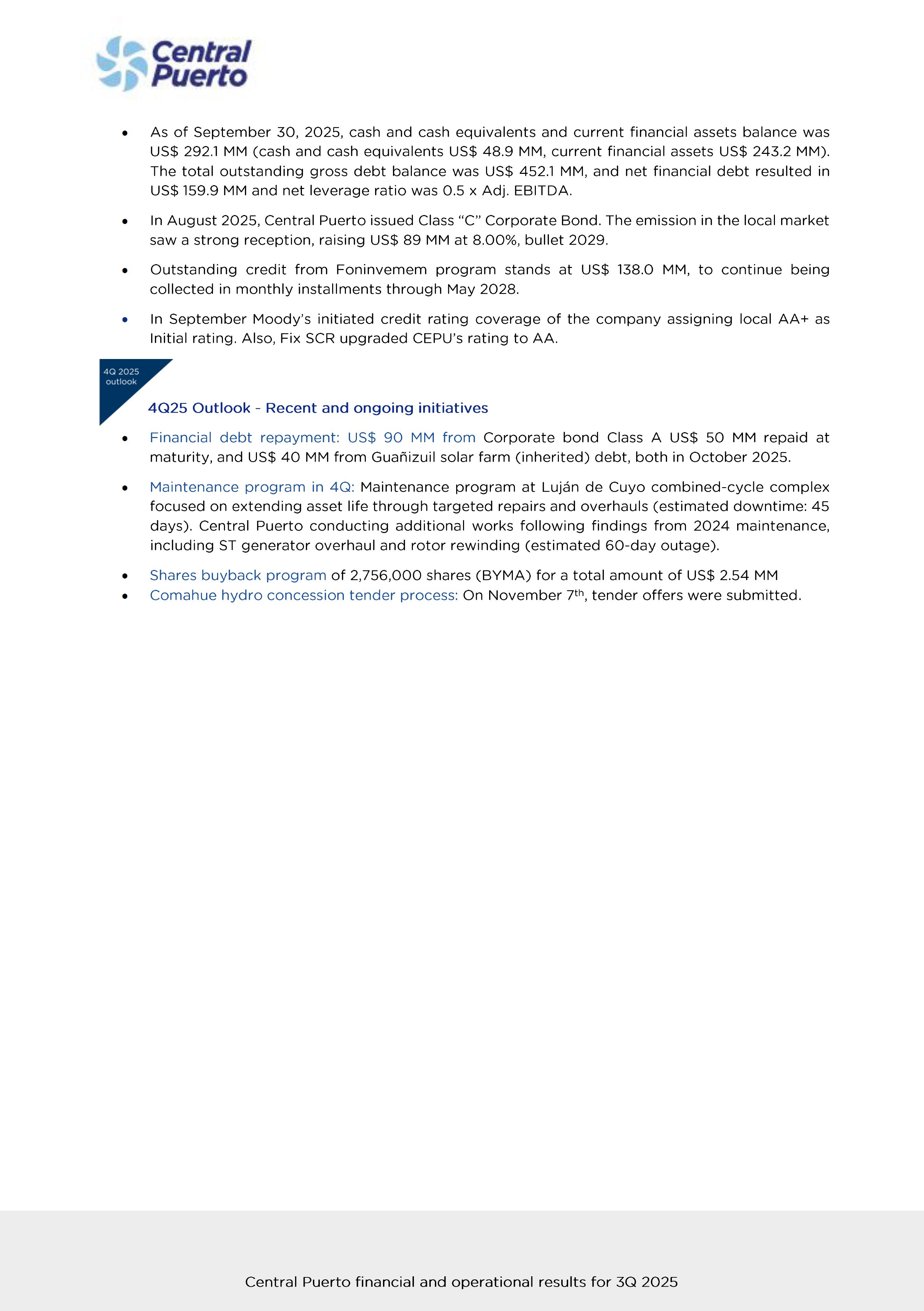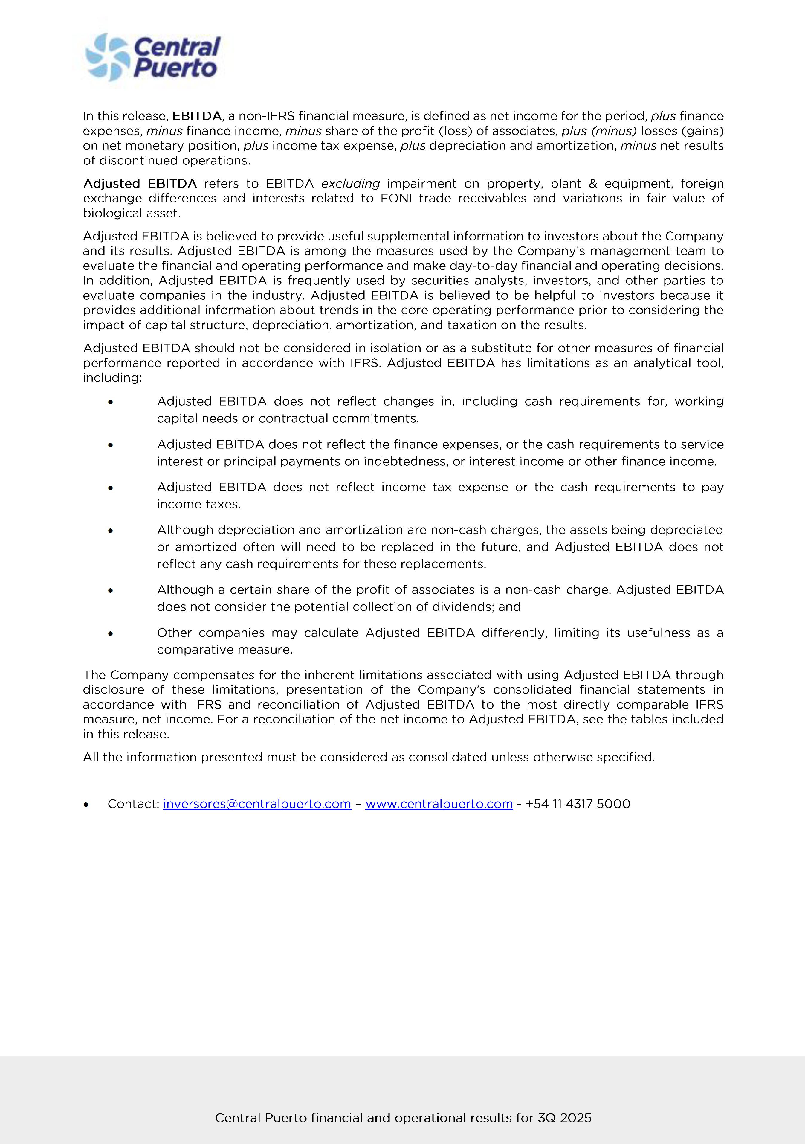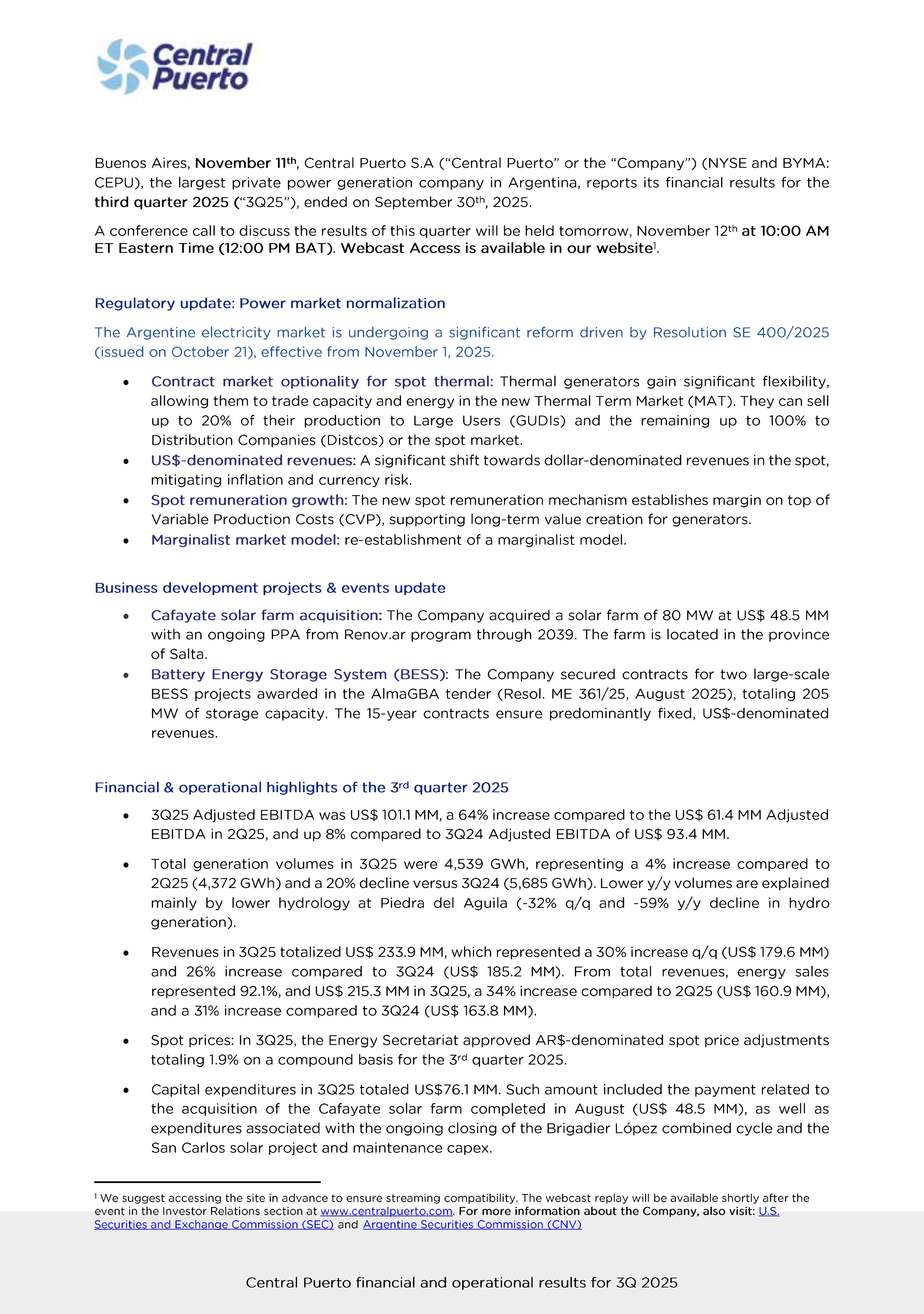 3rd Quarter 2025 Results November 11th, 2025 New York Stock Exchange (NYSE) and Bolsas y Mercados Argentinos (BYMA) : CEPU Central Puerto financial and operational results for 3Q 20 25 Buenos Aires, November 11th, Central Puerto S.A (“Central Puerto” or the “Company”) (NYSE and BYMA: CEPU), the largest private power generation company in Argentina, reports its financial results for the third quarter 2025 (“3Q25”), ended on September 30th, 2025. A conference call to discuss the results of this quarter will be held tomorrow, November 12th at 10:00 AM ET Eastern Time (12:00 PM BAT). Webcast Access is available in our website 1. Regulatory update: Power market normalization The Argentine electricity market is undergoing a significant reform driven by Resolution SE 400/2025 (issued on October 21), effective from November 1, 2025. • Contract market optionality for spot thermal: Thermal generators gain significant flexibility, allowing them to trade capacity and energy in the new Thermal Term Market (MAT). They can sell up to 20% of their production to Large Users (GUDIs) and the remaining up to 100% to Distribution Companies (Distcos) or the spot market. • US$-denominated revenues: A significant shift towards dollar-denominated revenues in the spot, mitigating inflation and currency risk. • Spot remuneration growth: The new spot remuneration mechanism establishes margin on top of Variable Production Costs (CVP), supporting long-term value creation for generators. • Marginalist market model: re-establishment of a marginalist model. Business development projects & events update • Cafayate solar farm acquisition: The Company acquired a solar farm of 80 MW at US$ 48.5 MM with an ongoing PPA from Renov.ar program through 2039. The farm is located in the province of Salta. • Battery Energy Storage System (BESS): The Company secured contracts for two large-scale BESS projects awarded in the AlmaGBA tender (Resol. ME 361/25, August 2025), totaling 205 MW of storage capacity. The 15-year contracts ensure predominantly fixed, US$-denominated revenues. Financial & operational highlights of the 3rd quarter 2025 • 3Q25 Adjusted EBITDA was US$ 101.1 MM, a 64% increase compared to the US$ 61.4 MM Adjusted EBITDA in 2Q25, and up 8% compared to 3Q24 Adjusted EBITDA of US$ 93.4 MM. • Total generation volumes in 3Q25 were 4,539 GWh, representing a 4% increase compared to 2Q25 (4,372 GWh) and a 20% decline versus 3Q24 (5,685 GWh). Lower y/y volumes are explained mainly by lower hydrology at Piedra del Aguila (-32% q/q and -59% y/y decline in hydro generation). • Revenues in 3Q25 totalized US$ 233.9 MM, which represented a 30% increase q/q (US$ 179.6 MM) and 26% increase compared to 3Q24 (US$ 185.2 MM). From total revenues, energy sales represented 92.1%, and US$ 215.3 MM in 3Q25, a 34% increase compared to 2Q25 (US$ 160.9 MM), and a 31% increase compared to 3Q24 (US$ 163.8 MM). • Spot prices: In 3Q25, the Energy Secretariat approved AR$-denominated spot price adjustments totaling 1.9% on a compound basis for the 3rd quarter 2025. • Capital expenditures in 3Q25 totaled US$76.1 MM. Such amount included the payment related to the acquisition of the Cafayate solar farm completed in August (US$ 48.5 MM), as well as expenditures associated with the ongoing closing of the Brigadier López combined cycle and the San Carlos solar project and maintenance capex. 1 We suggest accessing the site in advance to ensure streaming compatibility. The webcast replay will be available shortly after the event in the Investor Relations section at www.centralpuerto.com. For more information about the Company, also visit: U.S. Securities and Exchange Commission (SEC) and Argentine Securities Commission (CNV) Central Puerto financial and operational results for 3Q 20 25 • As of September 30, 2025, cash and cash equivalents and current financial assets balance was US$ 292.1 MM (cash and cash equivalents US$ 48.9 MM, current financial assets US$ 243.2 MM). The total outstanding gross debt balance was US$ 452.1 MM, and net financial debt resulted in US$ 159.9 MM and net leverage ratio was 0.5 x Adj. EBITDA. • In August 2025, Central Puerto issued Class “C” Corporate Bond. The emission in the local market saw a strong reception, raising US$ 89 MM at 8.00%, bullet 2029. • Outstanding credit from Foninvemem program stands at US$ 138.0 MM, to continue being collected in monthly installments through May 2028. • In September Moody’s initiated credit rating coverage of the company assigning local AA+ as Initial rating. Also, Fix SCR upgraded CEPU’s rating to AA. 4Q25 Outlook - Recent and ongoing initiatives • Financial debt repayment: US$ 90 MM from Corporate bond Class A US$ 50 MM repaid at maturity, and US$ 40 MM from Guañizuil solar farm (inherited) debt, both in October 2025. • Maintenance program in 4Q: Maintenance program at Luján de Cuyo combined-cycle complex focused on extending asset life through targeted repairs and overhauls (estimated downtime: 45 days). Central Puerto conducting additional works following findings from 2024 maintenance, including ST generator overhaul and rotor rewinding (estimated 60-day outage). • Shares buyback program of 2,756,000 shares (BYMA) for a total amount of US$ 2.54 MM • Comahue hydro concession tender process: On November 7th, tender offers were submitted. Central Puerto financial and operational results for 3Q 20 25 Regulatory updates and analysis Resolution SE 400/25: Wholesale Electricity Market reform initiated On October 21, 2025, and effective as of November 1, 2025, the Secretary of Energy (SE) issued a new framework to liberalize Argentina’s Wholesale Electricity Market (WEM). The core objective of the Resolution is to gradually reform the WEM through a progressive transition: Market Shift: A new Term Market (MAT) for capacity and energy was established. Market access for generators previously restricted to the thermal spot segment is 