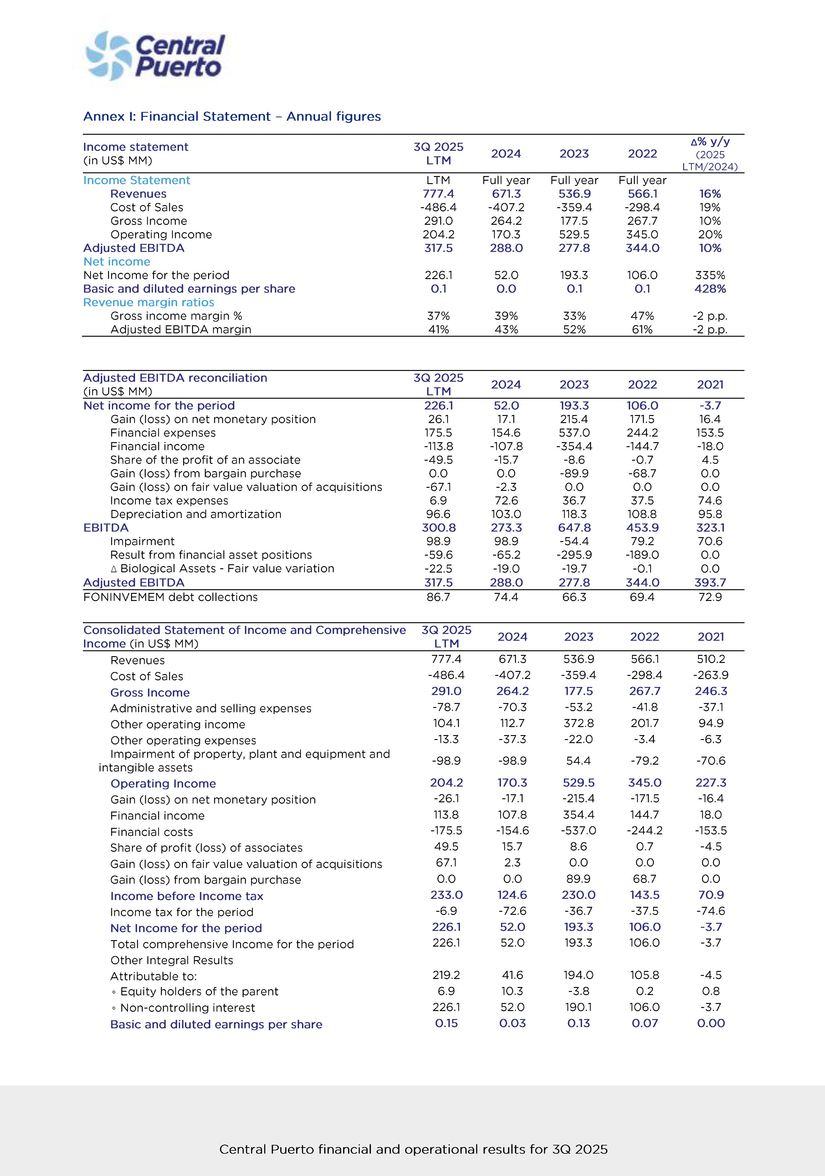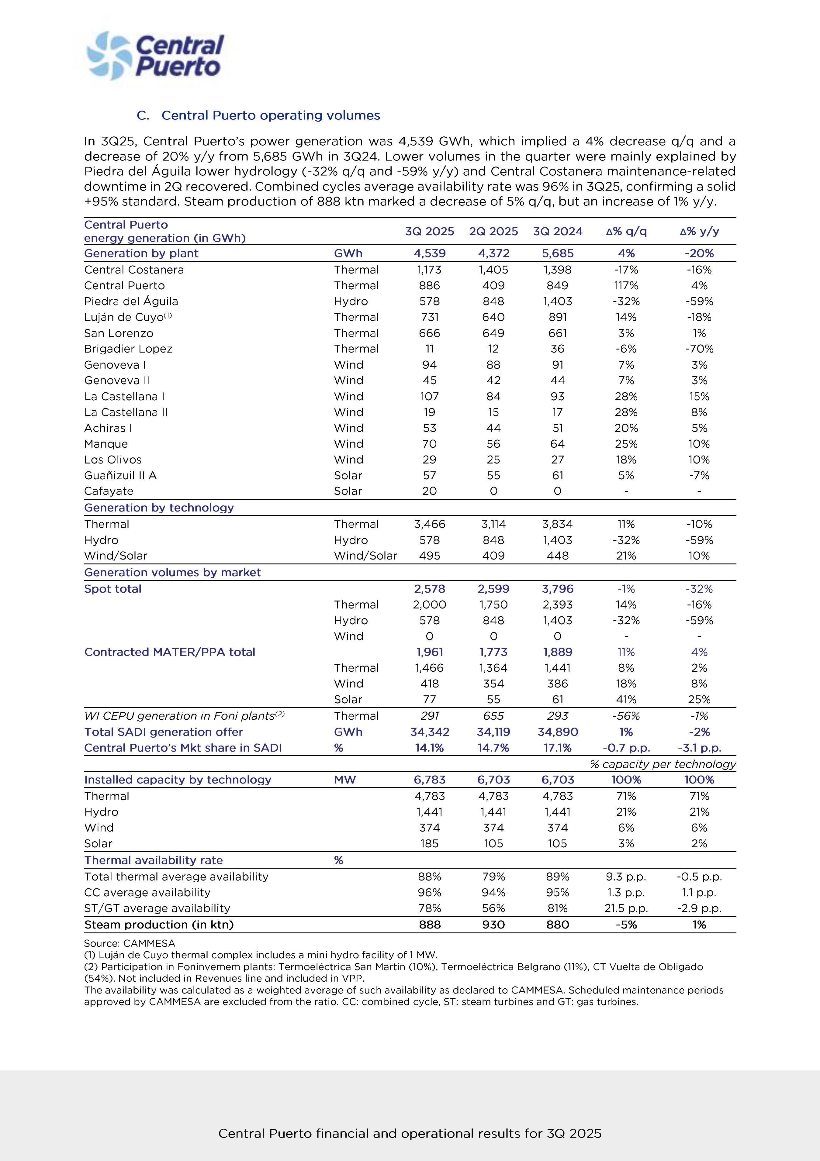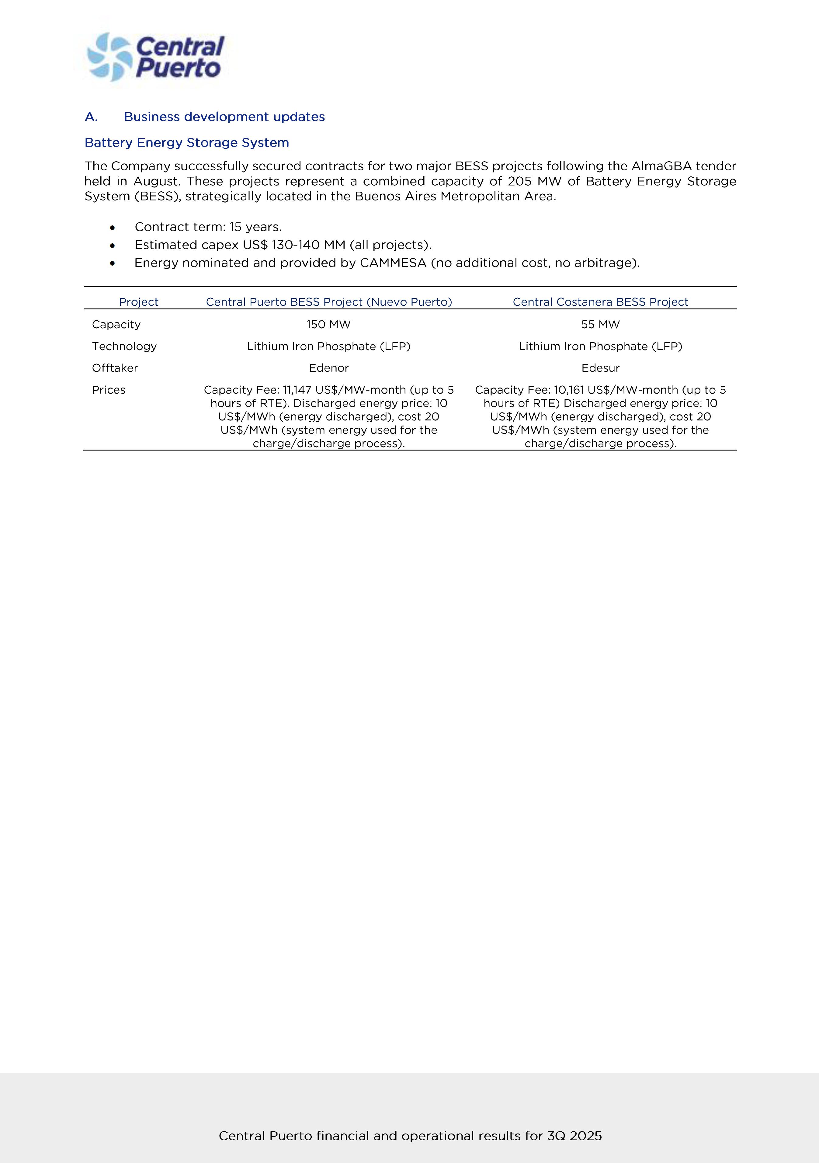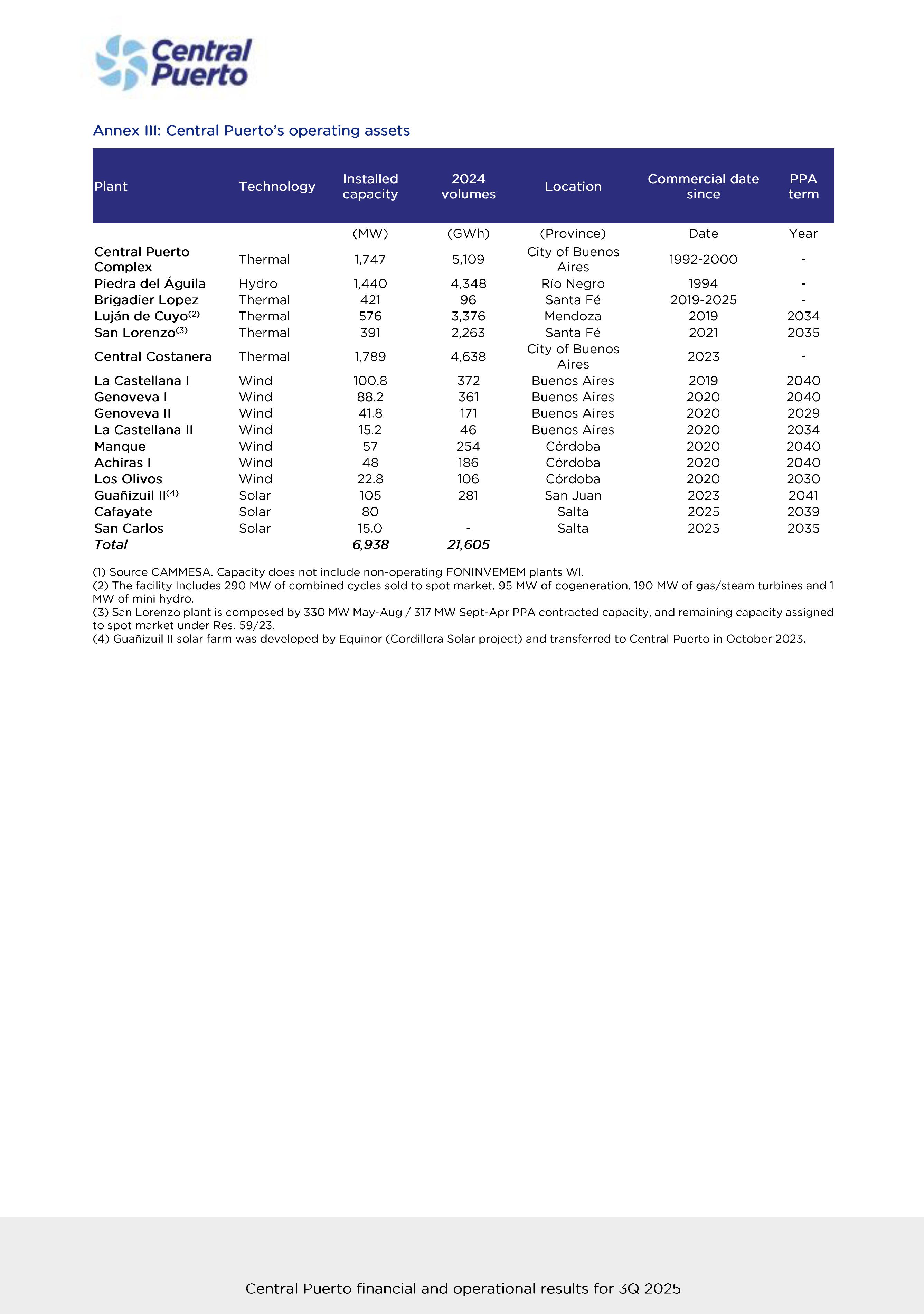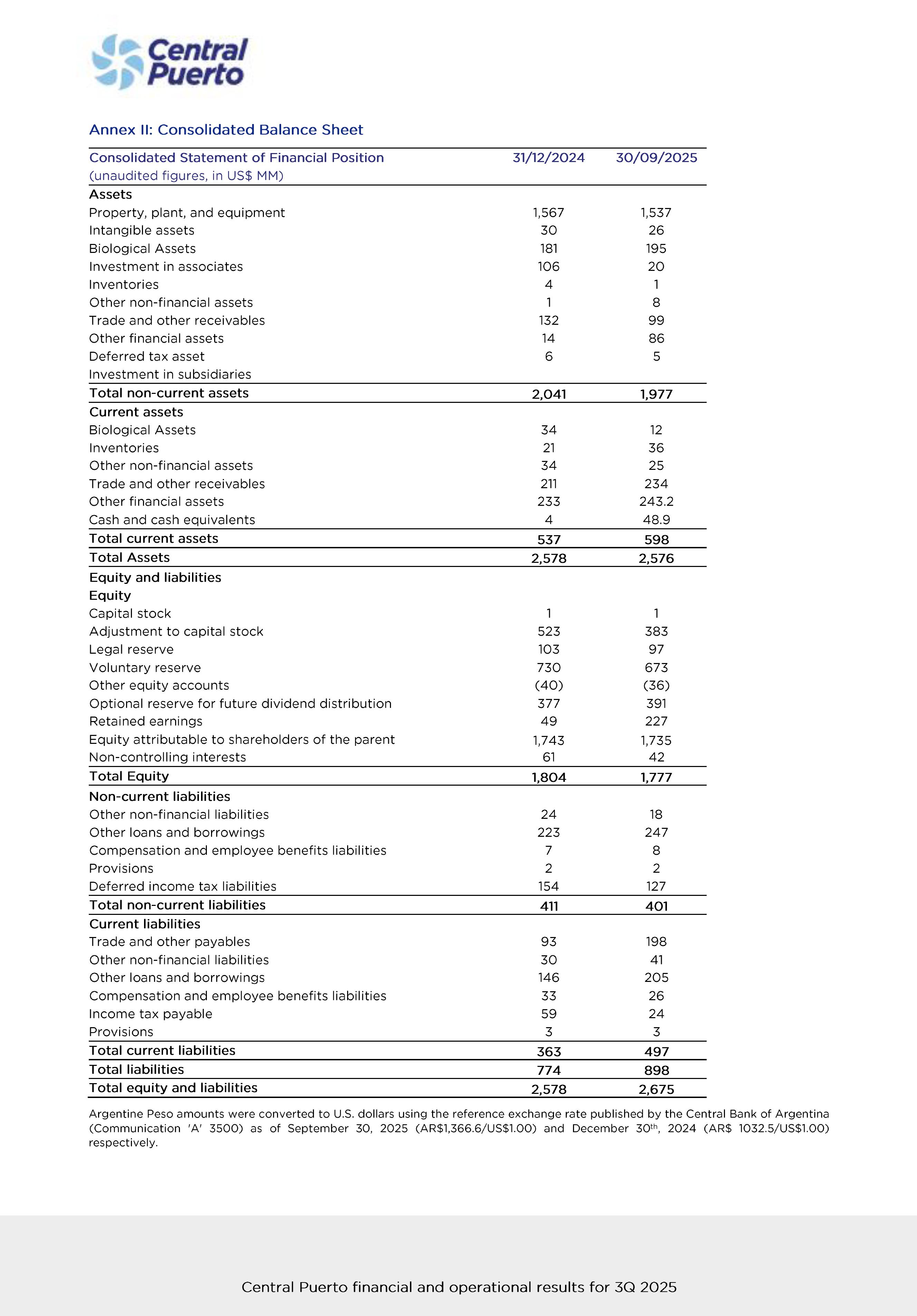 3rd Quarter 2025 Results November 11th, 2025 New York Stock Exchange (NYSE) and Bolsas y Mercados Argentinos (BYMA) : CEPU Central Puerto financial and operational results for 3Q 20 25 Buenos Aires, November 11th, Central Puerto S.A (“Central Puerto” or the “Company”) (NYSE and BYMA: CEPU), the largest private power generation company in Argentina, reports its financial results for the third quarter 2025 (“3Q25”), ended on September 30th, 2025. A conference call to discuss the results of this quarter will be held tomorrow, November 12th at 10:00 AM ET Eastern Time (12:00 PM BAT). Webcast Access is available in our website 1. Regulatory update: Power market normalization The Argentine electricity market is undergoing a significant reform driven by Resolution SE 400/2025 (issued on October 21), effective from November 1, 2025. • Contract market optionality for spot thermal: Thermal generators gain significant flexibility, allowing them to trade capacity and energy in the new Thermal Term Market (MAT). They can sell up to 20% of their production to Large Users (GUDIs) and the remaining up to 100% to Distribution Companies (Distcos) or the spot market. • US$-denominated revenues: A significant shift towards dollar-denominated revenues in the spot, mitigating inflation and currency risk. • Spot remuneration growth: The new spot remuneration mechanism establishes margin on top of Variable Production Costs (CVP), supporting long-term value creation for generators. • Marginalist market model: re-establishment of a marginalist model. Business development projects & events update • Cafayate solar farm acquisition: The Company acquired a solar farm of 80 MW at US$ 48.5 MM with an ongoing PPA from Renov.ar program through 2039. The farm is located in the province of Salta. • Battery Energy Storage System (BESS): The Company secured contracts for two large-scale BESS projects awarded in the AlmaGBA tender (Resol. ME 361/25, August 2025), totaling 205 MW of storage capacity. The 15-year contracts ensure predominantly fixed, US$-denominated revenues. Financial & operational highlights of the 3rd quarter 2025 • 3Q25 Adjusted EBITDA was US$ 101.1 MM, a 64% increase compared to the US$ 61.4 MM Adjusted EBITDA in 2Q25, and up 8% compared to 3Q24 Adjusted EBITDA of US$ 93.4 MM. • Total generation volumes in 3Q25 were 4,539 GWh, representing a 4% increase compared to 2Q25 (4,372 GWh) and a 20% decline versus 3Q24 (5,685 GWh). Lower y/y volumes are explained mainly by lower hydrology at Piedra del Aguila (-32% q/q and -59% y/y decline in hydro generation). • Revenues in 3Q25 totalized US$ 233.9 MM, which represented a 30% increase q/q (US$ 179.6 MM) and 26% increase compared to 3Q24 (US$ 185.2 MM). From total revenues, energy sales represented 92.1%, and US$ 215.3 MM in 3Q25, a 34% increase compared to 2Q25 (US$ 160.9 MM), and a 31% increase compared to 3Q24 (US$ 163.8 MM). • Spot prices: In 3Q25, the Energy Secretariat approved AR$-denominated spot price adjustments totaling 1.9% on a compound basis for the 3rd quarter 2025. • Capital expenditures in 3Q25 totaled US$76.1 MM. Such amount included the payment related to the acquisition of the Cafayate solar farm completed in August (US$ 48.5 MM), as well as expenditures associated with the ongoing closing of the Brigadier López combined cycle and the San Carlos solar project and maintenance capex. 1 We suggest accessing the site in advance to ensure streaming compatibility. The webcast replay will be available shortly after the event in the Investor Relations section at www.centralpuerto.com. For more information about the Company, also visit: U.S. Securities and Exchange Commission (SEC) and Argentine Securities Commission (CNV) Central Puerto financial and operational results for 3Q 20 25 • As of September 30, 2025, cash and cash equivalents and current financial assets balance was US$ 292.1 MM (cash and cash equivalents US$ 48.9 MM, current financial assets US$ 243.2 MM). The total outstanding gross debt balance was US$ 452.1 MM, and net financial debt resulted in US$ 159.9 MM and net leverage ratio was 0.5 x Adj. EBITDA. • In August 2025, Central Puerto issued Class “C” Corporate Bond. The emission in the local market saw a strong reception, raising US$ 89 MM at 8.00%, bullet 2029. • Outstanding credit from Foninvemem program stands at US$ 138.0 MM, to continue being collected in monthly installments through May 2028. • In September Moody’s initiated credit rating coverage of the company assigning local AA+ as Initial rating. Also, Fix SCR upgraded CEPU’s rating to AA. 4Q25 Outlook - Recent and ongoing initiatives • Financial debt repayment: US$ 90 MM from Corporate bond Class A US$ 50 MM repaid at maturity, and US$ 40 MM from Guañizuil solar farm (inherited) debt, both in October 2025. • Maintenance program in 4Q: Maintenance program at Luján de Cuyo combined-cycle complex focused on extending asset life through targeted repairs and overhauls (estimated downtime: 45 days). Central Puerto conducting additional works following findings from 2024 maintenance, including ST generator overhaul and rotor rewinding (estimated 60-day outage). • Shares buyback program of 2,756,000 shares (BYMA) for a total amount of US$ 2.54 MM • Comahue hydro concession tender process: On November 7th, tender offers were submitted. Central Puerto financial and operational results for 3Q 20 25 Regulatory updates and analysis Resolution SE 400/25: Wholesale Electricity Market reform initiated On October 21, 2025, and effective as of November 1, 2025, the Secretary of Energy (SE) issued a new framework to liberalize Argentina’s Wholesale Electricity Market (WEM). The core objective of the Resolution is to gradually reform the WEM through a progressive transition: Market Shift: A new Term Market (MAT) for capacity and energy was established. Market access for generators previously restricted to the thermal spot segment is 