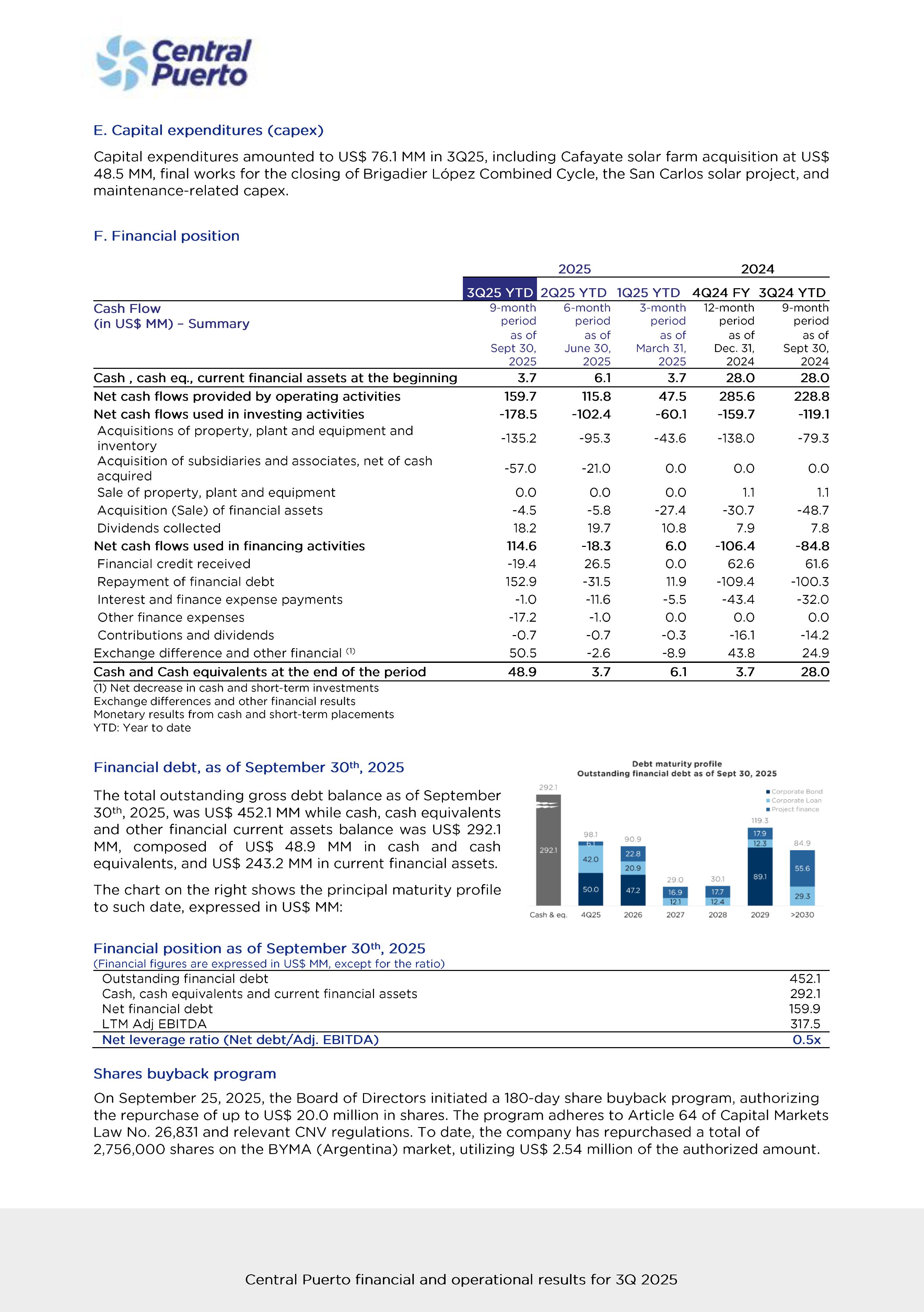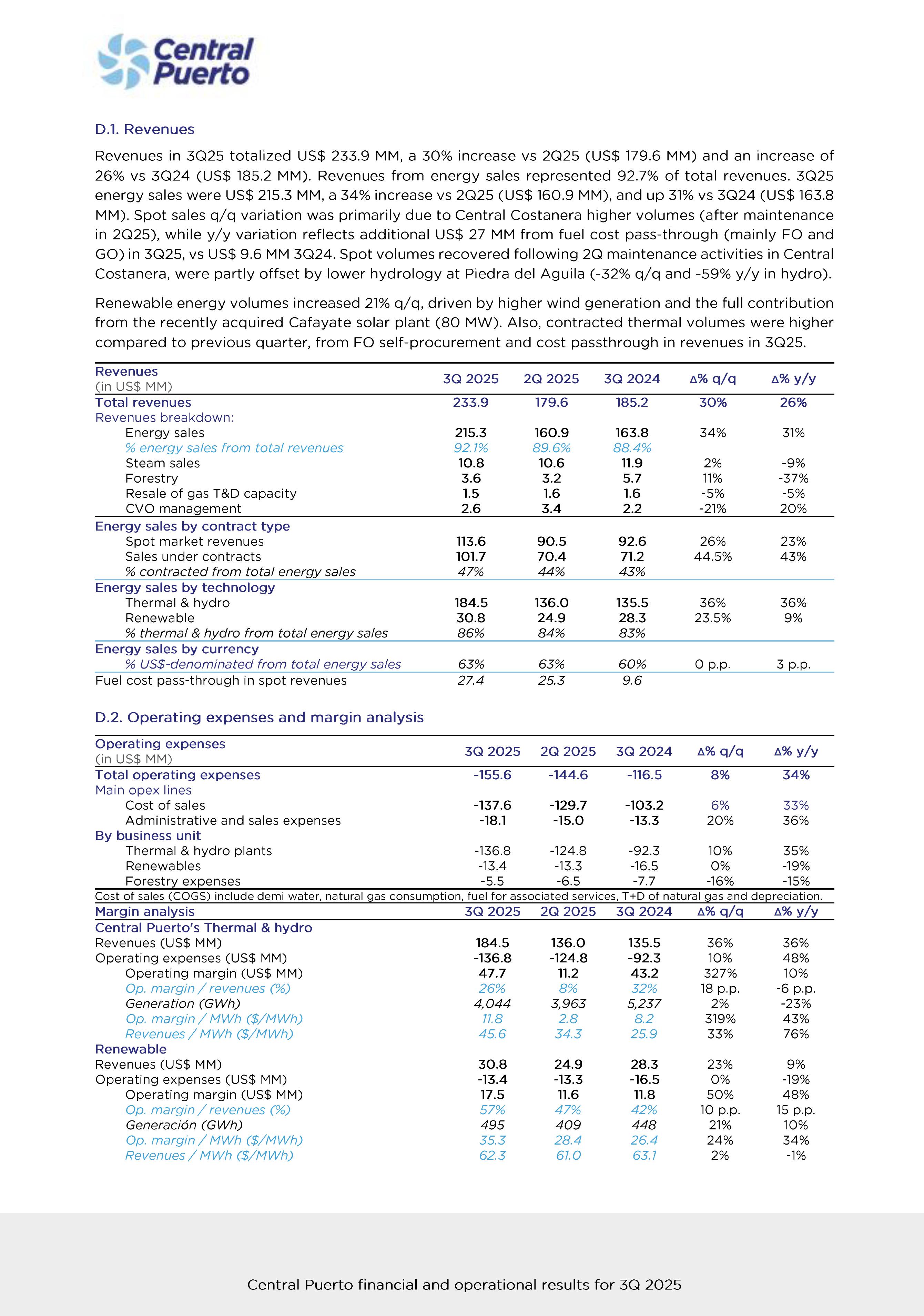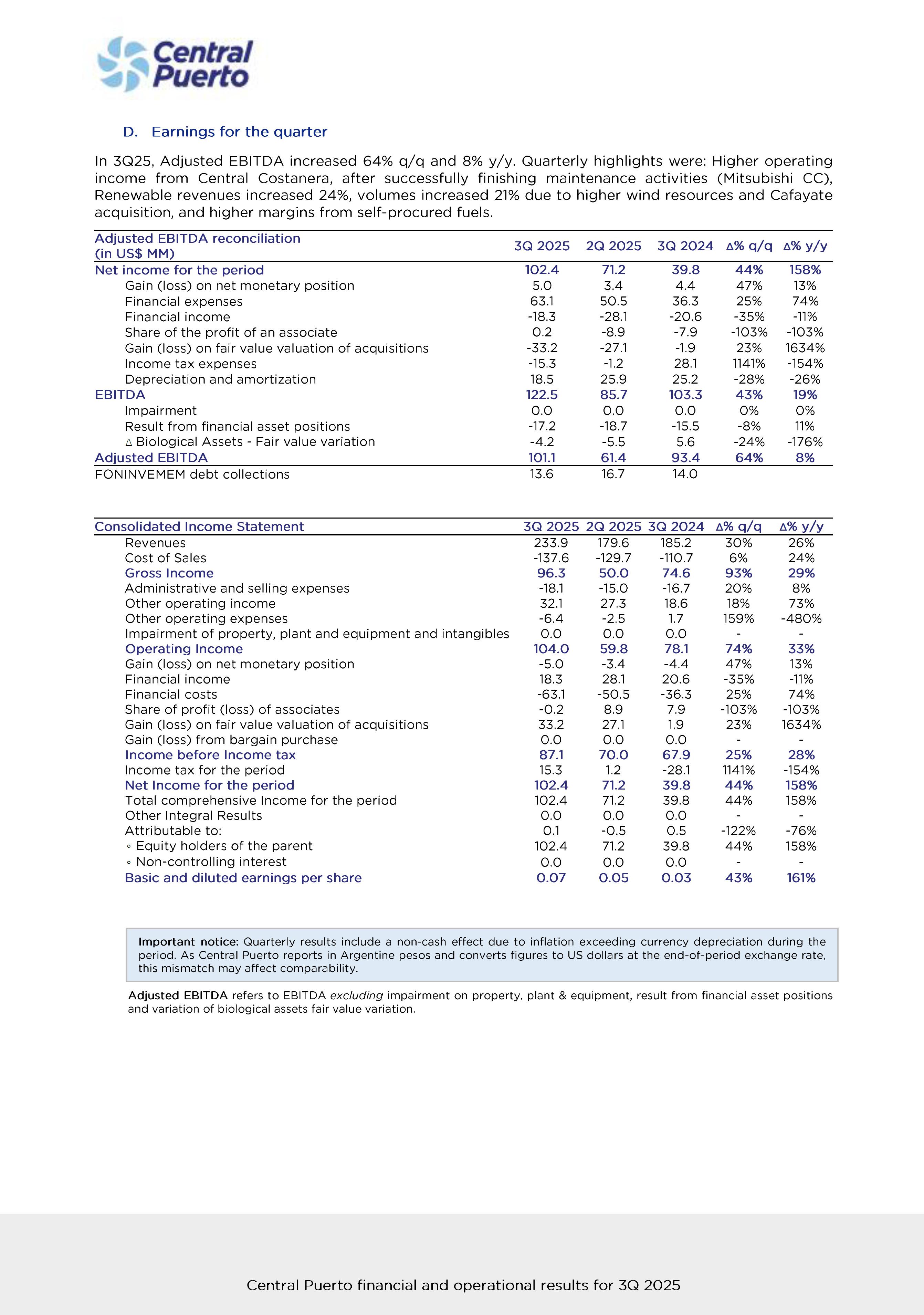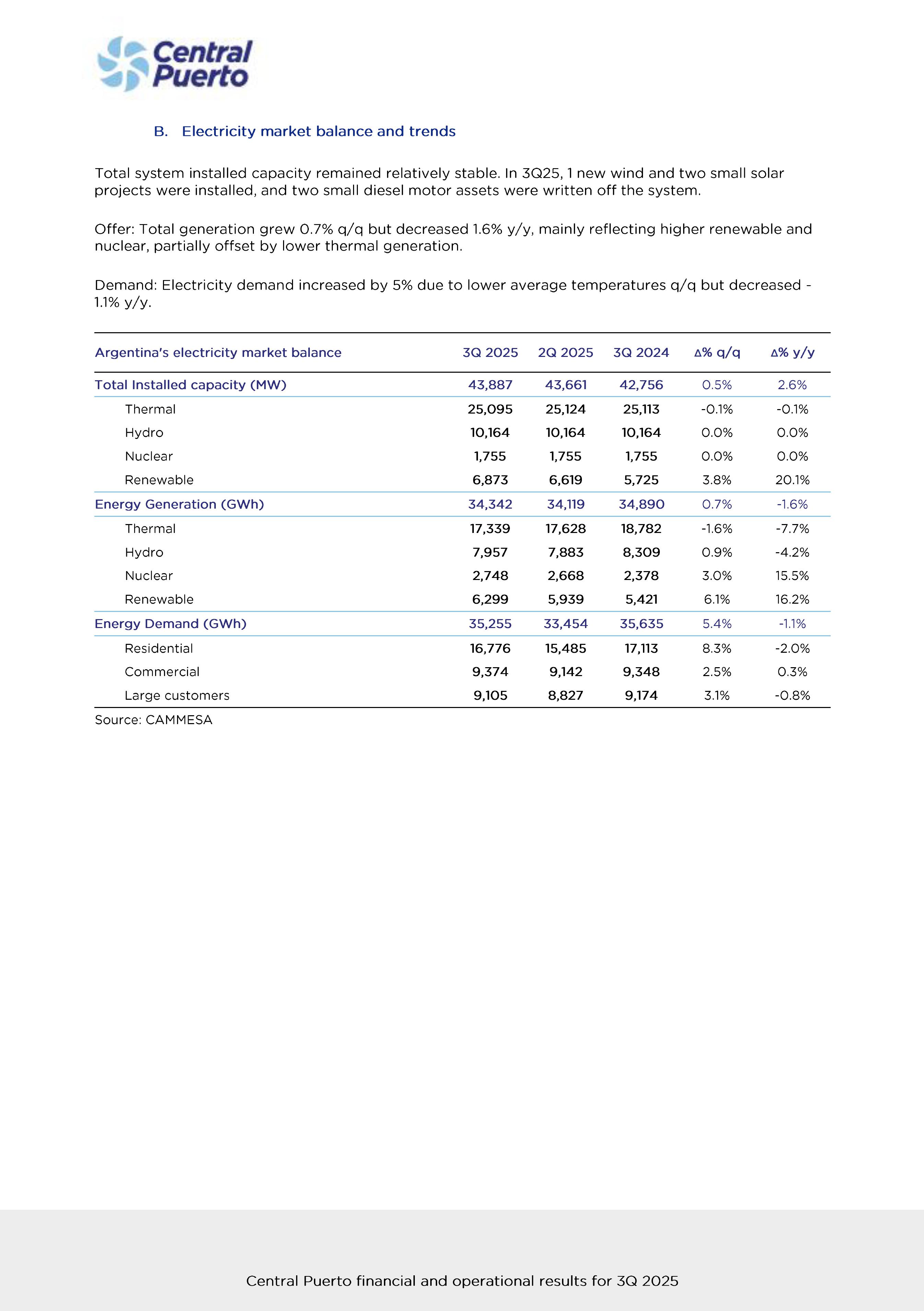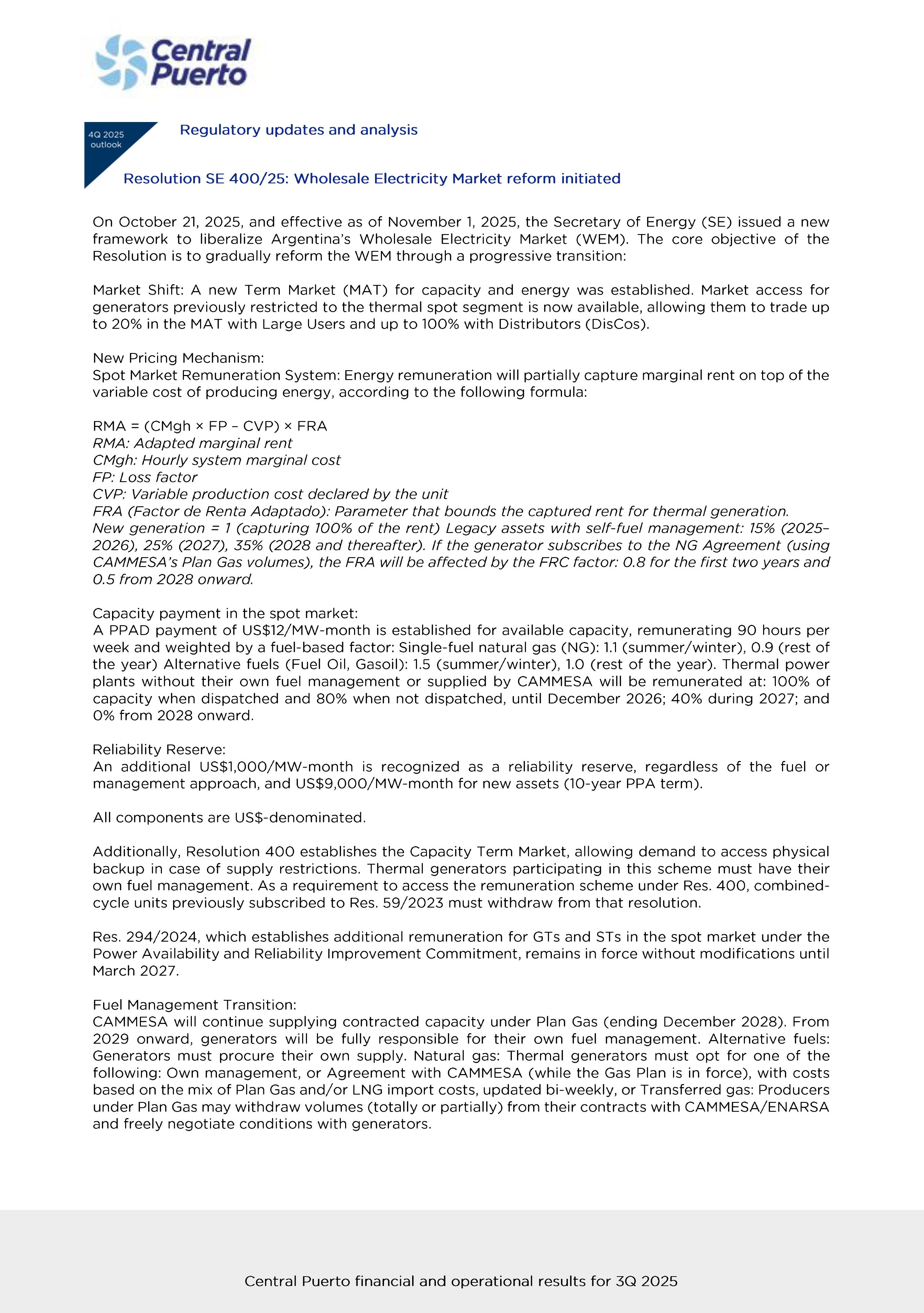 3rd Quarter 2025 Results November 11th, 2025 New York Stock Exchange (NYSE) and Bolsas y Mercados Argentinos (BYMA) : CEPU Central Puerto financial and operational results for 3Q 20 25 Buenos Aires, November 11th, Central Puerto S.A (“Central Puerto” or the “Company”) (NYSE and BYMA: CEPU), the largest private power generation company in Argentina, reports its financial results for the third quarter 2025 (“3Q25”), ended on September 30th, 2025. A conference call to discuss the results of this quarter will be held tomorrow, November 12th at 10:00 AM ET Eastern Time (12:00 PM BAT). Webcast Access is available in our website 1. Regulatory update: Power market normalization The Argentine electricity market is undergoing a significant reform driven by Resolution SE 400/2025 (issued on October 21), effective from November 1, 2025. • Contract market optionality for spot thermal: Thermal generators gain significant flexibility, allowing them to trade capacity and energy in the new Thermal Term Market (MAT). They can sell up to 20% of their production to Large Users (GUDIs) and the remaining up to 100% to Distribution Companies (Distcos) or the spot market. • US$-denominated revenues: A significant shift towards dollar-denominated revenues in the spot, mitigating inflation and currency risk. • Spot remuneration growth: The new spot remuneration mechanism establishes margin on top of Variable Production Costs (CVP), supporting long-term value creation for generators. • Marginalist market model: re-establishment of a marginalist model. Business development projects & events update • Cafayate solar farm acquisition: The Company acquired a solar farm of 80 MW at US$ 48.5 MM with an ongoing PPA from Renov.ar program through 2039. The farm is located in the province of Salta. • Battery Energy Storage System (BESS): The Company secured contracts for two large-scale BESS projects awarded in the AlmaGBA tender (Resol. ME 361/25, August 2025), totaling 205 MW of storage capacity. The 15-year contracts ensure predominantly fixed, US$-denominated revenues. Financial & operational highlights of the 3rd quarter 2025 • 3Q25 Adjusted EBITDA was US$ 101.1 MM, a 64% increase compared to the US$ 61.4 MM Adjusted EBITDA in 2Q25, and up 8% compared to 3Q24 Adjusted EBITDA of US$ 93.4 MM. • Total generation volumes in 3Q25 were 4,539 GWh, representing a 4% increase compared to 2Q25 (4,372 GWh) and a 20% decline versus 3Q24 (5,685 GWh). Lower y/y volumes are explained mainly by lower hydrology at Piedra del Aguila (-32% q/q and -59% y/y decline in hydro generation). • Revenues in 3Q25 totalized US$ 233.9 MM, which represented a 30% increase q/q (US$ 179.6 MM) and 26% increase compared to 3Q24 (US$ 185.2 MM). From total revenues, energy sales represented 92.1%, and US$ 215.3 MM in 3Q25, a 34% increase compared to 2Q25 (US$ 160.9 MM), and a 31% increase compared to 3Q24 (US$ 163.8 MM). • Spot prices: In 3Q25, the Energy Secretariat approved AR$-denominated spot price adjustments totaling 1.9% on a compound basis for the 3rd quarter 2025. • Capital expenditures in 3Q25 totaled US$76.1 MM. Such amount included the payment related to the acquisition of the Cafayate solar farm completed in August (US$ 48.5 MM), as well as expenditures associated with the ongoing closing of the Brigadier López combined cycle and the San Carlos solar project and maintenance capex. 1 We suggest accessing the site in advance to ensure streaming compatibility. The webcast replay will be available shortly after the event in the Investor Relations section at www.centralpuerto.com. For more information about the Company, also visit: U.S. Securities and Exchange Commission (SEC) and Argentine Securities Commission (CNV) Central Puerto financial and operational results for 3Q 20 25 • As of September 30, 2025, cash and cash equivalents and current financial assets balance was US$ 292.1 MM (cash and cash equivalents US$ 48.9 MM, current financial assets US$ 243.2 MM). The total outstanding gross debt balance was US$ 452.1 MM, and net financial debt resulted in US$ 159.9 MM and net leverage ratio was 0.5 x Adj. EBITDA. • In August 2025, Central Puerto issued Class “C” Corporate Bond. The emission in the local market saw a strong reception, raising US$ 89 MM at 8.00%, bullet 2029. • Outstanding credit from Foninvemem program stands at US$ 138.0 MM, to continue being collected in monthly installments through May 2028. • In September Moody’s initiated credit rating coverage of the company assigning local AA+ as Initial rating. Also, Fix SCR upgraded CEPU’s rating to AA. 4Q25 Outlook - Recent and ongoing initiatives • Financial debt repayment: US$ 90 MM from Corporate bond Class A US$ 50 MM repaid at maturity, and US$ 40 MM from Guañizuil solar farm (inherited) debt, both in October 2025. • Maintenance program in 4Q: Maintenance program at Luján de Cuyo combined-cycle complex focused on extending asset life through targeted repairs and overhauls (estimated downtime: 45 days). Central Puerto conducting additional works following findings from 2024 maintenance, including ST generator overhaul and rotor rewinding (estimated 60-day outage). • Shares buyback program of 2,756,000 shares (BYMA) for a total amount of US$ 2.54 MM • Comahue hydro concession tender process: On November 7th, tender offers were submitted. Central Puerto financial and operational results for 3Q 20 25 Regulatory updates and analysis Resolution SE 400/25: Wholesale Electricity Market reform initiated On October 21, 2025, and effective as of November 1, 2025, the Secretary of Energy (SE) issued a new framework to liberalize Argentina’s Wholesale Electricity Market (WEM). The core objective of the Resolution is to gradually reform the WEM through a progressive transition: Market Shift: A new Term Market (MAT) for capacity and energy was established. Market access for generators previously restricted to the thermal spot segment is 