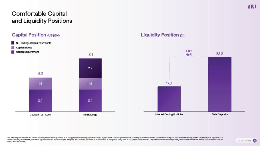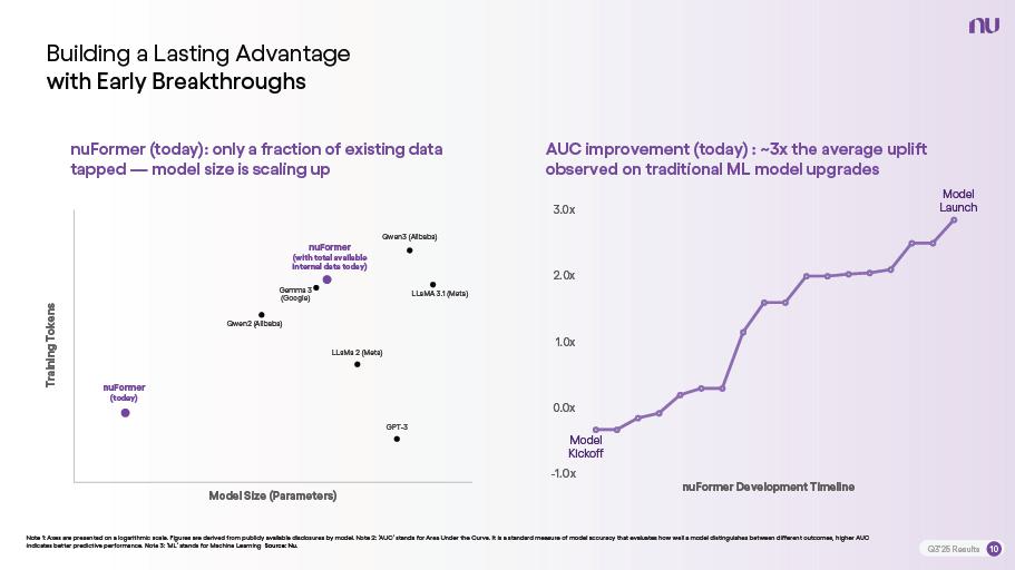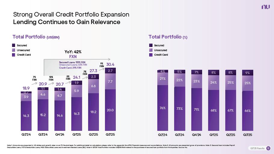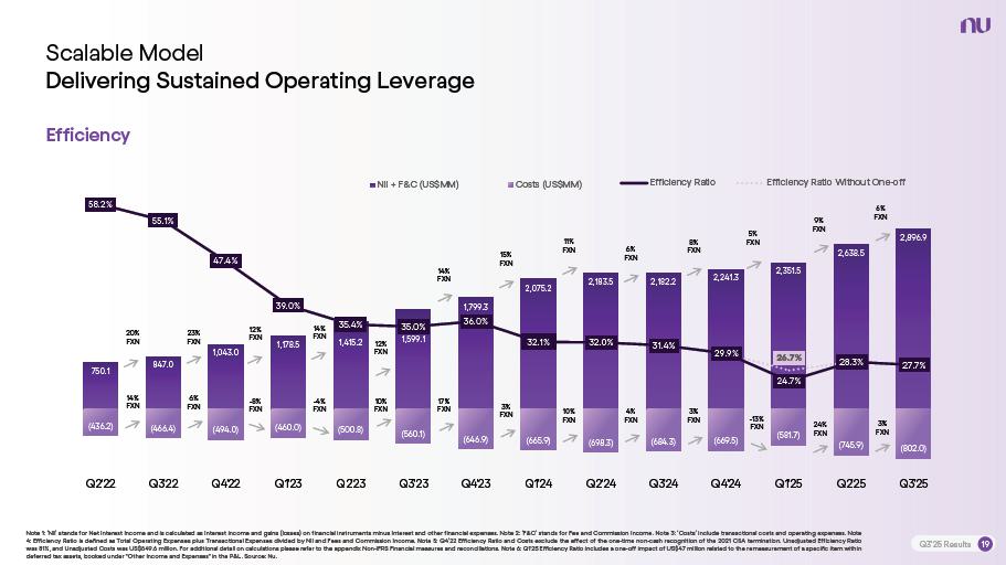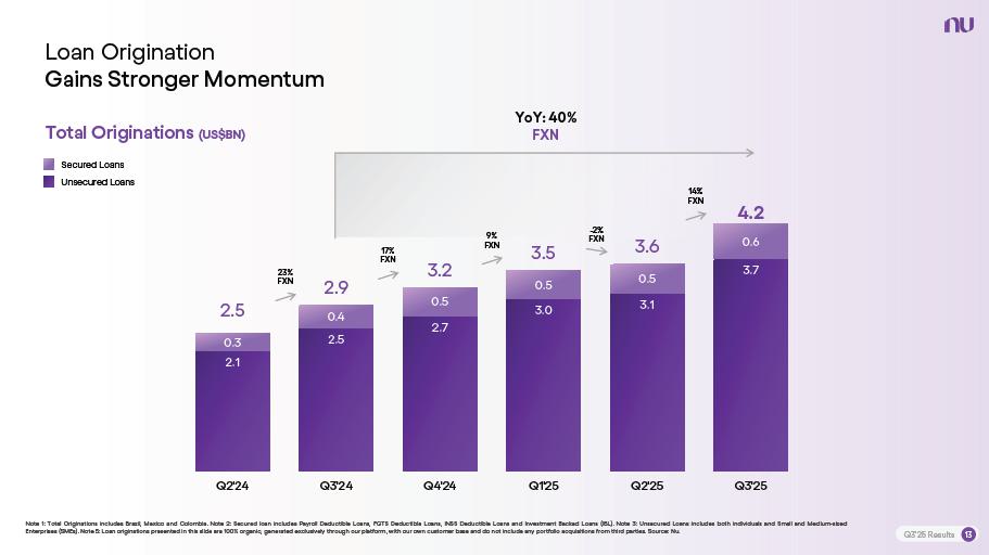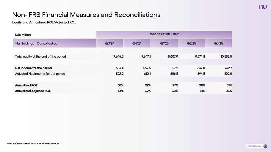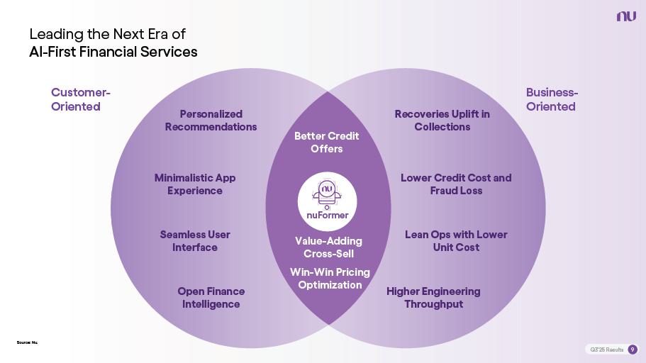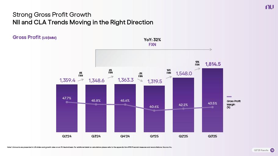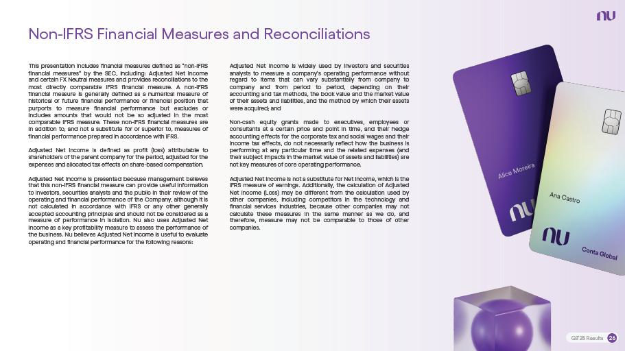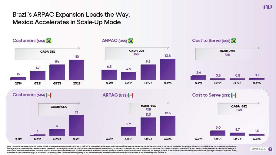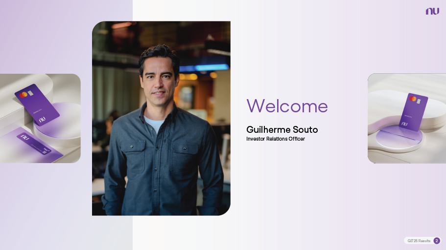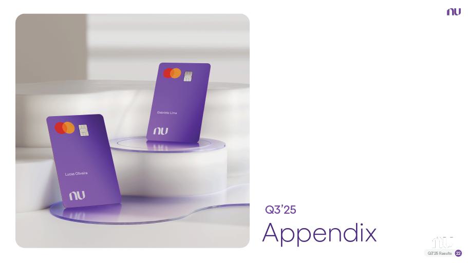 Q3’25 Results 1 Q3 2025 Earnings Presentation Nov 13, 2025 Q3’25 Results 2 Investor Relations Officer Guilherme Souto Welcome Q3’25 Results 3 Founder, Chief Executive Officer and Chairman David Vélez Chief Financial Officer Guilherme Lago Q3’25 Results 4 This presentation speaks at the date here of and the Company is under no obligation to update or keep current the information contained in this presentation. Any information expressed herein is subject to change without notice. Any market or other third-party data included in this presentation has been obtained by the Company from third-party sources. While the Company has compiled and extracted the market data, it can provide no assurances of the accuracy and completeness of such information and takes no responsibility for such data. This presentation contains forward-looking statements. All statements other than statements of historical fact contained in this presentation may be forward-looking statements and include, but are not limited to, statements regarding the Company’s intent, belief or current expectations. These forward-looking statements are subject to risks and uncertainties, and may include, among others, financial forecasts and estimates based on assumptions or statements regarding plans, objectives and expectations. Although the Company believes that these estimates and forward-looking statements are based upon reasonable assumptions, they are subject to several risks and uncertainties and are made in light of information currently available, and actual results may differ materially from those expressed or implied in the forward-looking statements due to various factors, including those risks and uncertainties included under the captions “Risk Factors” and “Management’s Discussion and Analysis of Financial Condition and Results of Operations” in the prospectus dated December 8, 2021 filed with the Securities and Exchange Commission pursuant to Rule 424(b) under the Securities Act of 1933, as amended, and in our Annual Report on Form 20-F for the year ended December 31, 2024, which was filed with the Securities and Exchange Commission on April 16, 2025. Disclaimer The Company, its advisers and each of their respective directors, officers and employees disclaim any obligation to update the Company’s view of such risks and uncertainties or to publicly announce the result of any revision to the forward-looking statements made herein, except where it would be required to do so under applicable law. The forward-looking statements can be identified, in certain cases, through the use of words such as “believe,” “may,” “might,” “can,” “could,” “is designed to,” “will,” “aim,” “estimate,” “continue,” “anticipate,” “intend,” “expect,” “forecast”, “plan”, “predict”, “potential”, “aspiration,” “should,” “purpose,” “belief,” and similar, or variations of, or the negative of such words and expressions. The financial information in this document includes forecasts, projections and other predictive statements that represent the Company’s assumptions and expectations in light of currently available information. These forecasts, projections and other predictive statements are based on the Company’s expectations and are subject to variables and uncertainties. The Company’s actual performance results may differ. Consequently, no guarantee is presented or implied as to the accuracy of specific forecasts, projections or predictive statements contained herein, and undue reliance should not be placed on the forward-looking statements in this presentation, which are inherently uncertain. In addition to IFRS financials, this presentation includes certain summarized, non-audited or non-IFRS financial information. These summarized, non-audited or non-IFRS financial measures are in addition to, and not a substitute for or superior to, measures of financial performance prepared in accordance with IFRS. References in this presentation to “R$” refer to the Brazilian Real, the official currency of Brazil. Q3’25 Results 5 Customers (MM) ARPAC (US$) Gross Profit (US$MM) Efficiency Ratio (%) Revenues (US$BN) Net Income (US$MM) %Adult Population 61% 14% 10% Sustained Growth of One of the World's Largest Digital Banking Platforms 48 70 89 110 127 Q3'21 Q3'22 Q3'23 Q3'24 Q3'25 CAGR: 70% FXN (34) 8 303 553 783 Q3'21 Q3'22 Q3'23 Q3'24 Q3'25 CAGR: 27% 73% 82% 83% 84% 83% % Activity Ratio Note 1: ‘Active Customers’ relates to all customers that have generated revenue over the last 30 calendar days, for a given measurement period. Note 2: ‘Activity Rate’ is defined as monthly active customers divided by the total number of customers as of a specific date. Note 3: Adult population is defined as 18+ years. Note 4: For Brazil, the % of adult population is calculated as Nu’s Brazilian adult customers divided by the adult population of the country. For Mexico and Colombia, the % is calculated as Nu’s customers divided by the adult population of each country. Note 4: ‘Average revenue per active customer’ or ‘ARPAC’ is defined as the average monthly revenue (total revenue divided by the number of months in the period) divided by the average number of individual active customers during the period (average number of individual active customers is defined as the average of the number of monthly active customers at the beginning of the period measured, and the number of monthly active customers at the end of the period). Note 5: Efficiency Ratio is defined as Total Operating Expenses plus Transactional Expenses divided by NII and Fees and Commission Income. Note 6: Amounts are presented in US dollars and growth rates on an FX Neutral basis. For additional details on calculations please refer to the appendix Non-IFRS Financial measures and reconciliations. Source: Nu , IBGE, INEGI, DANE. CAGR: 73% FXN 481 1,307 2,137 2,943 4,173 Q3'21 Q3'22 