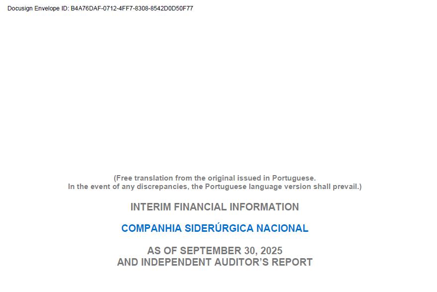 Companhia Siderúrgica Nacional wishes to inform that, on November 4, 2025, a meeting of the Board of Directors at its subsidiary CSN Mineração S.A. was held, with the objective of approving the distribution of R$ 903,205,733.68 (nine hundred and three million two hundred and five thousand seven hundred and thirty-three reals and sixty-eight centavos), of which: (a) R$ 424,205,733.68 (four hundred and twenty-four million two hundred and five thousand seven hundred and thirty-three reals and sixty-eight centavos) are interim dividends allocated to the profit account calculated in the balance sheet drawn up on September 30, 2025, corresponding to R$ 0.0780931987417 per share and; (b) R$ 479,000,000.00 (four hundred and seventy-nine million reals) are payment of interest on equity by CSN Mineração, of which (b1) R$ 448,142,315.36 (four hundred and forty-eight million one hundred and forty-two thousand three hundred and fifteen reals and thirty-six centavos) was allocated to the retained earnings account of the subsidiary in previous fiscal years and (b2) R$30,857,684.64 (thirty million eight hundred and fifty-seven thousand six hundred and eighty-four reals and sixty-four centavos) was allocated to the profit account calculated in the balance sheet drawn up by the subsidiary on September 30, 2025, corresponding to the total amount of R$ 0.0881804257401 per share. The shareholders of CSN Mineração registered with the depositary institution, Banco Bradesco S.A., are entitled to receive these dividends and interest on equity on November 7, 2025 and, as of November 10, 2025, these shares will be traded with dividend stripping. Payment of interim dividends and interest on equity will be provided as of November 19, 2025, on a specific date(s) to be informed in due course to the Shareholders and the market, without the application of monetary restatement or interest between the date of declaration and the effective payment date(s). Pursuant to the requirements of the Securities Exchange Act of 1934, the registrant has duly caused this report to be signed on its behalf by the undersigned, thereunto duly authorized.