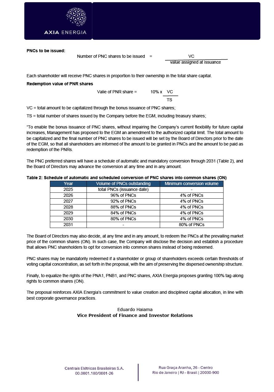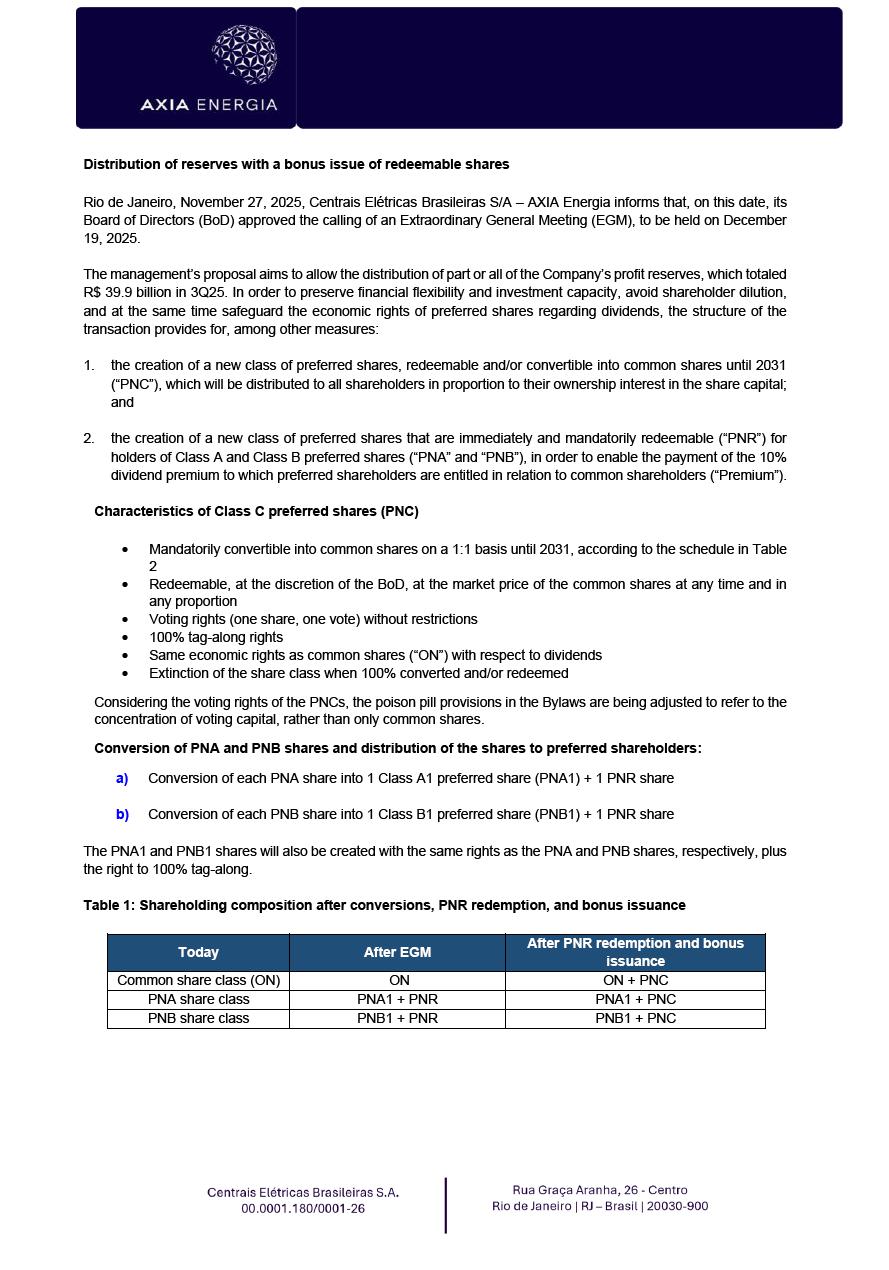 Distribution of reserves with a bonus issue of redeemable shares Rio de Janeiro, November 27, 2025, Centrais Elétricas Brasileiras S/A – AXIA Energia informs that, on this date, its Board of Directors (BoD) approved the calling of an Extraordinary General Meeting (EGM), to be held on December 19, 2025. The management’s proposal aims to allow the distribution of part or all of the Company’s profit reserves, which totaled R$ 39.9 billion in 3Q25. In order to preserve financial flexibility and investment capacity, avoid shareholder dilution, and at the same time safeguard the economic rights of preferred shares regarding dividends, the structure of the transaction provides for, among other measures: 1. the creation of a new class of preferred shares, redeemable and/or convertible into common shares until 2031 (“PNC”), which will be distributed to all shareholders in proportion to their ownership interest in the share capital; and 2. the creation of a new class of preferred shares that are immediately and mandatorily redeemable (“PNR”) for holders of Class A and Class B preferred shares (“PNA” and “PNB”), in order to enable the payment of the 10% dividend premium to which preferred shareholders are entitled in relation to common shareholders (“Premium”). Characteristics of Class C preferred shares (PNC) • Mandatorily convertible into common shares on a 1:1 basis until 2031, according to the schedule in Table 2 • Redeemable, at the discretion of the BoD, at the market price of the common shares at any time and in any proportion • Voting rights (one share, one vote) without restrictions • 100% tag-along rights • Same economic rights as common shares (“ON”) with respect to dividends • Extinction of the share class when 100% converted and/or redeemed Considering the voting rights of the PNCs, the poison pill provisions in the Bylaws are being adjusted to refer to the concentration of voting capital, rather than only common shares. Conversion of PNA and PNB shares and distribution of the shares to preferred shareholders: a) Conversion of each PNA share into 1 Class A1 preferred share (PNA1) + 1 PNR share b) Conversion of each PNB share into 1 Class B1 preferred share (PNB1) + 1 PNR share The PNA1 and PNB1 shares will also be created with the same rights as the PNA and PNB shares, respectively, plus the right to 100% tag-along. Table 1: Shareholding composition after conversions, PNR redemption, and bonus issuance Today After EGM After PNR redemption and bonus issuance Common share class (ON) ON ON + PNC PNA share class PNA1 + PNR PNA1 + PNC PNB share class PNB1 + PNR PNB1 + PNC PNCs to be issued: Number of PNC shares to be issued = VC value assigned at issuance Each shareholder will receive PNC shares in proportion to their ownership in the total share capital. Redemption value of PNR shares Valie of PNR share = 10% x VC TS VC = total amount to be capitalized through the bonus issuance of PNC shares; TS = total number of shares issued by the Company before the EGM, including treasury shares; “To enable the bonus issuance of PNC shares, without impairing the Company’s current flexibility for future capital increases, Management has proposed to the EGM an amendment to the authorized capital limit. The total amount to be capitalized and the final number of PNC shares to be issued will be set by the Board of Directors prior to the date of the EGM, so that all shareholders are informed of the amount to be granted in PNCs and the amount to be paid as redemption of the PNRs. The PNC preferred shares will have a schedule of automatic and mandatory conversion through 2031 (Table 2), and the Board of Directors may advance the conversion at any time and in any amount. Table 2: Schedule of automatic and scheduled conversion of PNC shares into common shares (ON) Year Volume of PNCs outstanding Minimum conversion volume 2025 total PNCs (issuance date) - 2026 96% of PNCs 4% of PNCs 2027 92% of PNCs 4% of PNCs 2028 88% of PNCs 4% of PNCs 2029 84% of PNCs 4% of PNCs 2030 80% of PNCs 4% of PNCs 2031 - 80% of PNCs The Board of Directors may also decide, at any time and in any amount, to redeem the PNCs at the prevailing market price of the common shares (ON). In such case, the Company will disclose the decision and establish a procedure that allows PNC shareholders to opt for conversion into common shares instead of being redeemed. PNC shares may be mandatorily redeemed if a shareholder or group of shareholders exceeds certain thresholds of voting capital concentration, as set forth in the proposal, with the aim of preserving the dispersed ownership structure. Finally, to equalize the rights of the PNA1, PNB1, and PNC shares, AXIA Energia proposes granting 100% tag-along rights to common shares (ON). The proposal reinforces AXIA Energia’s commitment to value creation and disciplined capital allocation, in line with best corporate governance practices. Eduardo Haiama Vice President of Finance and Investor Relations Pursuant to the requirements of the Securities Exchange Act of 1934, the registrant has duly caused this report to be signed on its behalf by the undersigned, thereunto duly authorized.