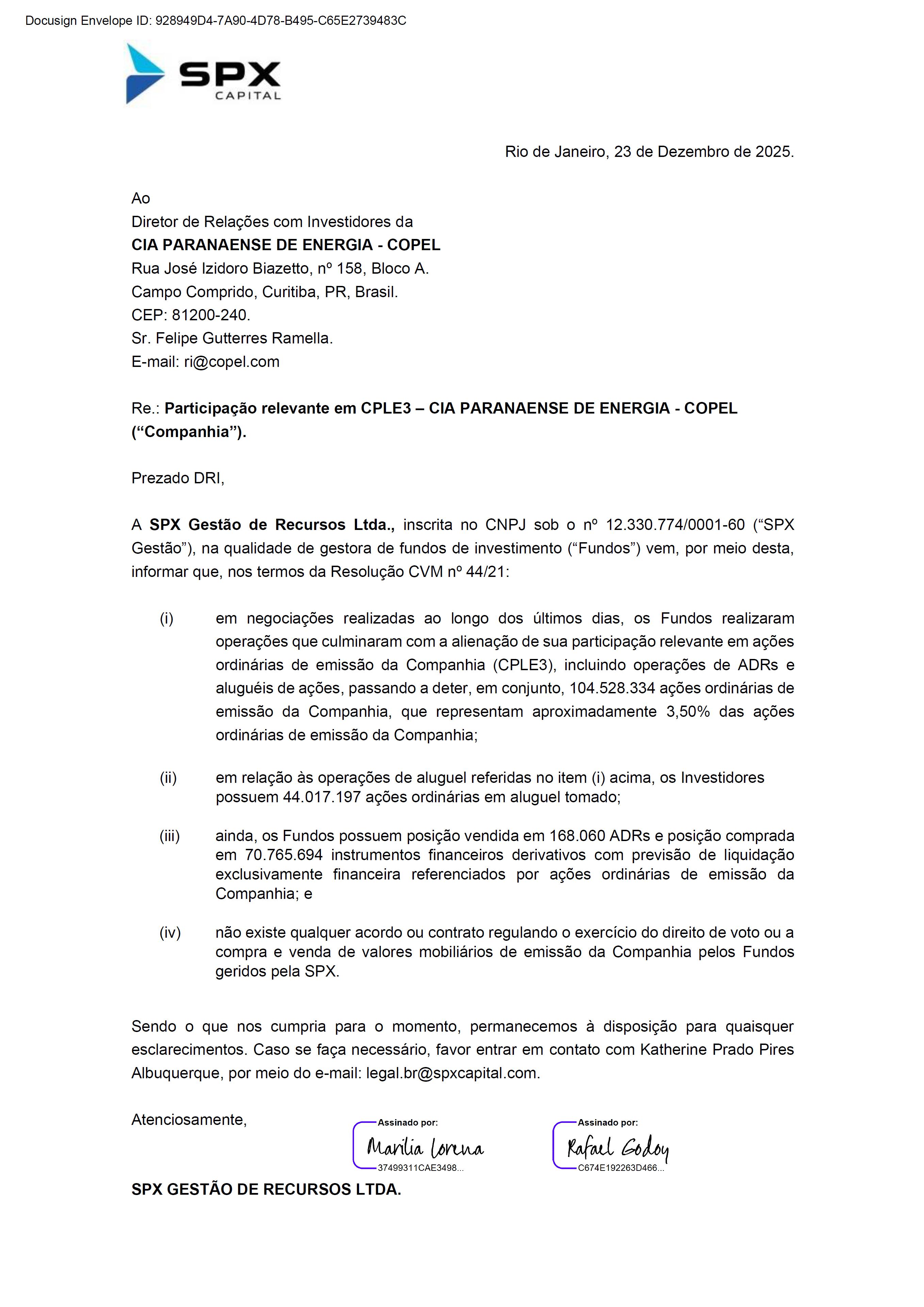 Rio de Janeiro, 23 de Dezembro de 2025. Ao Diretor de Relações com Investidores da CIA PARANAENSE DE ENERGIA - COPEL Rua José Izidoro Biazetto, nº 158, Bloco A. Campo Comprido, Curitiba, PR, Brasil. CEP: 81200-240. Sr. Felipe Gutterres Ramella. E-mail: ri@copel.com Re.: Participação relevante em CPLE3 – CIA PARANAENSE DE ENERGIA - COPEL (“Companhia”). Prezado DRI, A SPX Gestão de Recursos Ltda., inscrita no CNPJ sob o nº 12.330.774/0001-60 (“SPX Gestão”), na qualidade de gestora de fundos de investimento (“Fundos”) vem, por meio desta, informar que, nos termos da Resolução CVM nº 44/21: (i) em negociações realizadas ao longo dos últimos dias, os Fundos realizaram operações que culminaram com a alienação de sua participação relevante em ações ordinárias de emissão da Companhia (CPLE3), incluindo operações de ADRs e aluguéis de ações, passando a deter, em conjunto, 104.528.334 ações ordinárias de emissão da Companhia, que representam aproximadamente 3,50% das ações ordinárias de emissão da Companhia; (ii) em relação às operações de aluguel referidas no item (i) acima, os Investidores possuem 44.017.197 ações ordinárias em aluguel tomado; (iii) ainda, os Fundos possuem posição vendida em 168.060 ADRs e posição comprada em 70.765.694 instrumentos financeiros derivativos com previsão de liquidação exclusivamente financeira referenciados por ações ordinárias de emissão da Companhia; e (iv) não existe qualquer acordo ou contrato regulando o exercício do direito de voto ou a compra e venda de valores mobiliários de emissão da Companhia pelos Fundos geridos pela SPX. Sendo o que nos cumpria para o momento, permanecemos à disposição para quaisquer esclarecimentos. Caso se faça necessário, favor entrar em contato com Katherine Prado Pires Albuquerque, por meio do e-mail: legal.br@spxcapital.com. Atenciosamente, SPX GESTÃO DE RECURSOS LTDA. Docusign Envelope ID: 928949D4-7A90-4D78-B495-C65E2739483C Pursuant to the requirements of the Securities Exchange Act of 1934, the registrant has duly caused this report to be signed on its behalf by the undersigned, thereunto duly authorized.