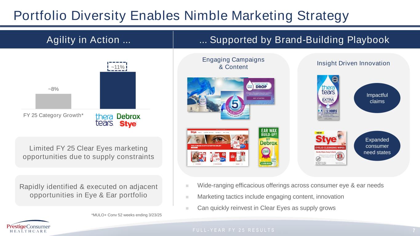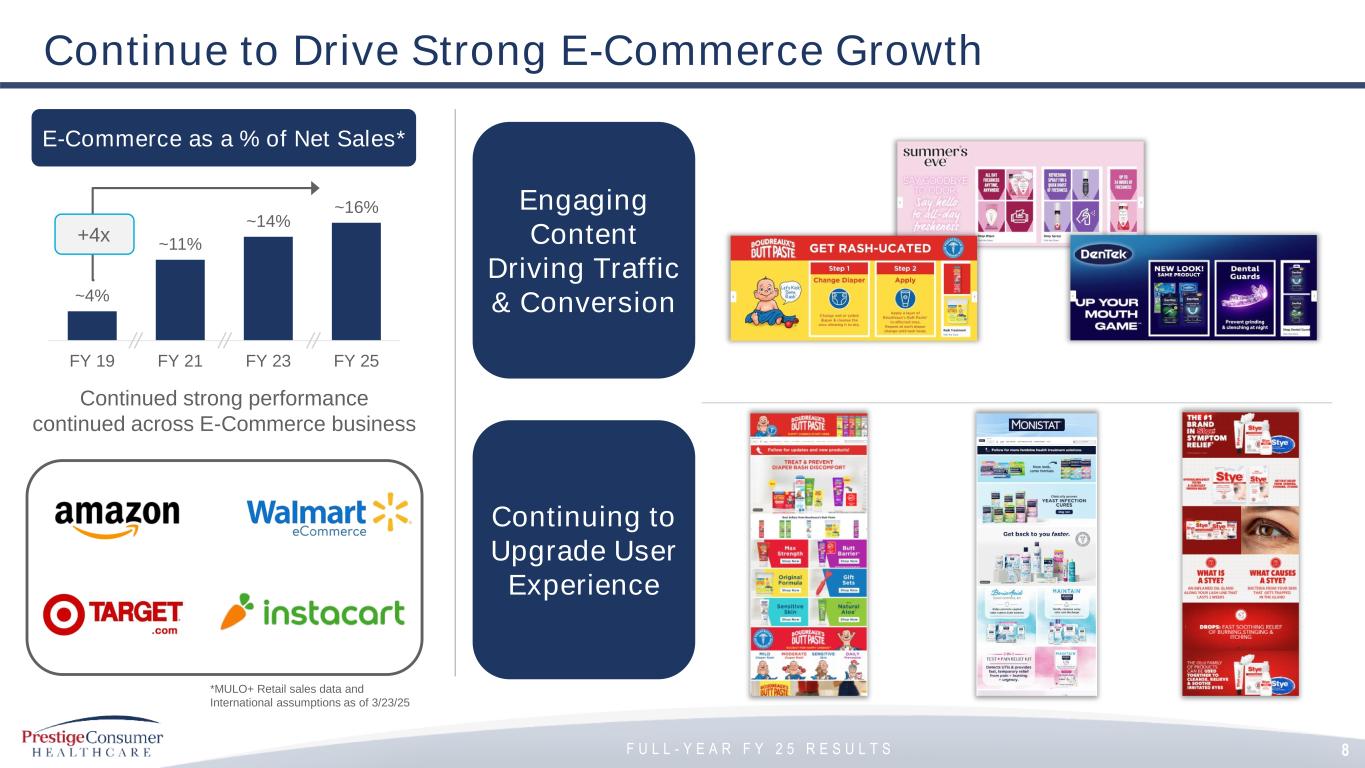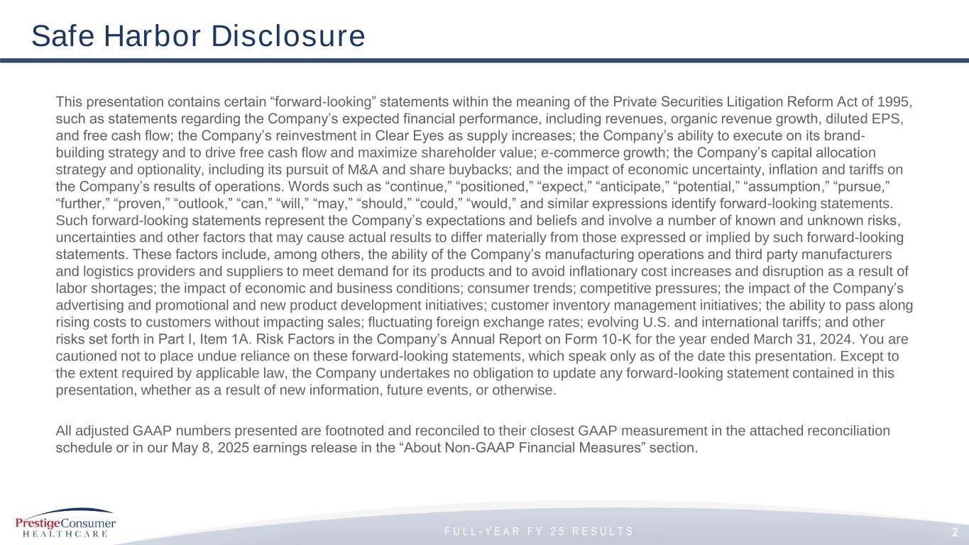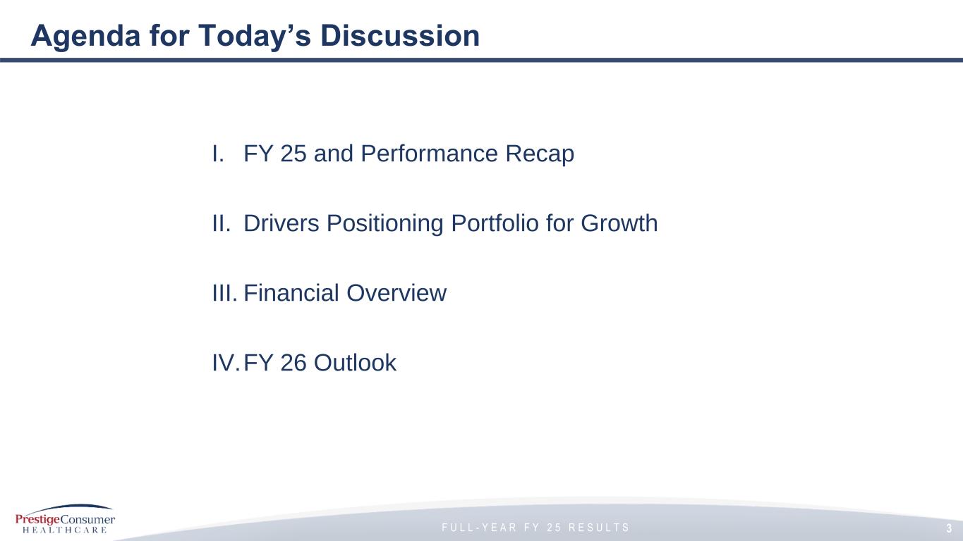 当社は、本日2025年5月8日午前8時30分(米国東部時間)より、第4四半期および2025会計年度の業績に関する電話会議を開催いたします。インターネットによるライブ中継、電話会議に伴うスライド・プレゼンテーション、アーカイブ再生は、いずれも当社ウェブサイトの投資家向け情報ページ(http://www.prestigeconsumerhealthcare.com/)からアクセスできます。電話による電話会議に参加するには、こちらから登録し、ダイヤルインの詳細と固有のピンを入手してください。必須ではありませんが、開始10分前までに参加されることをお勧めします。スライド・プレゼンテーションは、当社ウェブサイトの投資家情報ページからウェブキャストとプレゼンテーションをクリックしてアクセスできます。